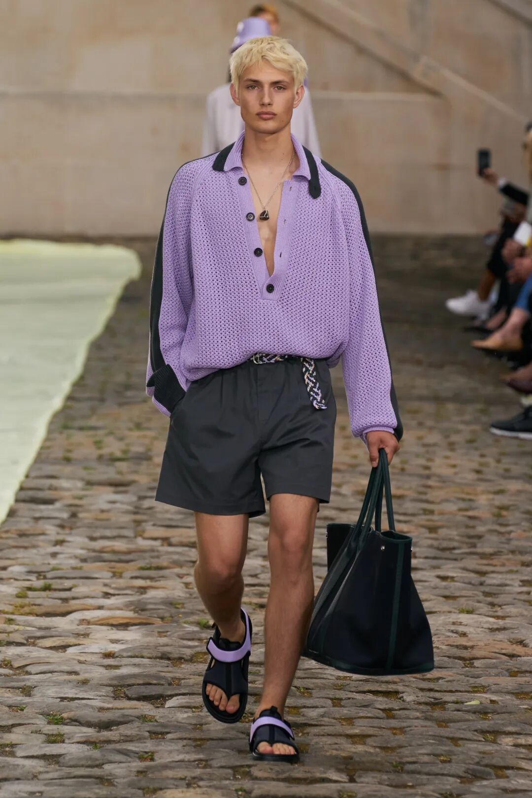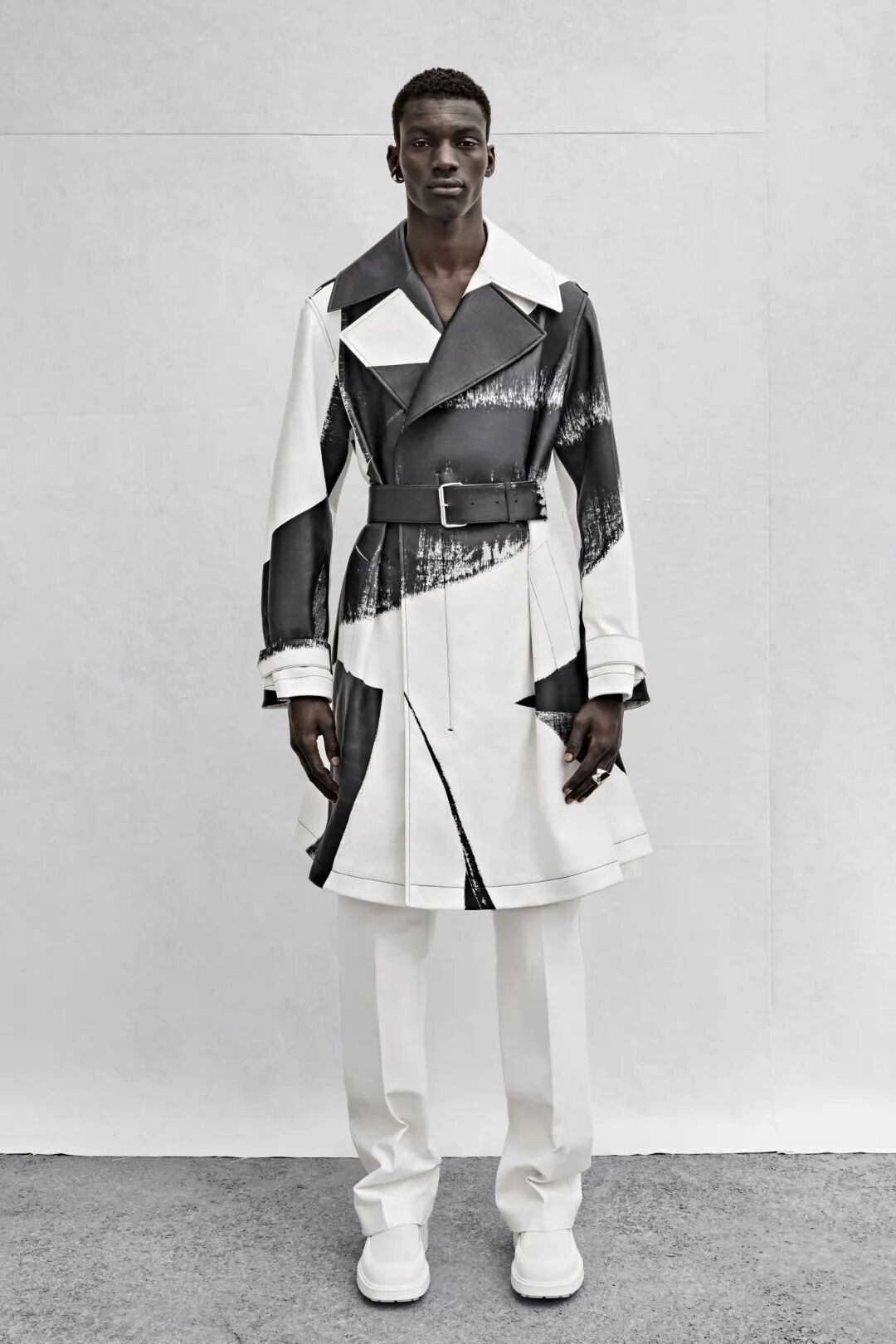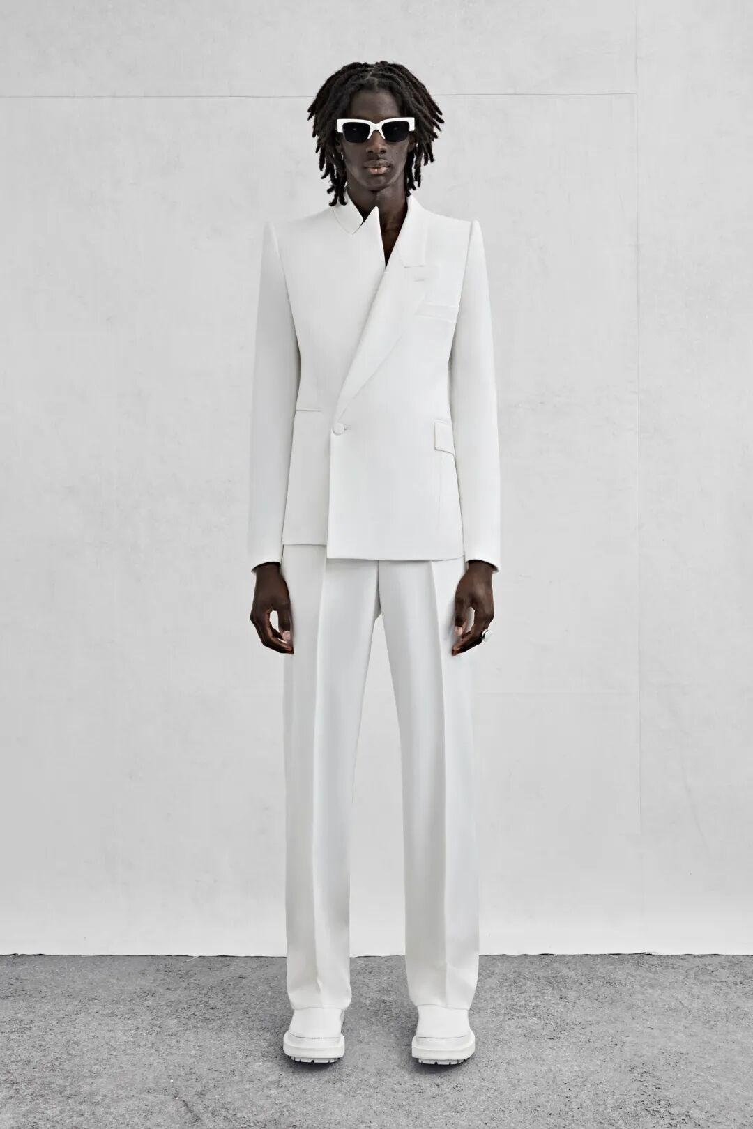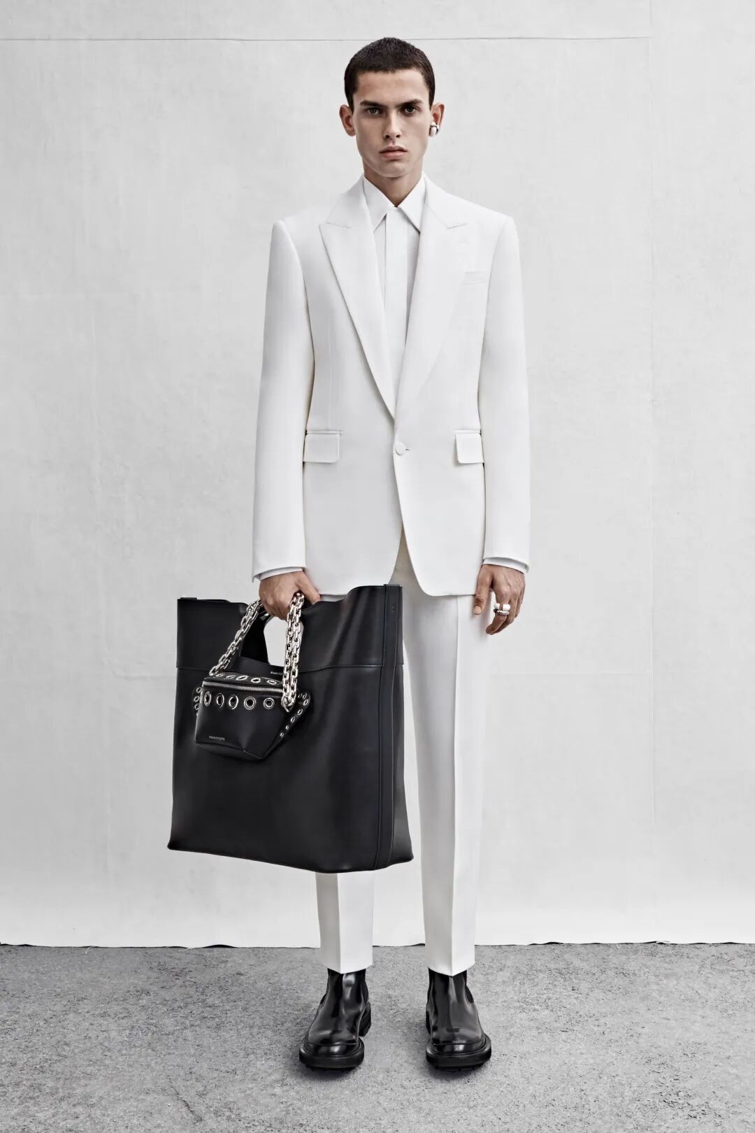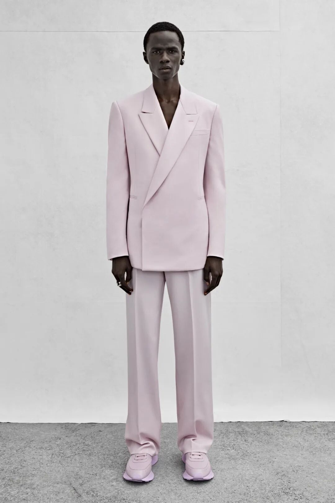 Alexander McQueen 2023春夏男装系列,大量运用令人浮想联翩的柔和色系,如浅灰蓝、粉紫色、雾粉色、象牙白。款式细节设计上运用了双排扣设计、镂空剪裁、印花、刺绣,并且同时将皮革与衬衫、短裤、阔腿裤进行混搭。针织衫同样采用镂空设计,彰显前卫。精致优雅但个性十足,春夏套装的解构与重塑,满足男性对于设计干净利落的正装需求。