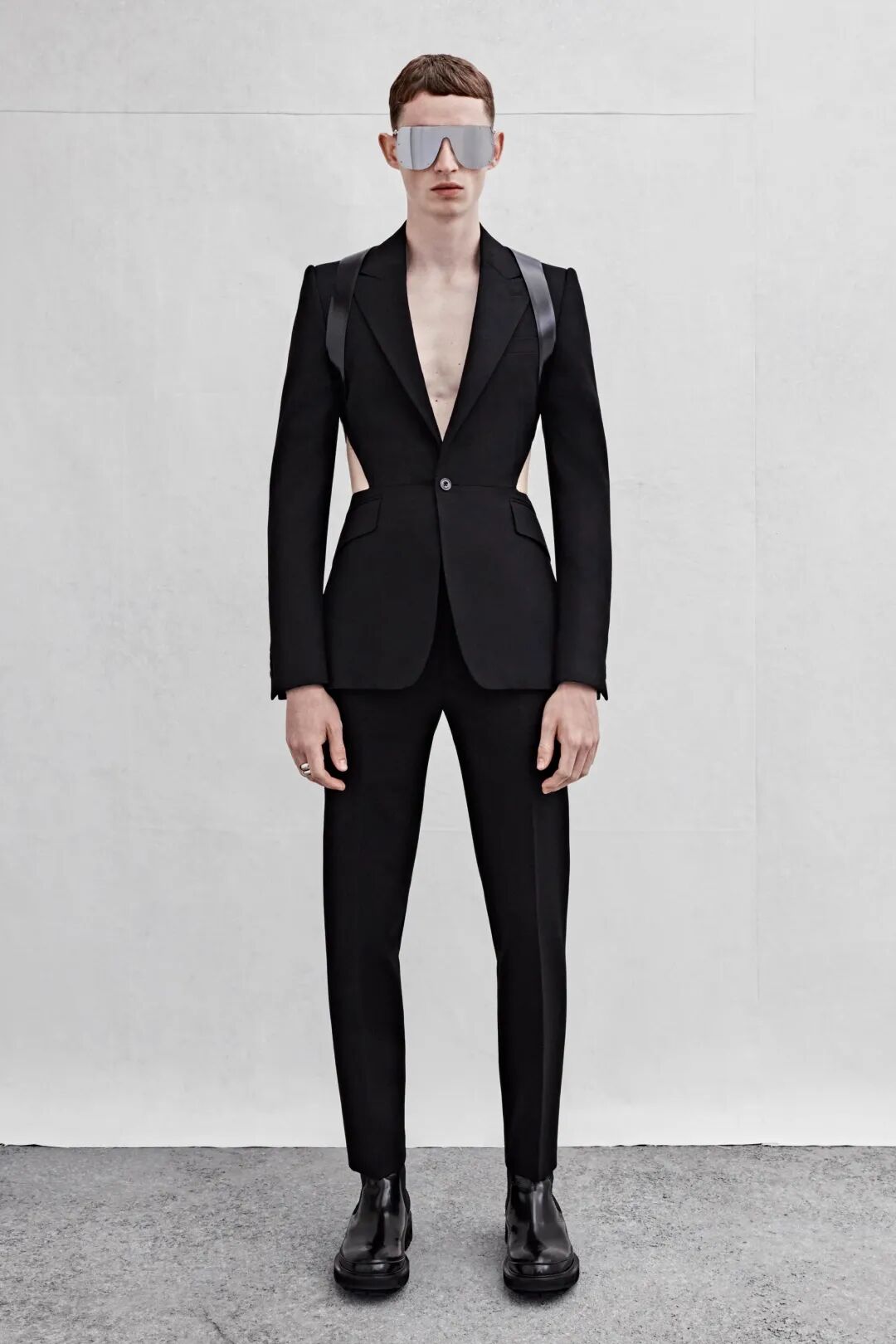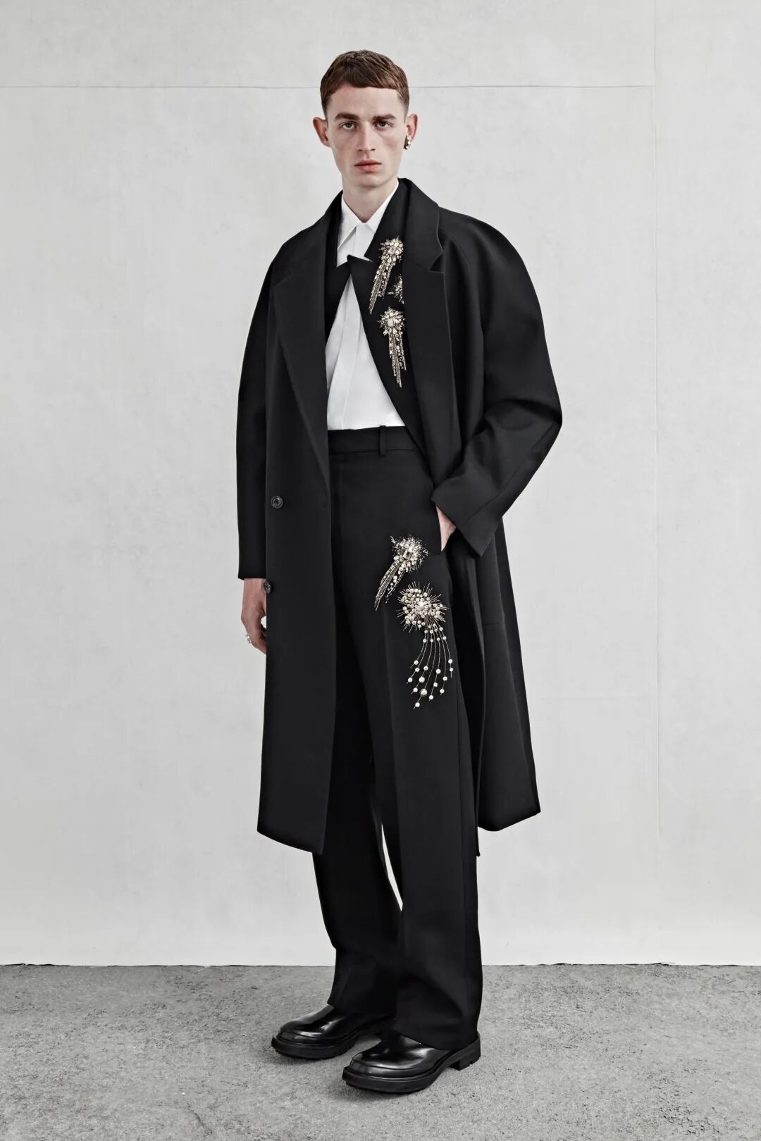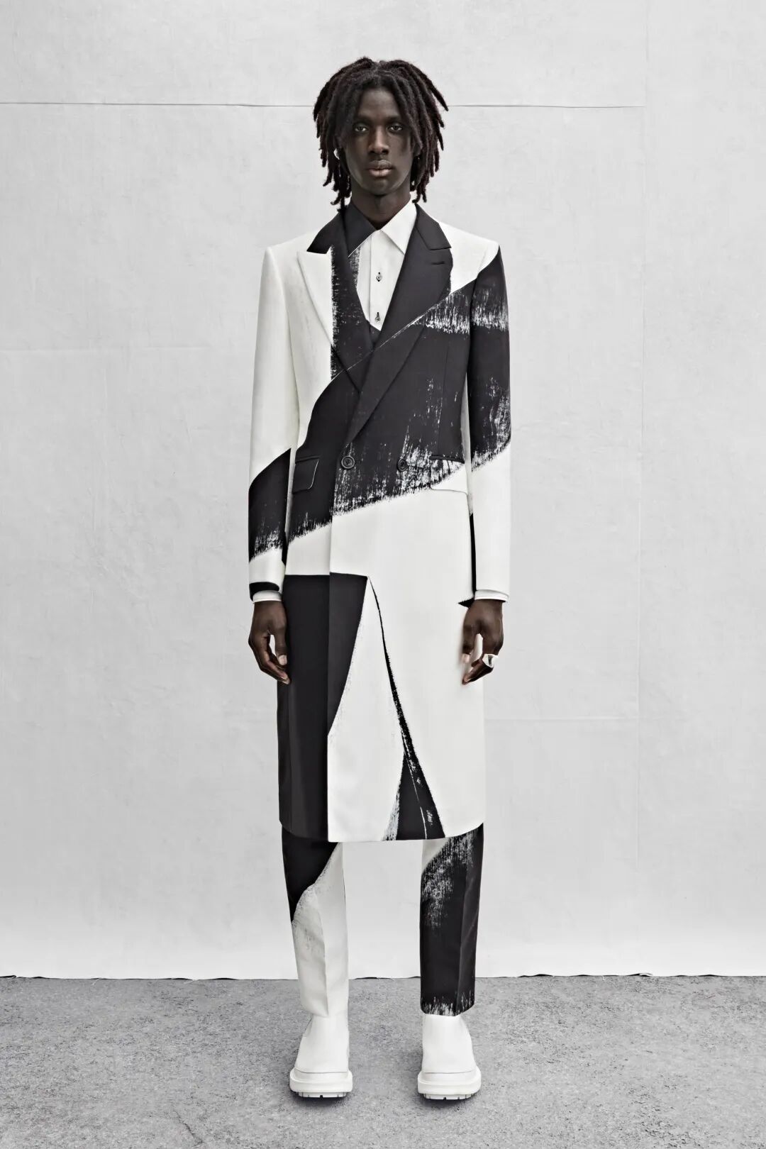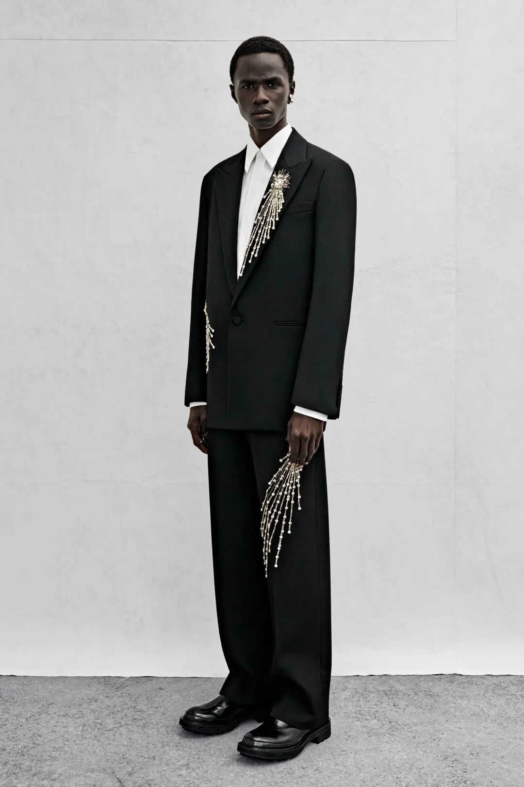 Alexander McQueen 2023春夏男装系列,大量运用令人浮想联翩的柔和色系,如浅灰蓝、粉紫色、雾粉色、象牙白。款式细节设计上运用了双排扣设计、镂空剪裁、印花、刺绣,并且同时将皮革与衬衫、短裤、阔腿裤进行混搭。针织衫同样采用镂空设计,彰显前卫。精致优雅但个性十足,春夏套装的解构与重塑,满足男性对于设计干净利落的正装需求。