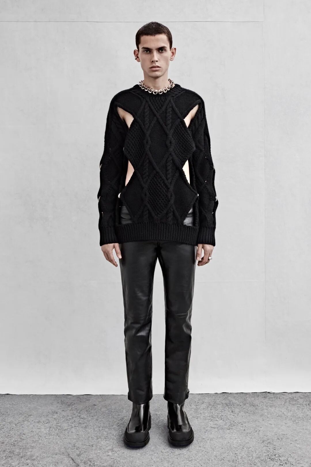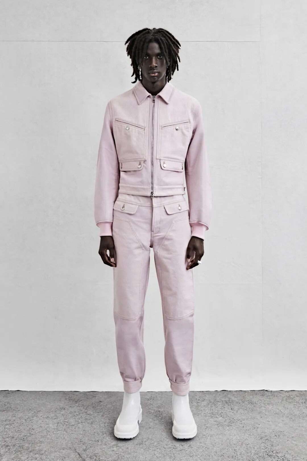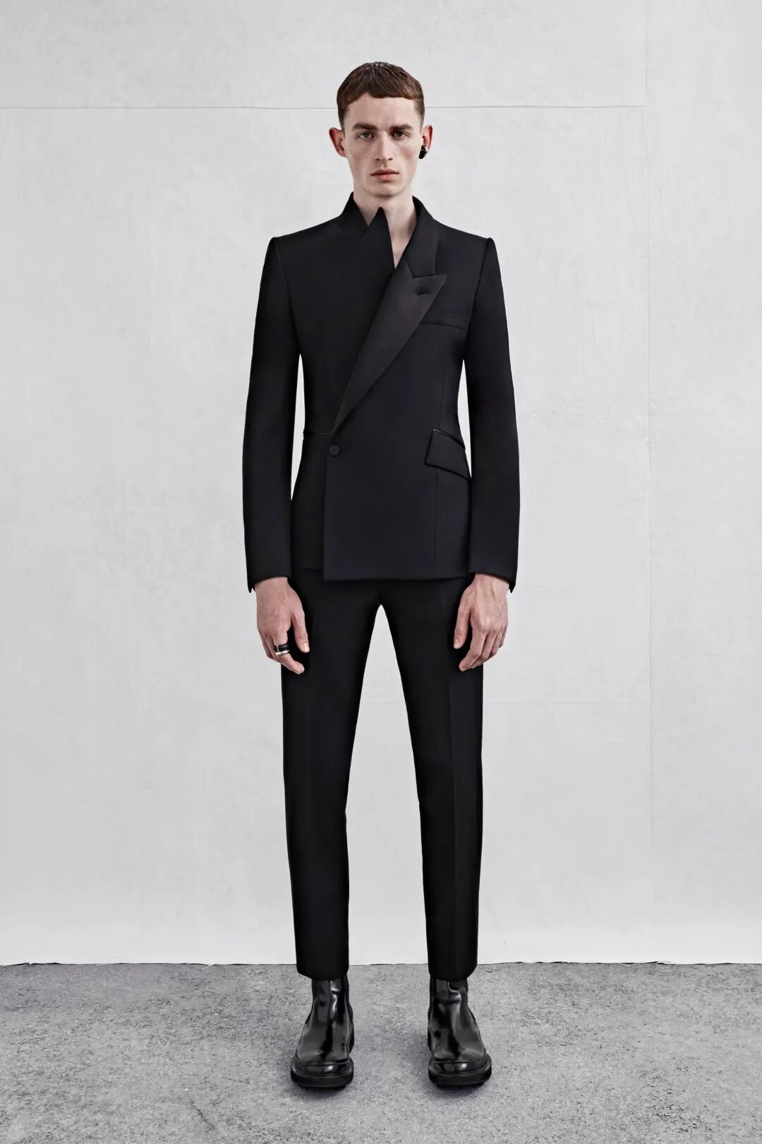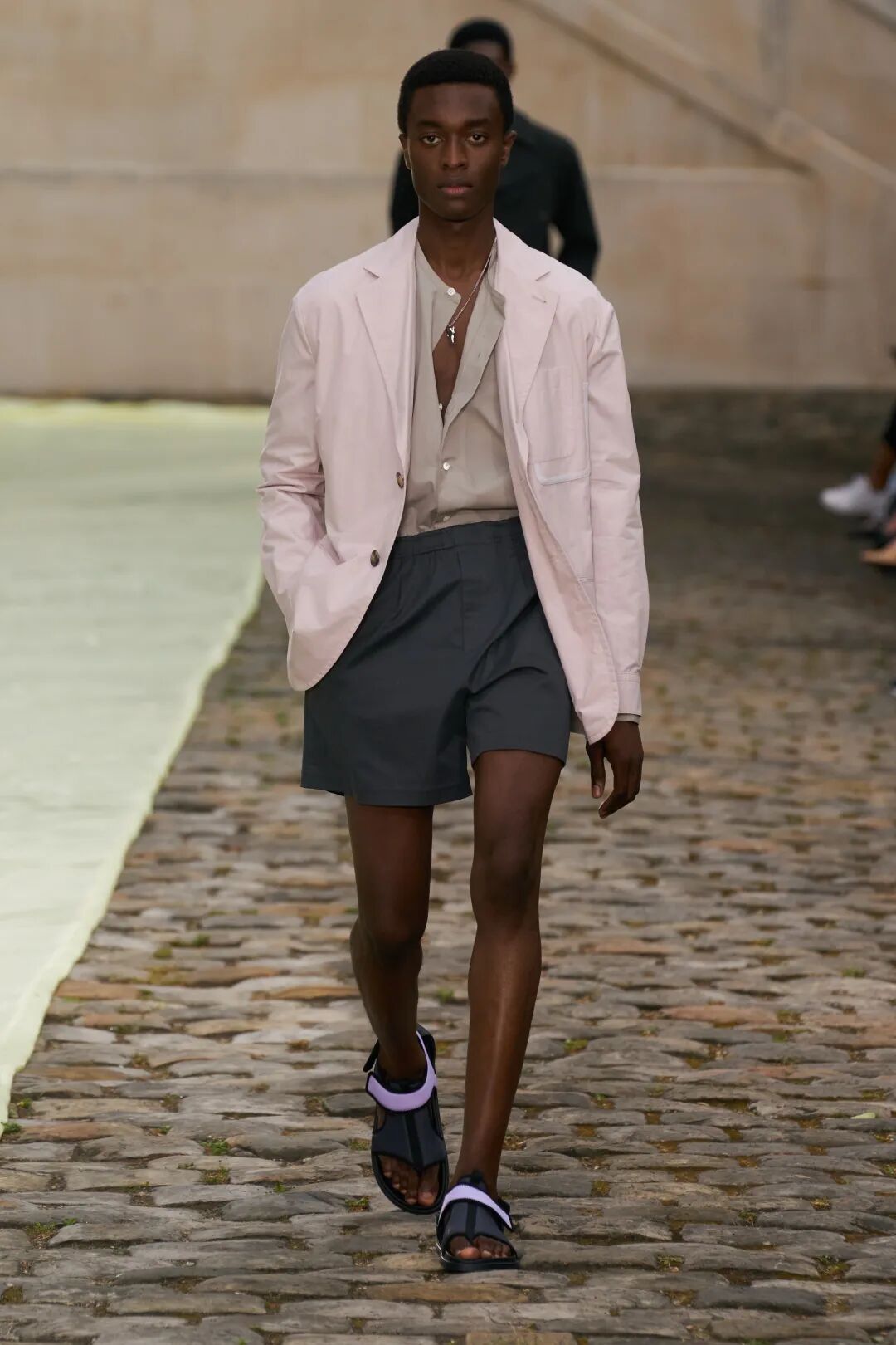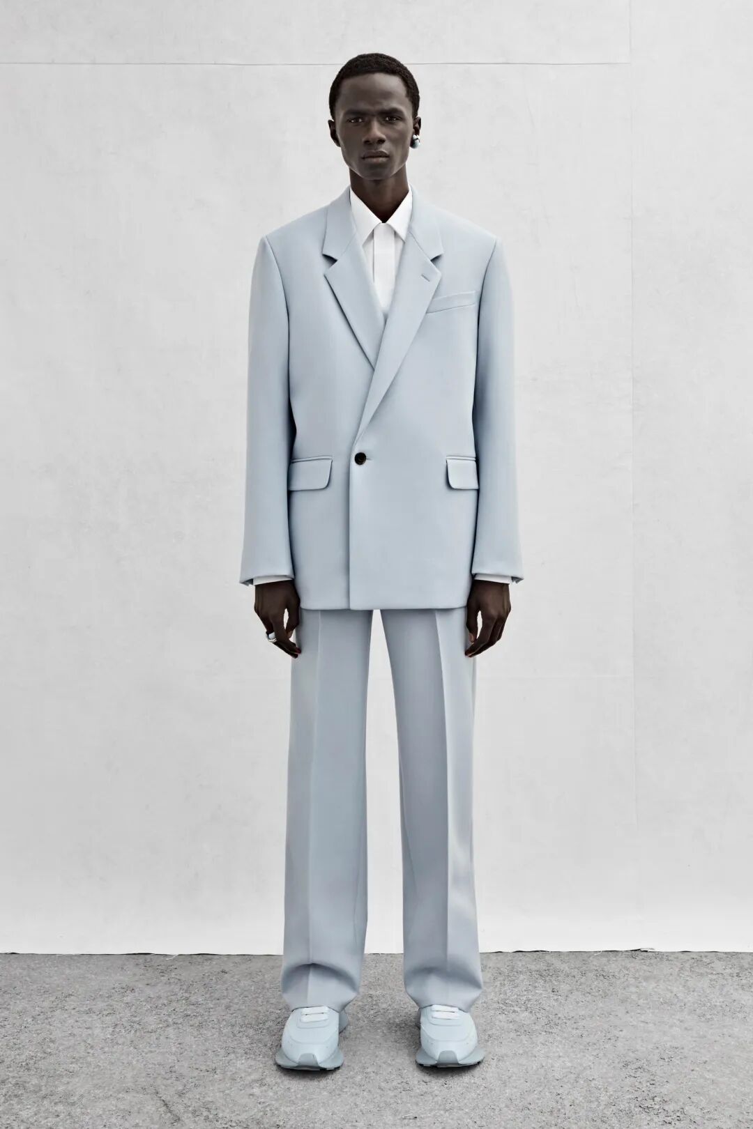 Alexander McQueen 2023春夏男装系列,大量运用令人浮想联翩的柔和色系,如浅灰蓝、粉紫色、雾粉色、象牙白。款式细节设计上运用了双排扣设计、镂空剪裁、印花、刺绣,并且同时将皮革与衬衫、短裤、阔腿裤进行混搭。针织衫同样采用镂空设计,彰显前卫。精致优雅但个性十足,春夏套装的解构与重塑,满足男性对于设计干净利落的正装需求。