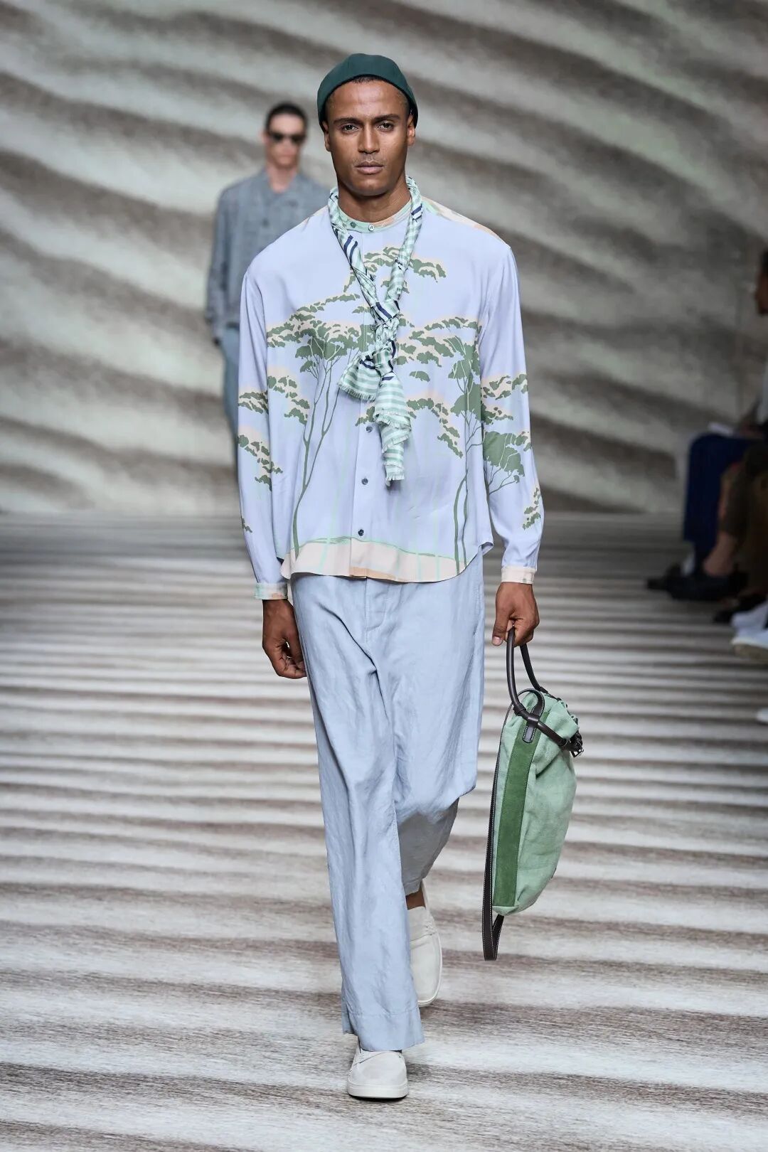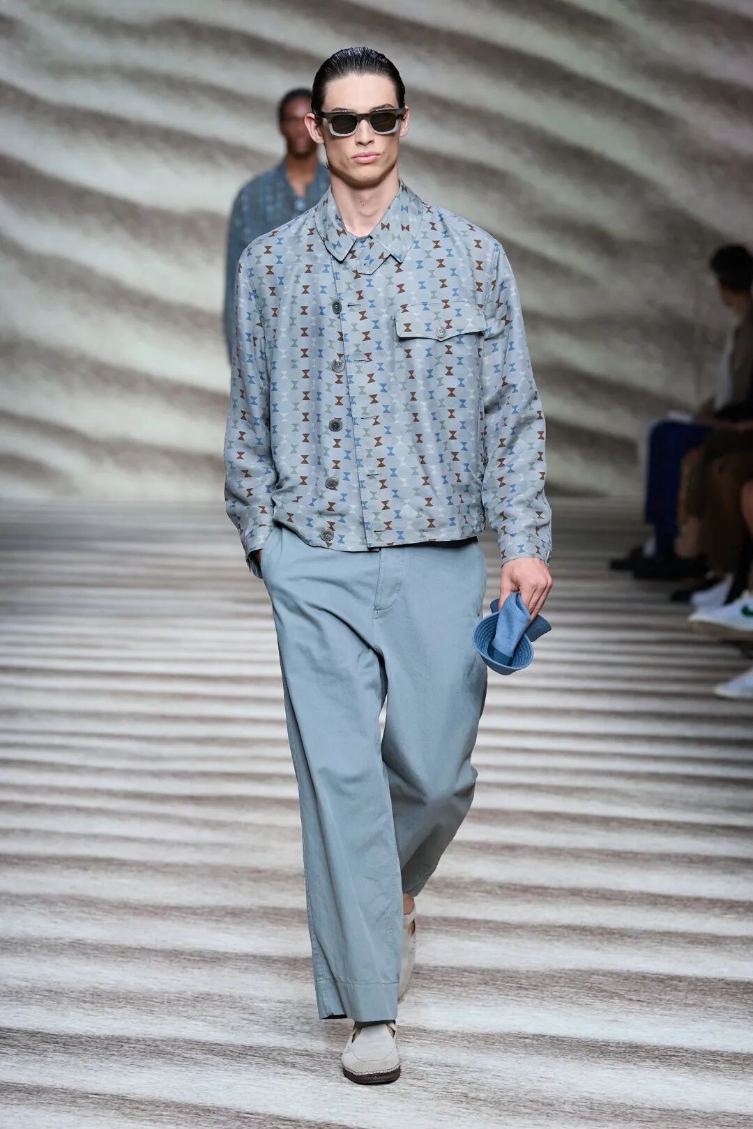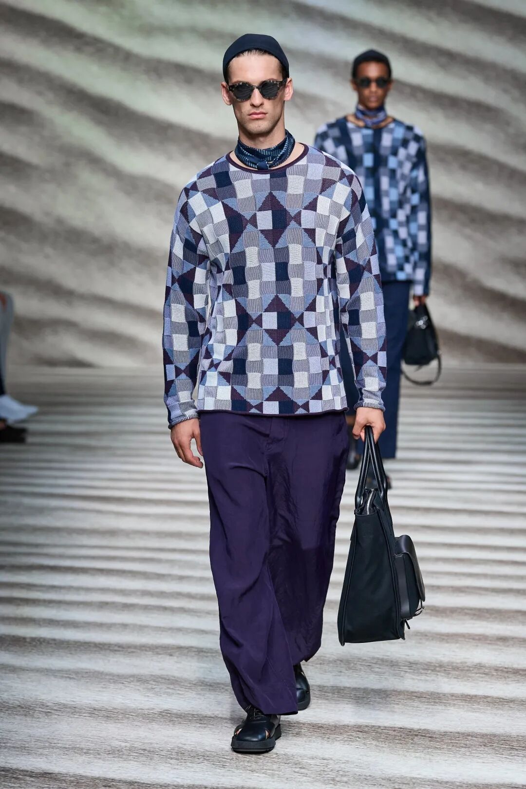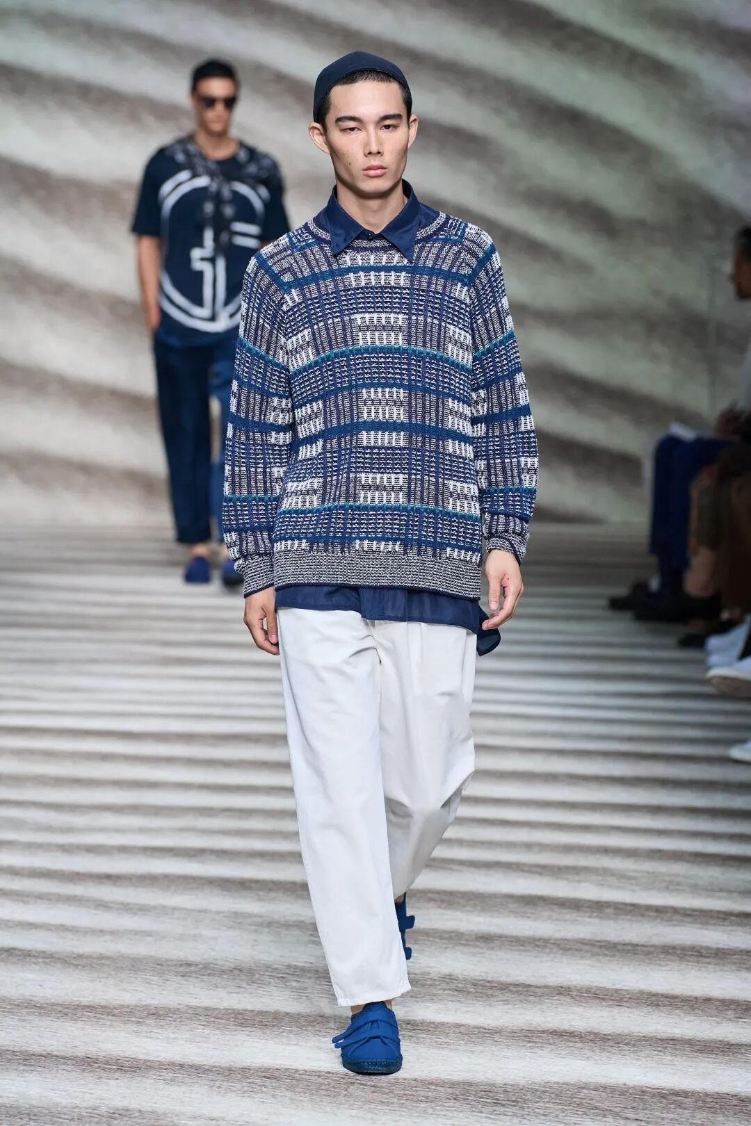 设计师摒弃了传统意义上的男性气质,在男装的刚与柔中把握平衡韧性。宽大的衬衫、披肩和亚麻质感让系列增添了轻盈休闲的气息。针织衫的设计融入了现代主义风格,几何感的纹样仿佛沙海的纹路,简约而优雅。