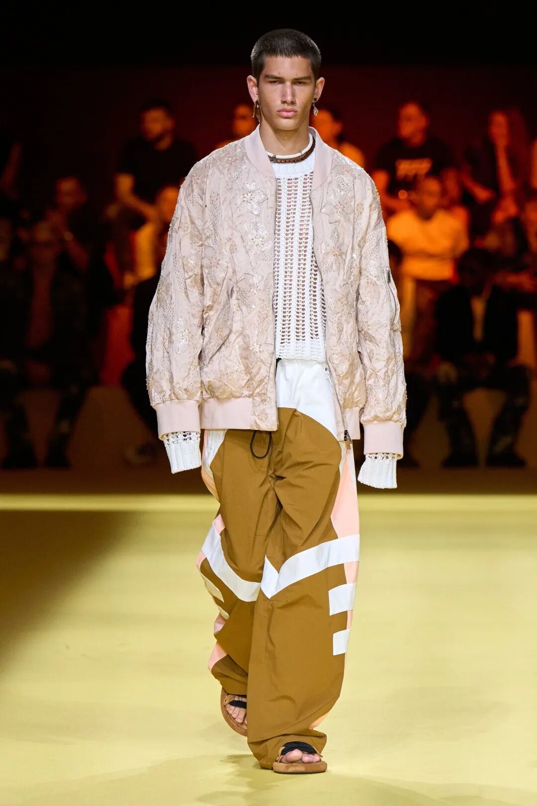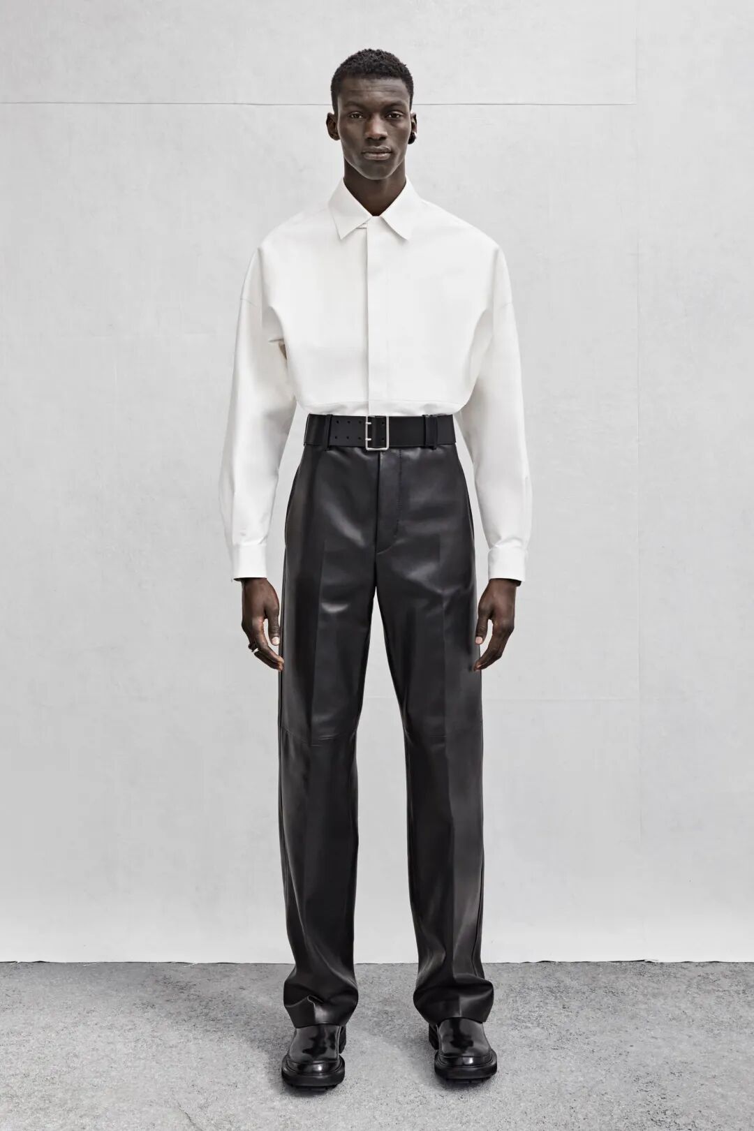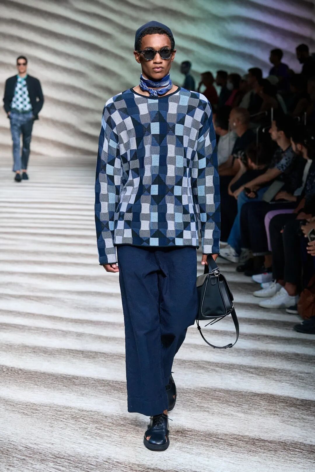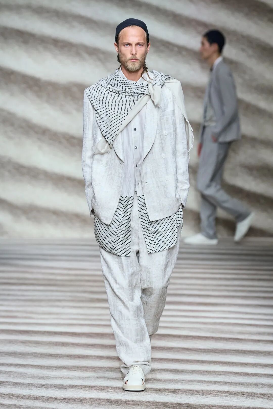 设计师摒弃了传统意义上的男性气质,在男装的刚与柔中把握平衡韧性。宽大的衬衫、披肩和亚麻质感让系列增添了轻盈休闲的气息。针织衫的设计融入了现代主义风格,几何感的纹样仿佛沙海的纹路,简约而优雅。