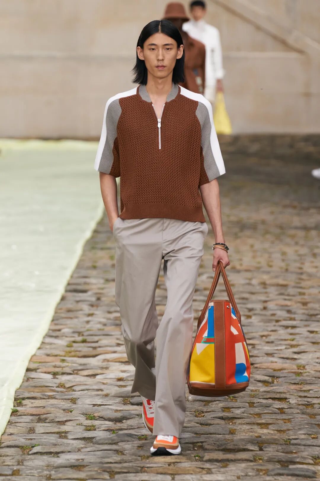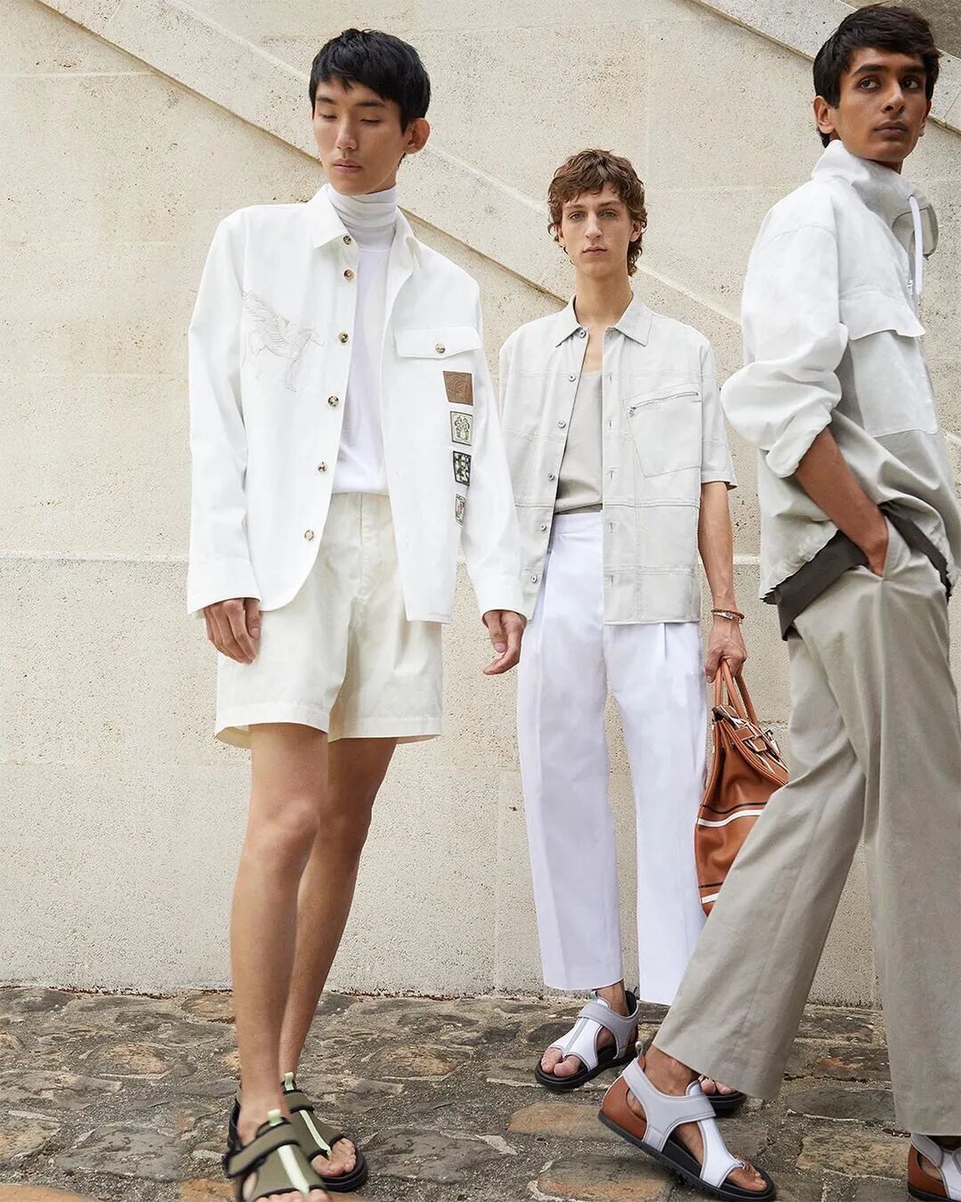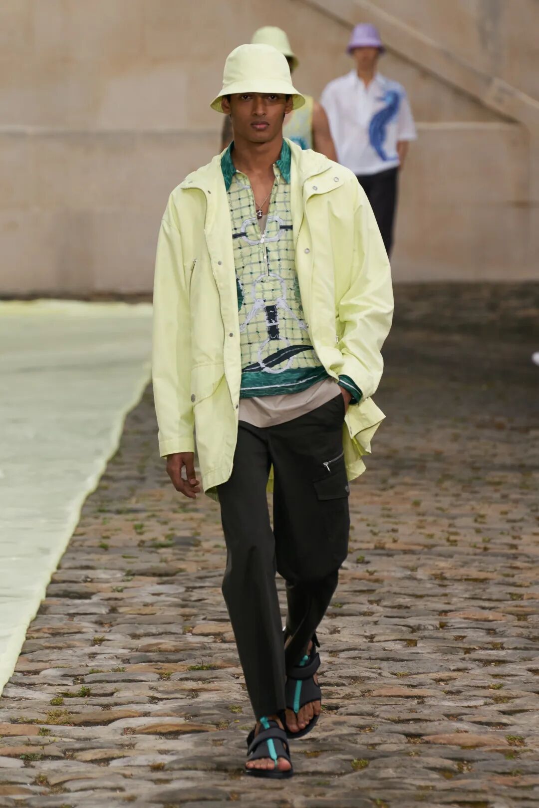 爱马仕的2023春夏男装系列以“自然主义”和“实用主义”为主题关键词,整体呈现简约与实穿功能。使用了承载甜美与诗意的服装色彩,例如,柠檬色、咖啡色、香瓜色等,大胆明快、亲近自然。面料同样运用舒适且日常实用的材质,比如帆布、小羊皮、密织绉纱棉,以自由而严谨的剪裁打造出自由的夏日感。
