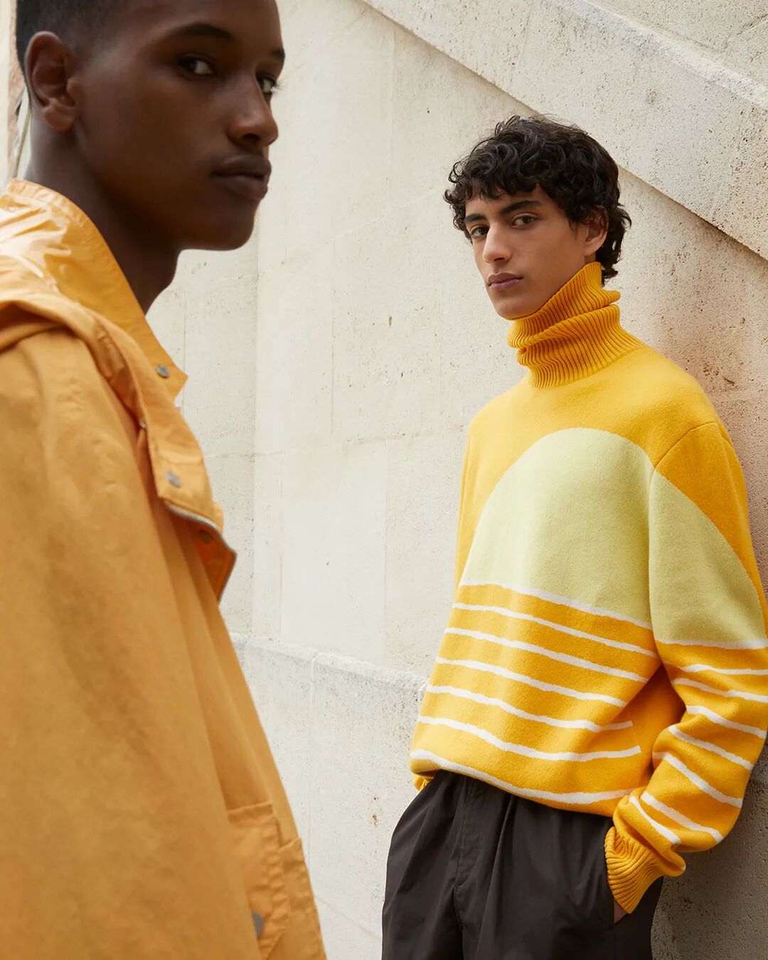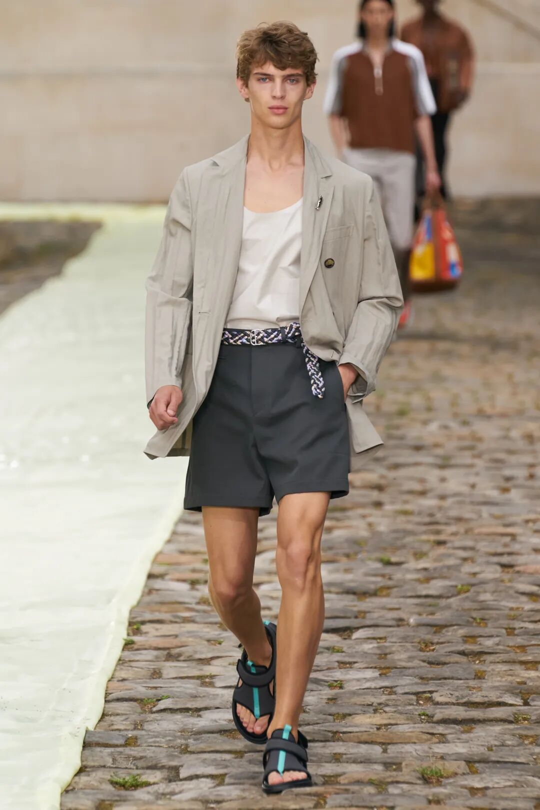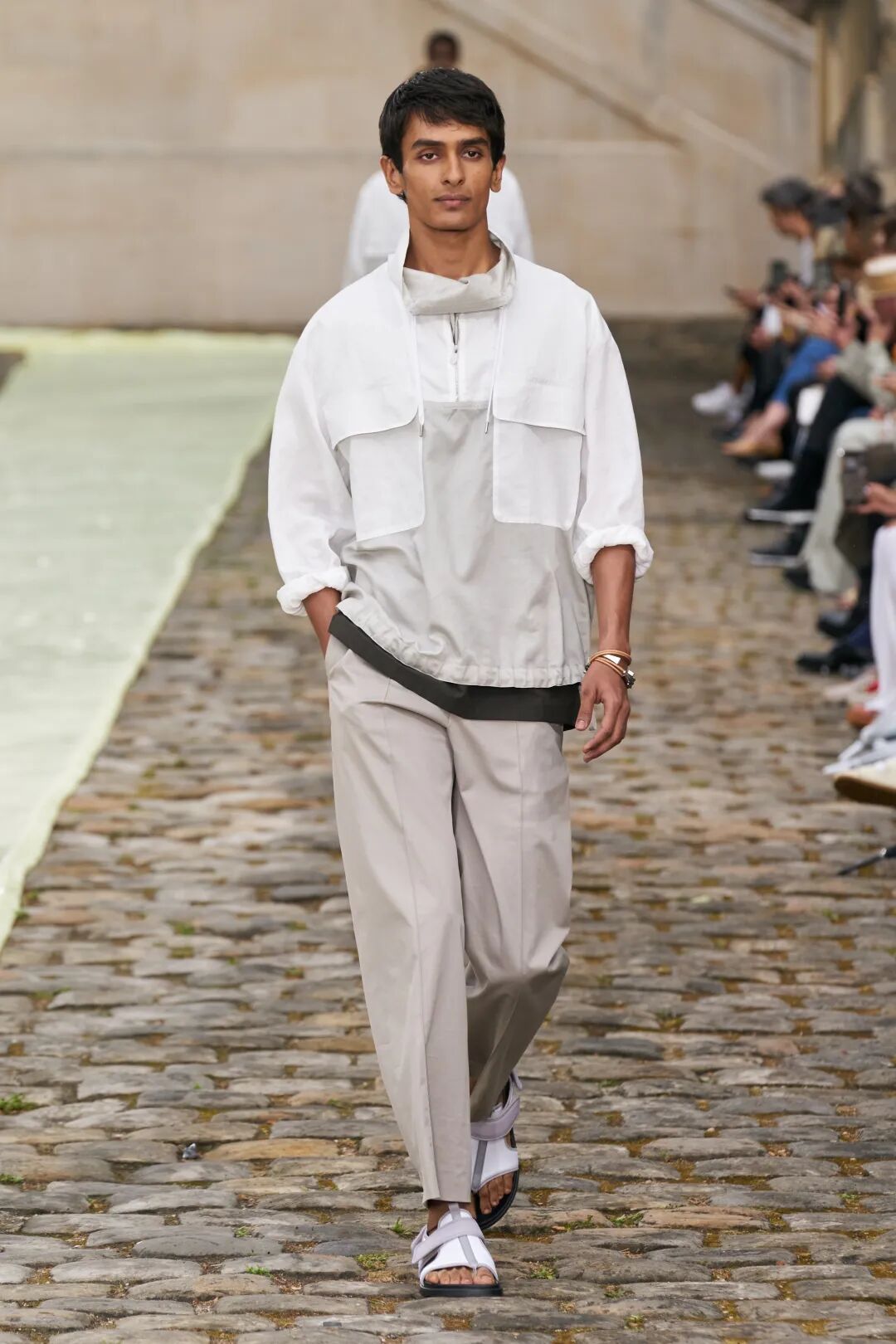 爱马仕的2023春夏男装系列以“自然主义”和“实用主义”为主题关键词,整体呈现简约与实穿功能。使用了承载甜美与诗意的服装色彩,例如,柠檬色、咖啡色、香瓜色等,大胆明快、亲近自然。面料同样运用舒适且日常实用的材质,比如帆布、小羊皮、密织绉纱棉,以自由而严谨的剪裁打造出自由的夏日感。