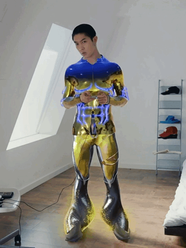 丁洁设计的虚拟时装造型充满未来感,会自动变幻色彩,