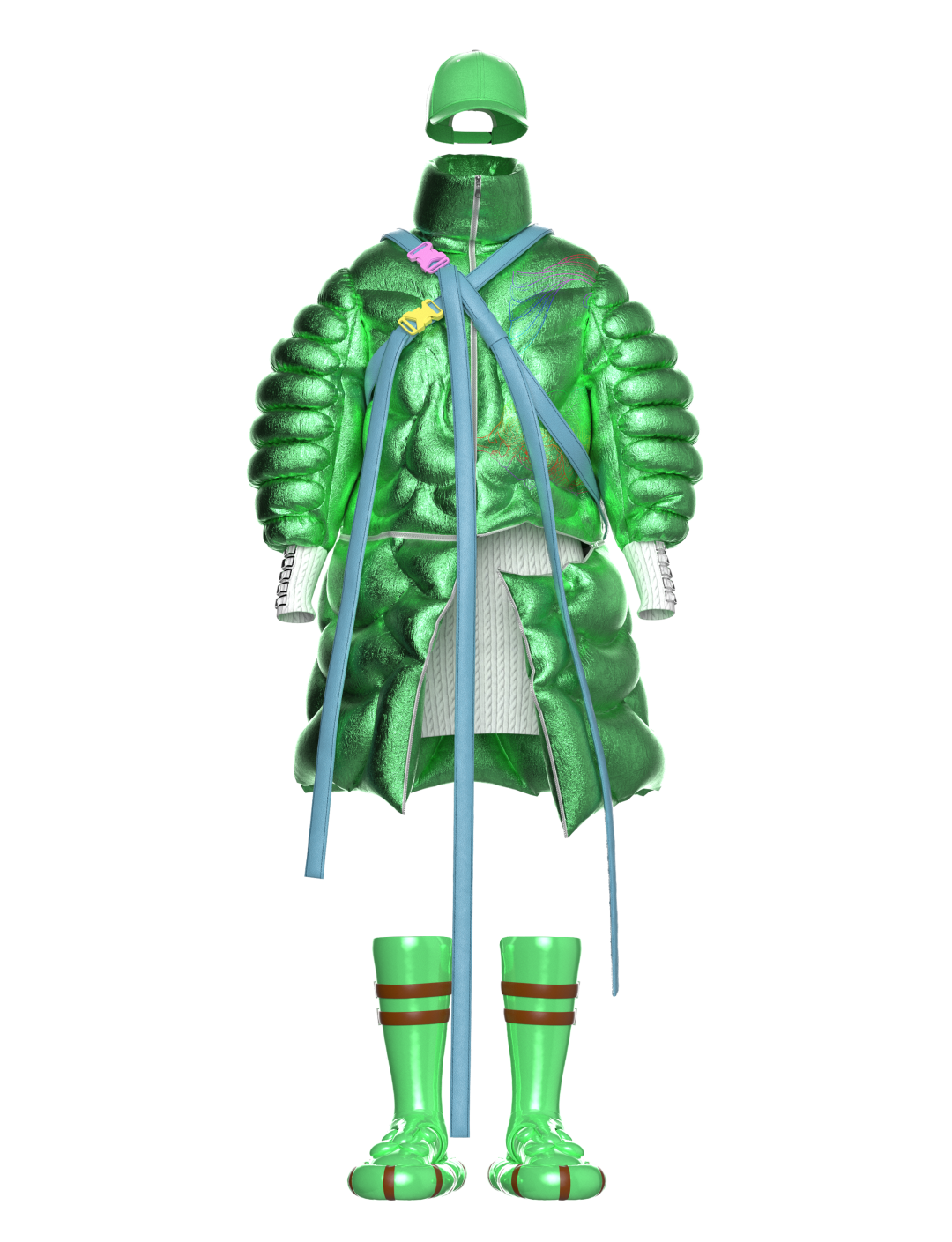 UV-朱的作品风格鲜明,颜色对撞冲突明显,对服装形态、材质、纹理的应用恰到好处,又不乏新元素和变种露出,他把时尚、设计、虚拟数字技术完美结合,给服装的视觉呈现带来了更多可能性。