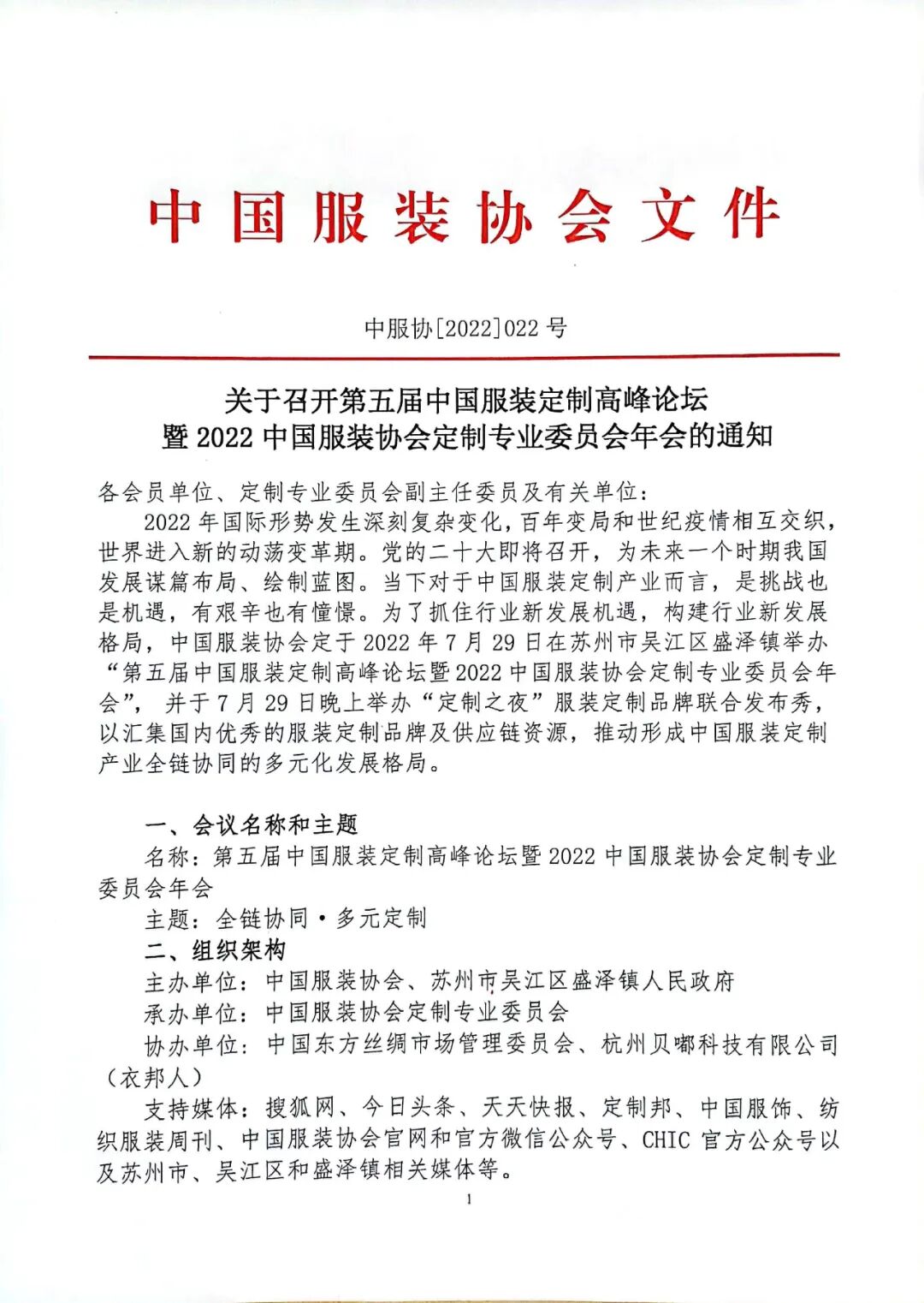 关于召开第五届中国服装定制高峰论坛暨2022中国服装协会定制专业委员会年会的通知