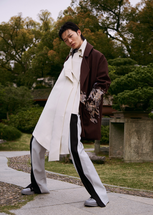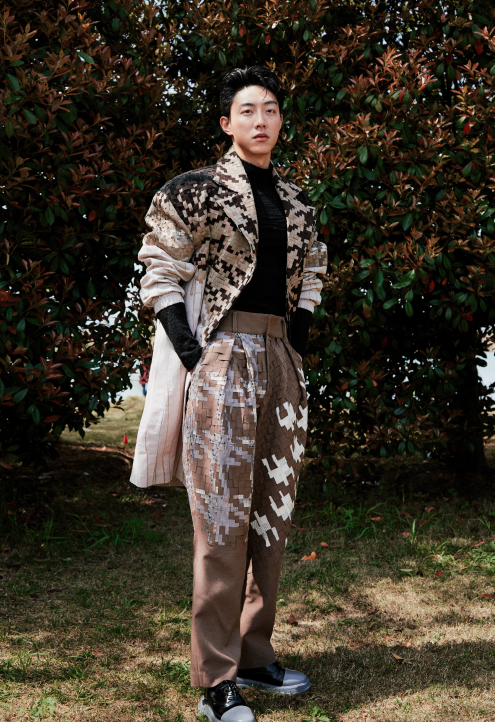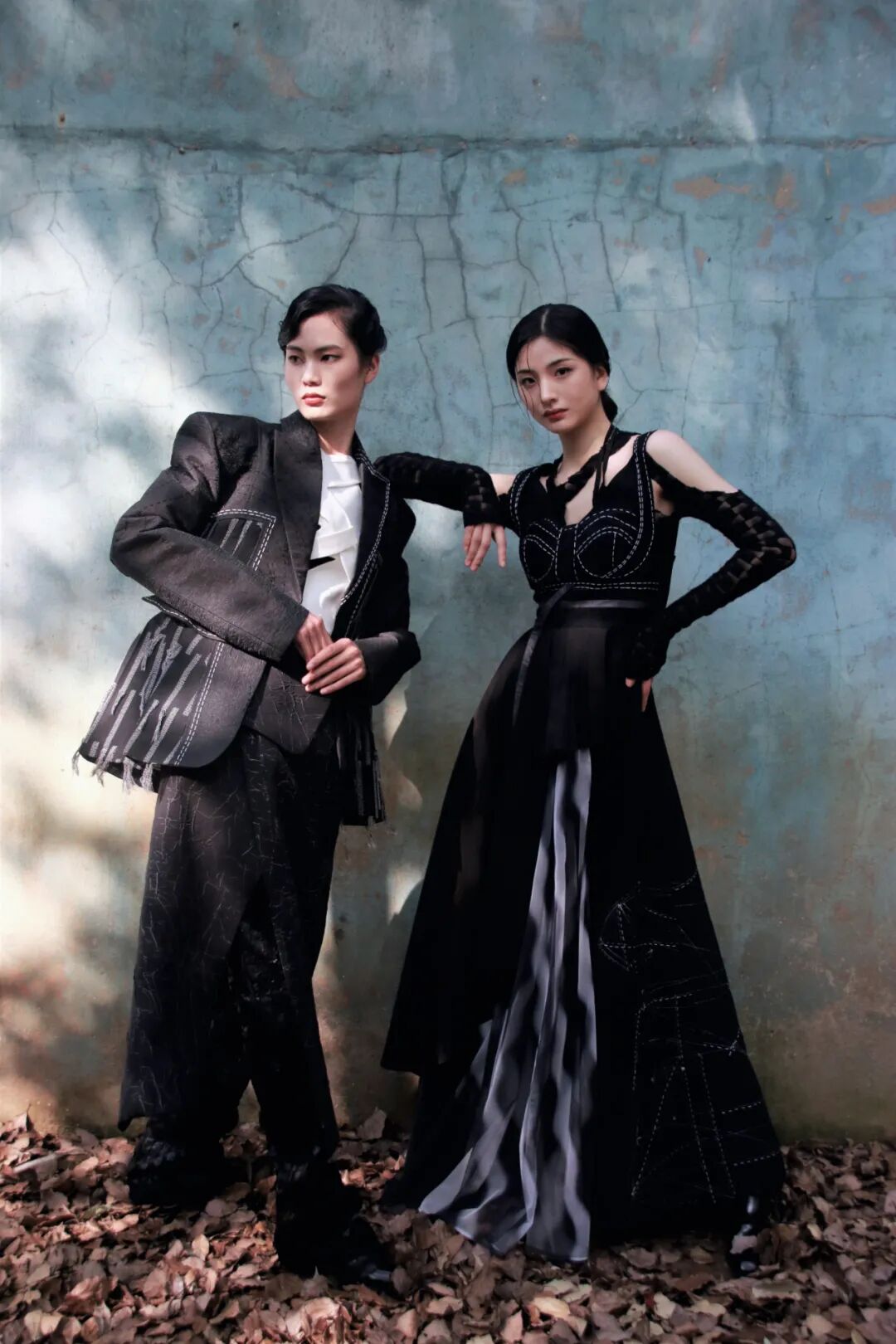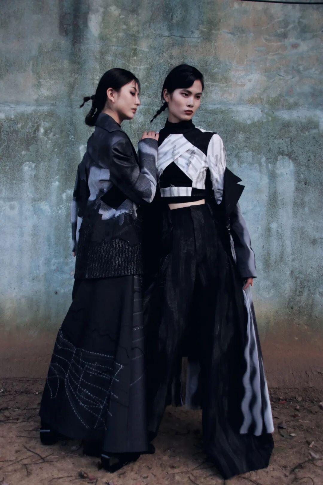第一个展示作品的场景是曲径通幽的中式走廊。在烟雨江西的氤氲氛围下,融于情景之中的设计作品一镜到底。设计师们钟情于传统手工艺,一套精细拼布作品率先出场。面料轻薄如雾如烟,跟随身体的摆动产生如诗如画的唯美意境。解构依然是他们创新的突破口,在有限的服装载体上大胆进行创意实验,一套焰火般色彩的女装闯入视线,这是设计师不灭的创作火焰。