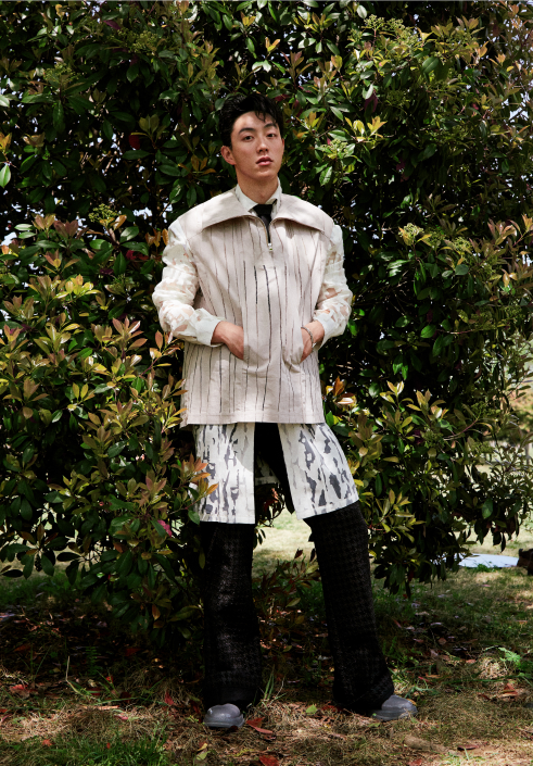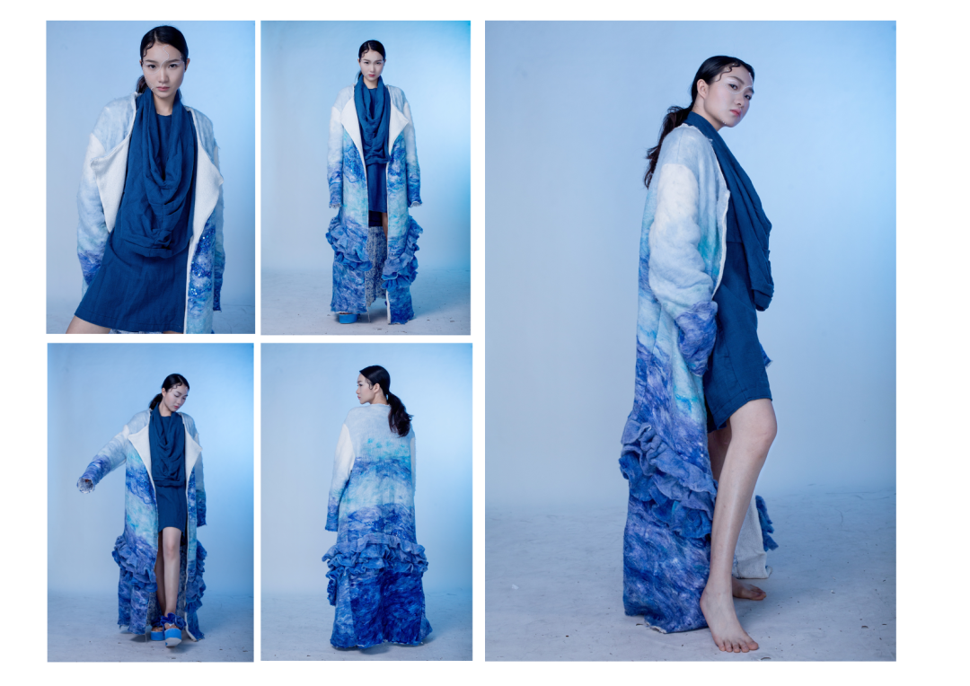 画面一转,影片来到了绿茵之上,这一组作品体现了自然之美。扎染渐变是服装中的经典设计元素,深蓝浅蓝在层层叠叠的面料上呈现舒缓的视觉效果,想必穿在身上亲肤舒适。男装廓型轻盈向上,摆脱传统男装厚重的沉闷感;童装色彩柔和,高级色调的运用在保持童真的同时又增添了一丝高雅。填充花朵元素即是孩子们的玩具,亦是整套造型的点睛之笔,用缝线制作的图案比印染工艺更加环保,反应年轻人虽身处校园但关注行业碳中和趋势的广阔视野。