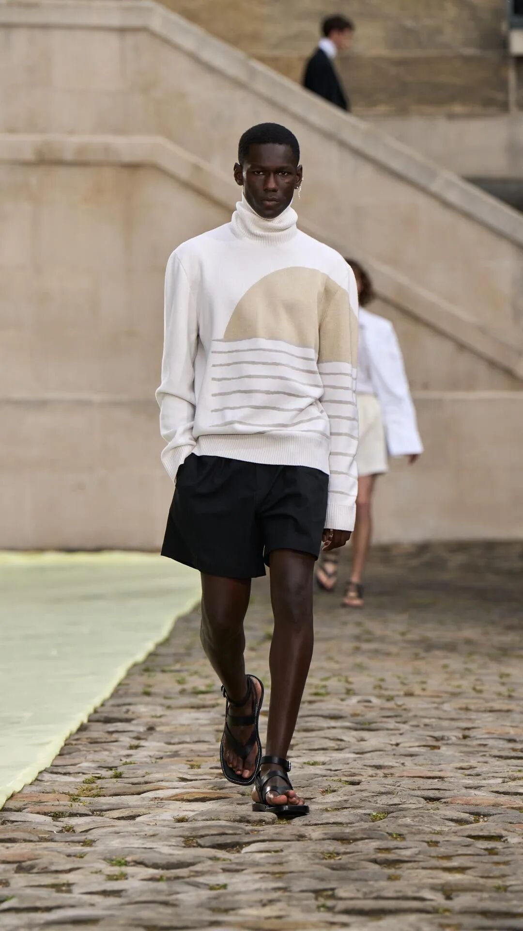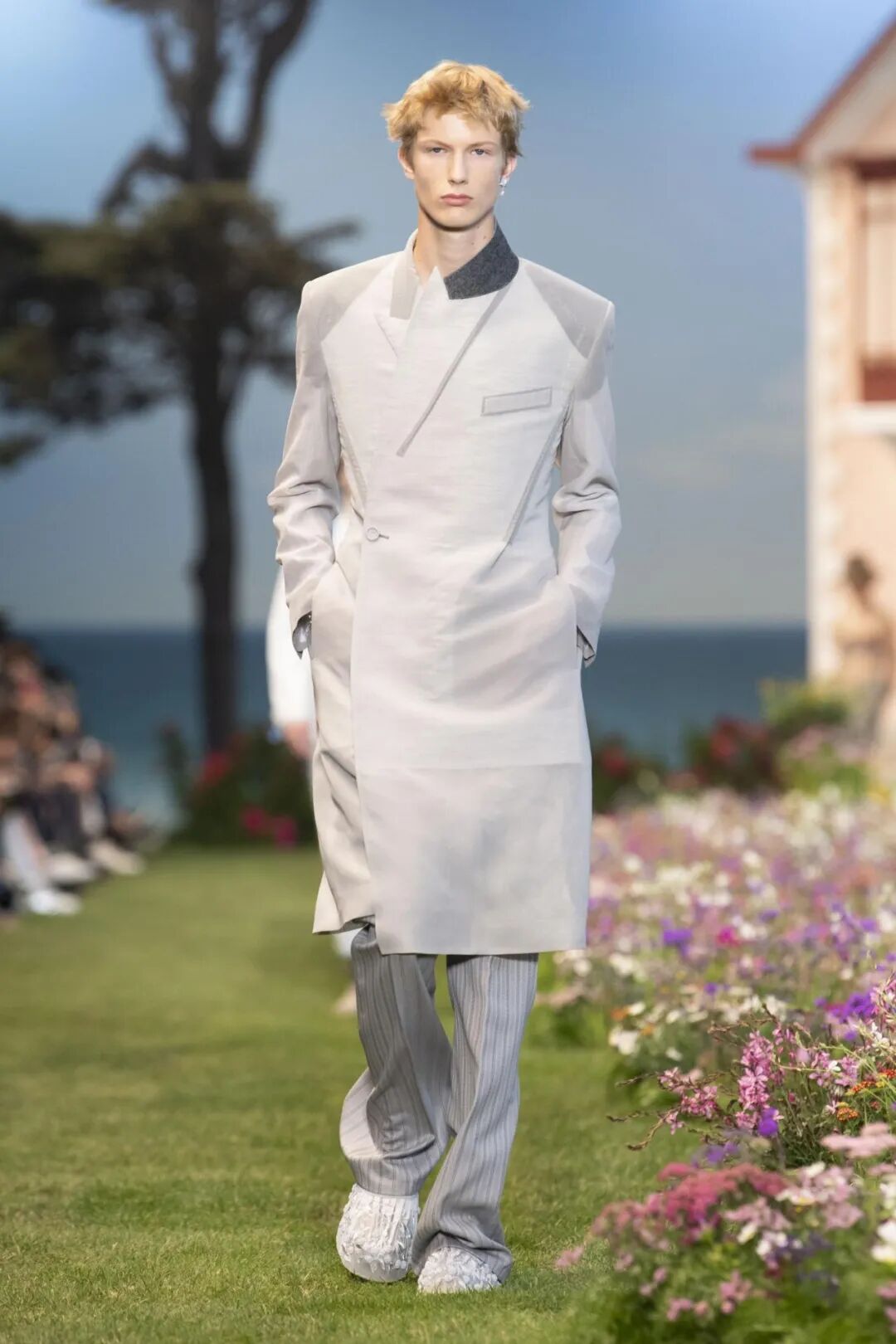 铺满鹅卵石的小路上一阵短暂的阵雨丝毫没有影响Hermès男装艺术总监维罗尼克·尼查尼安(Véronique Nichanian)策划的秀场。2023春夏系列以夕阳在生动的羊绒针织衫上开始,尼查尼安指出她想唤起“一个明亮、充满活力的夏天,以及在一起的快乐”。这样的出发点使得这一系列充满了轻松的气氛,在色调中,该系列选用了代表着柠檬水、甜瓜、丁香、泡泡糖和湖泊的颜色,每一种都表达了设计师对色彩的独特眼光,尼查尼安和她的团队自己开发所有面料,以创造一个独特的季节性色调。简单的连帽派克大衣和夹克、技术缎面或绒面小牛皮、各种质地轻薄的衬衫夹克、褶皱亚麻背心和棉质衬衫为这个夏日增添了气氛。还有可以让人联想到从水中看到的泳池瓷砖的,带有扭曲格子的“Haut à Courroies”包的一个全新版本。2023春夏系列中,金·琼斯(Kim Jones)以克里斯汀·迪奥长大(Christian Dior)的诺曼底格兰维尔海滨别墅为灵感,向品牌创始人克里斯汀·迪奥致敬。这座别墅最出名的也许是玫瑰园,这是迪奥先生一生中永恒的灵感源泉。在巴黎格蕾丝谷(Val-de-Grâce)的一个巨大的白色盒子里,琼斯建造了一所房子,周围环绕着花园——草地和五颜六色的野花,都是为了这个场合而种植的(背景看起来就像远处的海洋)。在空间的另一边,是另一座房子,让人想起西萨塞克斯郡的查尔斯顿,是琼斯自己的常年灵感所在。而邓肯·格兰特(Duncan Grant)除了是一位艺术家之外,还是一名狂热的园丁,他的作品启发了该系列中的一系列毛衣。“穿越时空的迷人之旅”,这些富有想象力描述诠释了以花园为中心的构想:围裙被重新塑造成不对称的战袍,绣有精致花朵的园艺手套,笼状太阳帽让人想起Dior的Cannage图案。不过,最令人印象深刻的是一系列以Dior的“Bar”夹克为基础的剪裁;每件西装外套均采用近乎透明的真丝透明硬纱制成,如同幽灵般地展现了其背后的复杂工艺,重新构想了该品牌无与伦比的历史。除了被明亮轻盈与花园包围的春夏,Givenchy将我们带到了浅水池中的清凉。在历史悠久的军事学院跑道中央,Givenchy竖起了一个巨大的白色盒子,散发着凉爽的雾气;在它周围,一滩浅水反射着天空的灰色,成为Givenchy创意总监马修·M·威廉姆斯(Matthew M Williams)的首个男装秀场的背景。这种场景设计与纪梵希这样的品牌相得益彰,在这里展示了一个系列,该系列包括通过该品牌工作室的精湛技艺探索当代男装。威廉姆斯指出,他正在寻找他的祖国的风格的服装,以及在他身边的音乐家和创意人士,让印有Givenchy标志的运动装充满魅力和优雅的时刻。例如,一条结晶的西部腰带,或一件绣有品牌名称和字母组合的皮夹克。然而,最时尚的是一系列宽肩大衣和定制的战袍,它们在时装秀结束时出现,展示了当纪梵希工作室充分发挥作用时可以取得的成就。Loewe创意总监乔纳森·安德森(Jonathan Anderson)在2023春夏秀场中,安排模特走过地平线,沿着巨大的白色坡道下降进入视野,并通过背光的照射来提炼剪影。“HD”廓形是设计师为最新系列打造的一个标志性版型:将宽大和紧身的蓬松皮衬衫和茧形夹克与贴身的 Loewe 品牌紧身裤和缩水的衬衣和内衣,好像被水浇了一样。该系列的另一个核心是对自然和技术的探索——真正的草是从夹克和鞋子中长出来的,而在光谱的另一端,蜜蜂、热带鱼和水仙花的视频片段出现在绑在模特胸前的屏幕上,这一表现呈现了设计师认为我们把太多的时间花在手机屏幕上这一现象。“我认为我们正以一种奇怪的方式陷入一种教条,”安德森说:“这个系列不是对世界上正在发生的事情的看法,而是我们对于这些现象做出的探索,也许我们能够通过时尚找到解决方案。”而川久保玲则以故事感的方式,让我们沉浸在她创造的世界。多部邪典恐怖电影的主题音乐为川久保玲最新的2023春夏系列提供了配乐,使观者仿佛置身其中。川久保玲称该系列为“另一种朋克”,并引用中世纪宫廷小丑作为一种灵感,“他们通常是国王的亲密顾问......来自不同的世界,拥有独特的思维方式,他们有权自由发言并提供诚实的见解和建议。我想这些小丑可能有朋克精神。”因此,模特们带着奇怪的、扭曲的面具走在T台上,每个面具都是古董,有些已经超过 100年,而其他服装则具有小丑般的感觉,比如黄色和红色色调的圆头鞋的撞色格纹。此外,这一系列中川久保玲证明了她对廓形和剪裁的掌握:一件夹克可能有第二对袖子,一件工装大衣朝一个僵硬的灯罩式下摆展开,带来了与西方设计师完全不同的呈现。与川久保玲不同的是,Dries Van Noten 2023春夏男装系列伴随着“不寻常的优雅”开始,这些词也可以很好地描述这位比利时设计师的整体作品,在他的服装中,精致的外观往往掩盖了更意想不到的灵感。本季,范·诺顿(Van Noten)在多层停车场的混凝土屋顶上展示了该系列,太阳在远处的天际线落下,设计着眼于历史悠久的男性亚文化,尤其是扎祖斯(Zazous)。一群热爱爵士乐的狂欢者,为服装带来一种放荡的、深沉的品质,比如宽腿细条纹剪裁、解开纽扣的丝绸衬衫、吊带背心;与1980年代伦敦布法罗运动的强硬、DIY 精神,比如蟒蛇印花牛仔靴、越野摩托车夹克等。在欢快的配乐中,这种组合似乎提炼了范·诺顿内心的魔力——那种“不寻常的优雅”——并让一位时尚巨星重返巴黎时装周的跑道。而Rick Owens则带来了新的“秩序