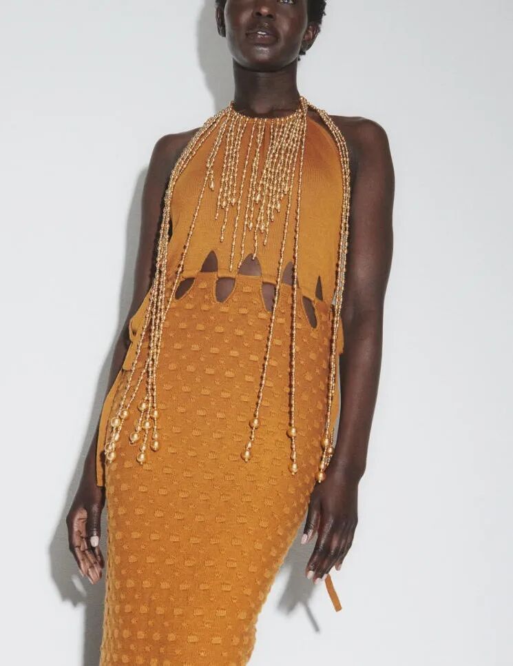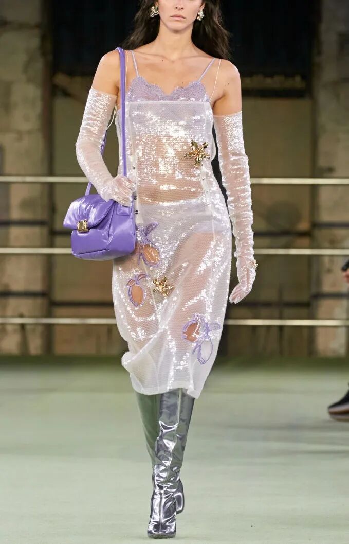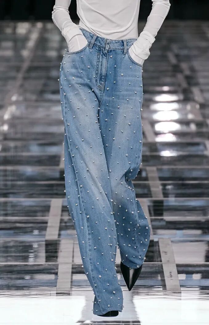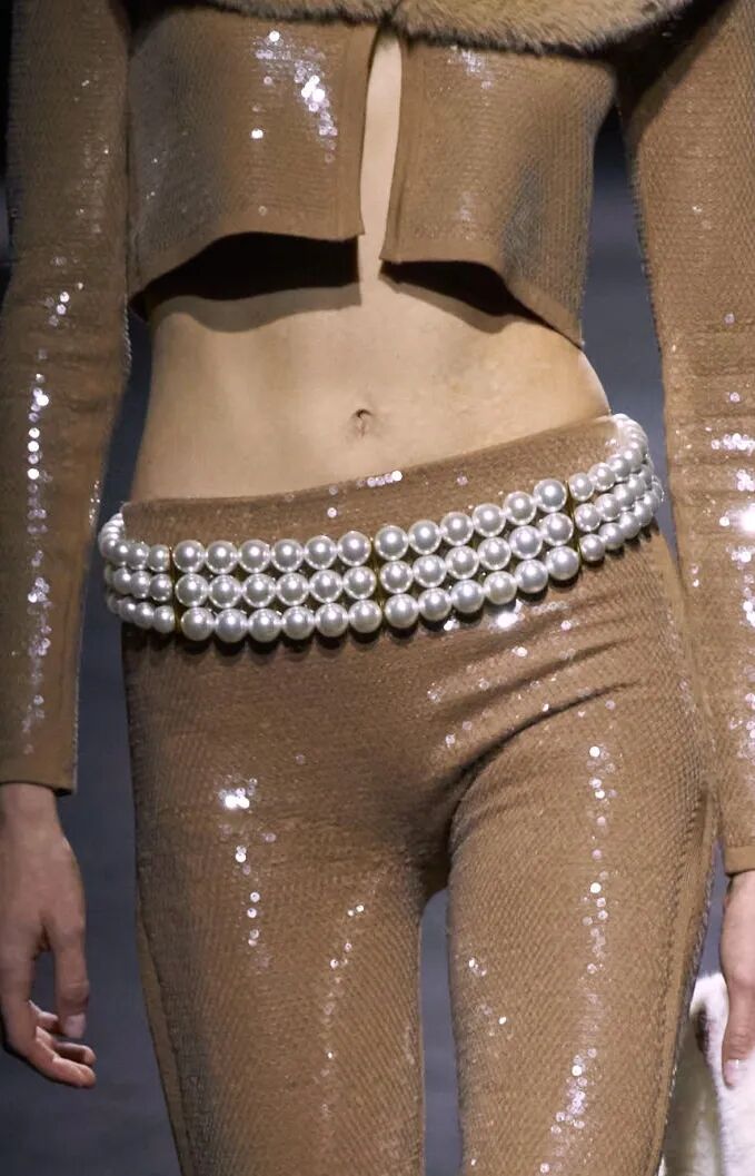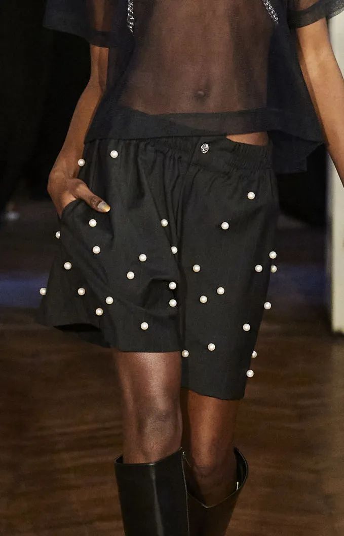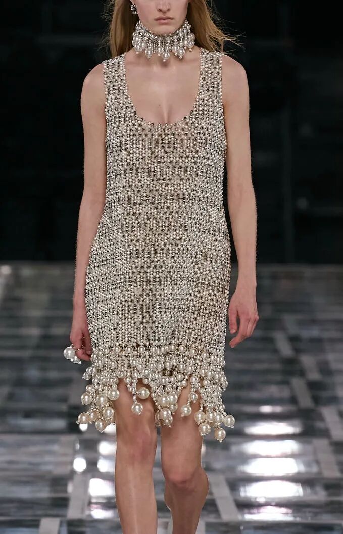 微小尺寸和球茎状为珍珠带来更新,参见Givenchy和Jacquemus,但最新的样式是玻璃水滴,可升级派对造型以及适合年轻群体的音乐节下装和连衣裙。