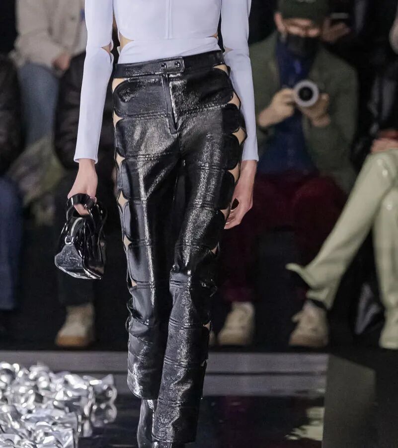 平滑的黏纤平织面料是打造聚褶和褶裥造型的上佳选择。2023春夏可采用印花梭织、竹节针织和科技尼龙等面料来打造休闲下装。夏日绸缎依旧是打造高光泽质感的首选面料,而用环保工艺打造的橡胶涂层将成为2023年的最新光泽表面处理工艺。