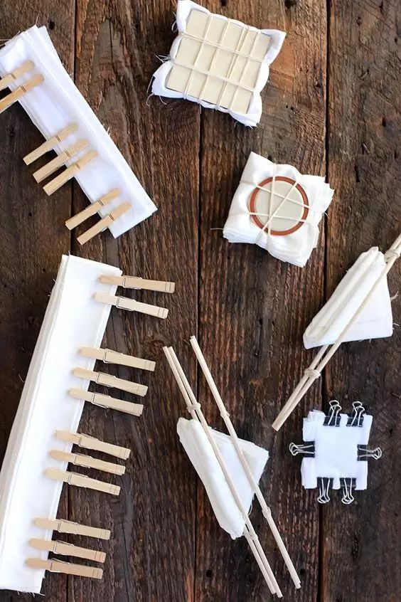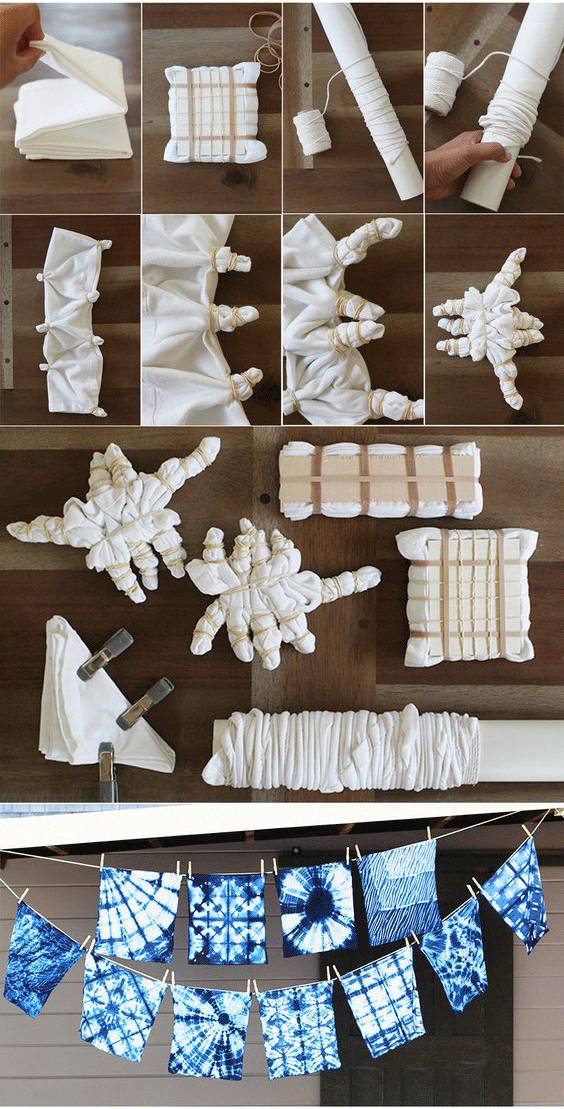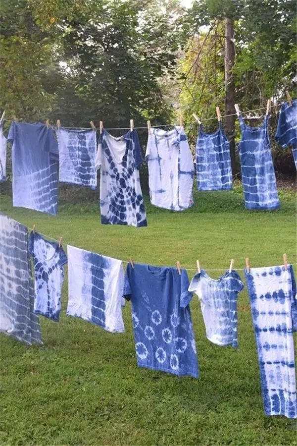 不同的结扎方式,会出来不一样的图案花纹,随处可见的小木板,筷子,木夹子,橡皮筋,棉线都可以成为扎染的工具。