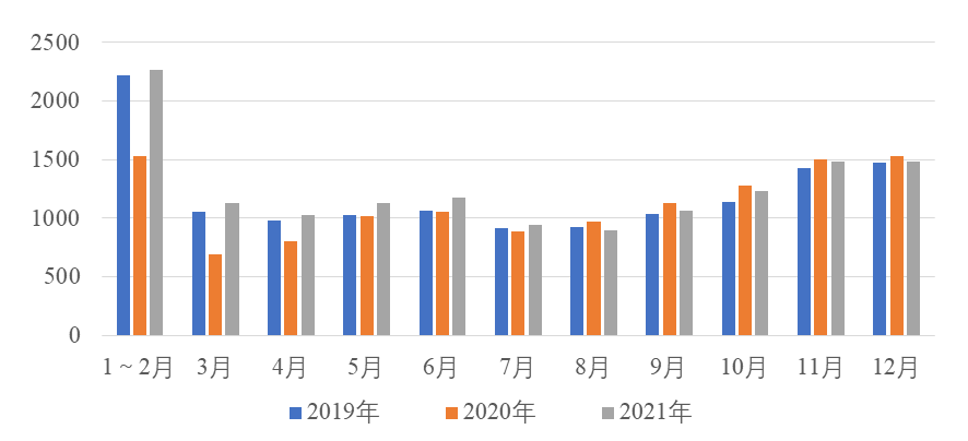 国家统计局数据显示,2021年,社会消费品零售总额44.1万亿元,比上年增长12.5%,两年平均增速为3.9%。其中,限额以上单位服装鞋帽、针纺织品类商品零售额1.38万亿元,占限额以上单位商品零售的9.0%,零售额比2019年、2020年分别增长2.4%、12.7%,纺织服装消费市场呈现活跃态势。(图表1-1)