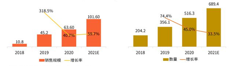 图表1-4 2018~2021年中国汉服市场与爱好者规模(单位:亿元、万人)