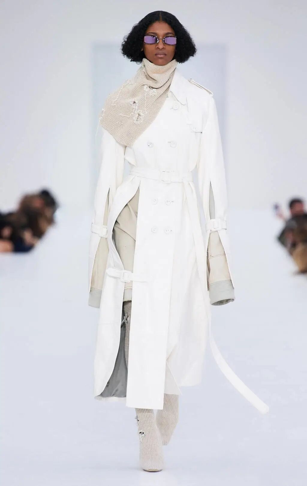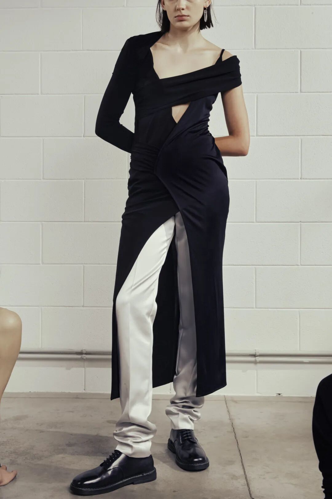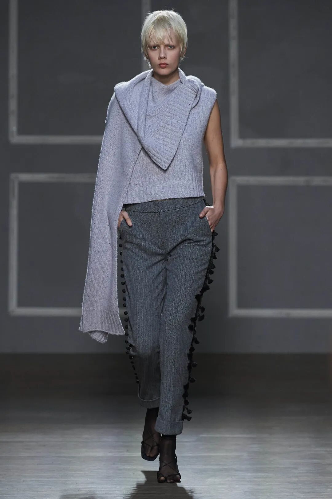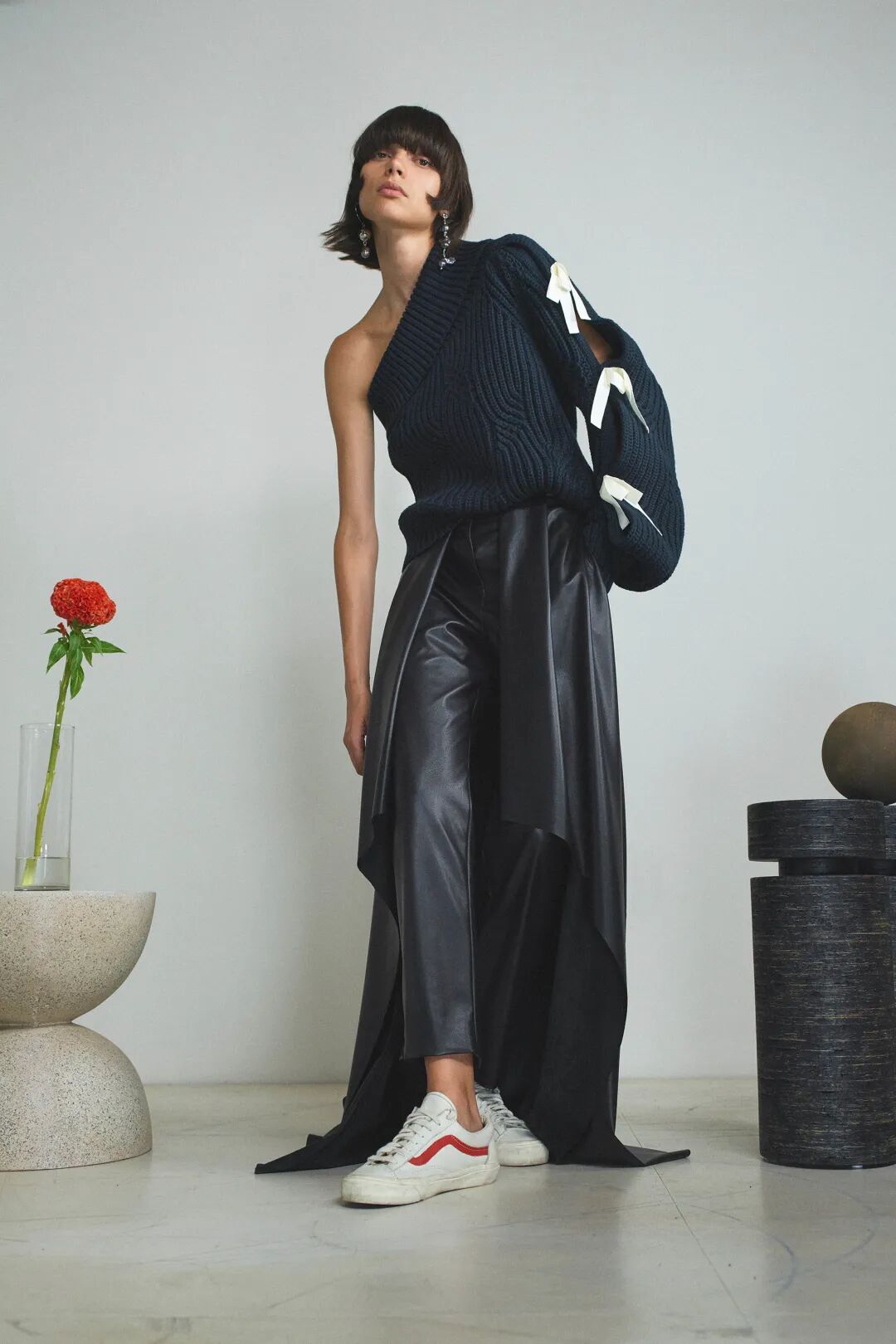 不对称剪裁设计通过利落剪裁产生的直观不对称性,融入层叠效果、线迹勾勒等简洁明了的设计,通过单侧开衩及斜向剪裁等细节体现,运用于裙摆、领口及毛衫单侧部位,结合挺阔质地牛仔或皮革材质,强调硬朗率性装扮,打破常规的设计思路,带来不一样的视觉体验。