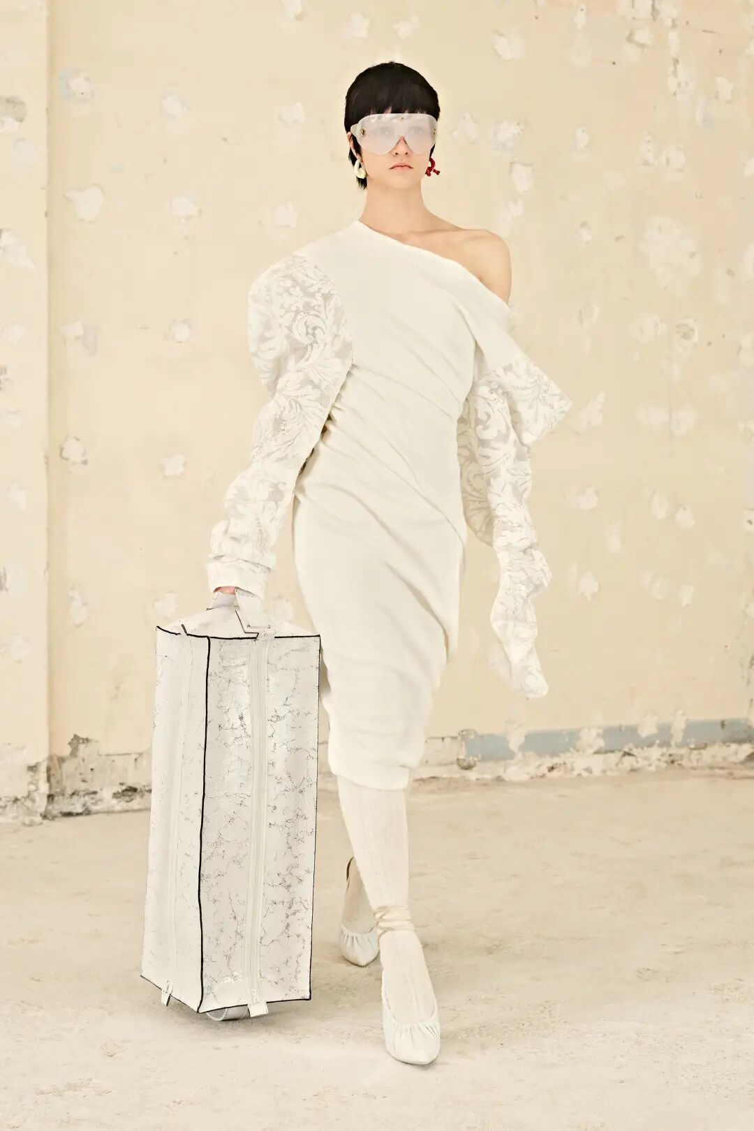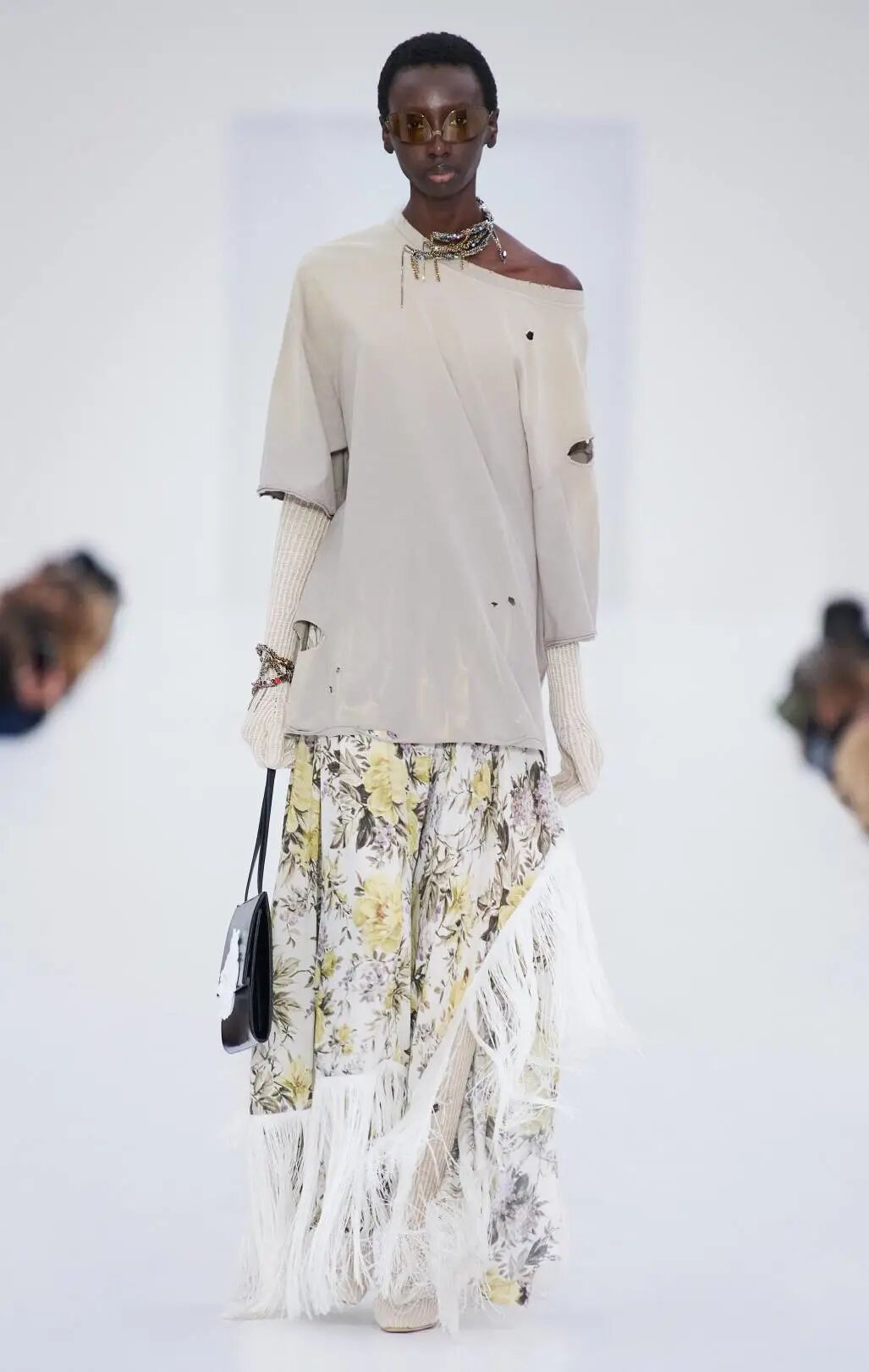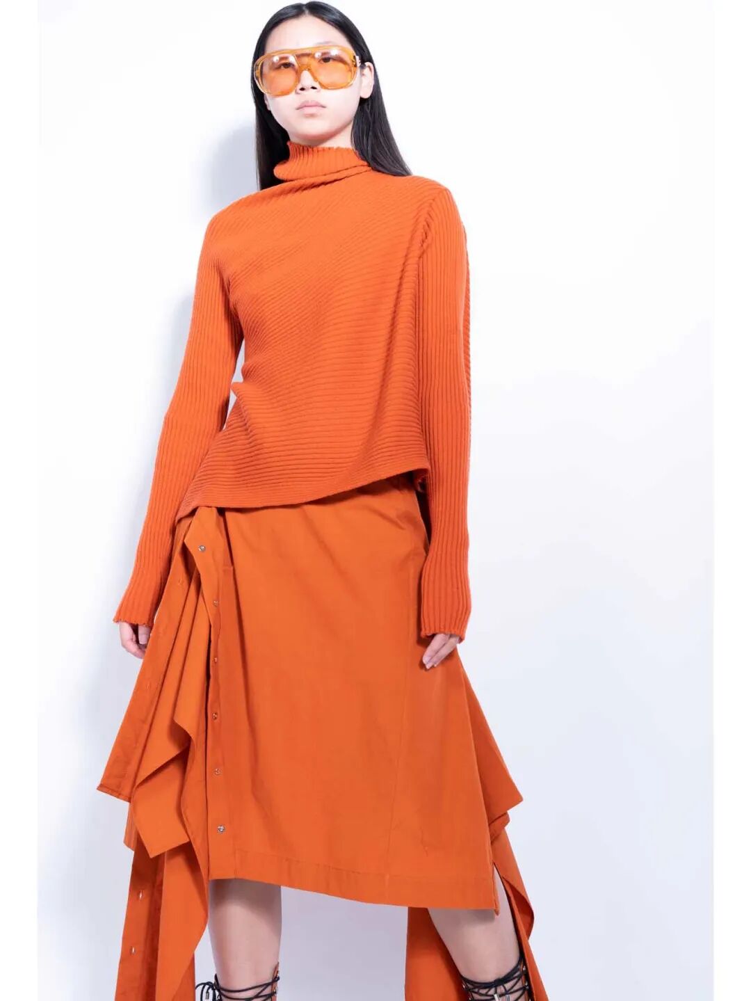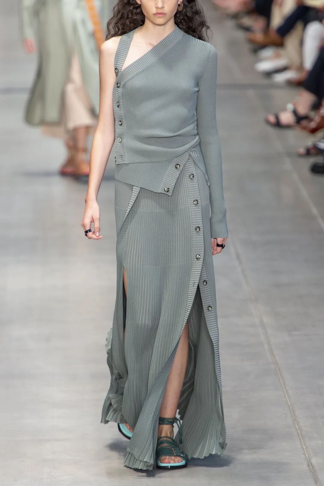 不对称剪裁设计通过利落剪裁产生的直观不对称性,融入层叠效果、线迹勾勒等简洁明了的设计,通过单侧开衩及斜向剪裁等细节体现,运用于裙摆、领口及毛衫单侧部位,结合挺阔质地牛仔或皮革材质,强调硬朗率性装扮,打破常规的设计思路,带来不一样的视觉体验。