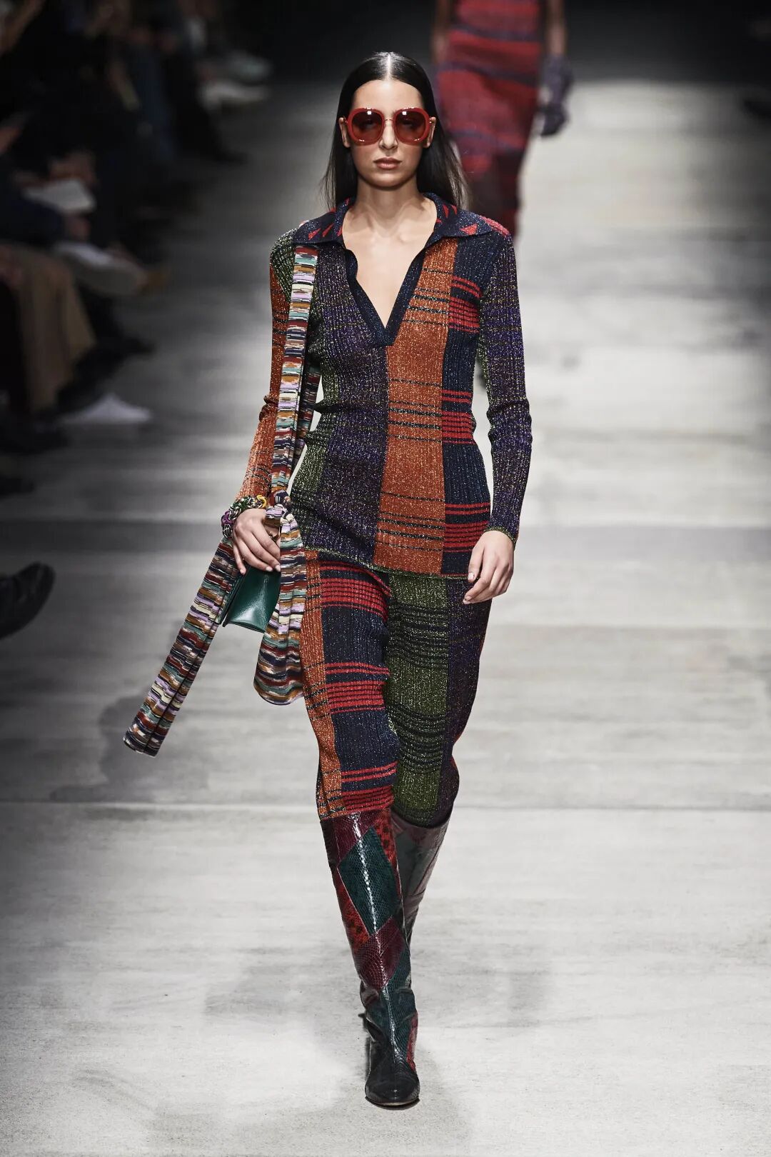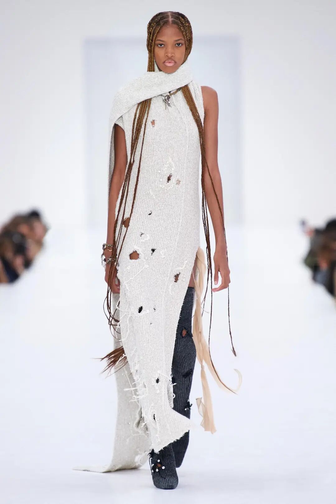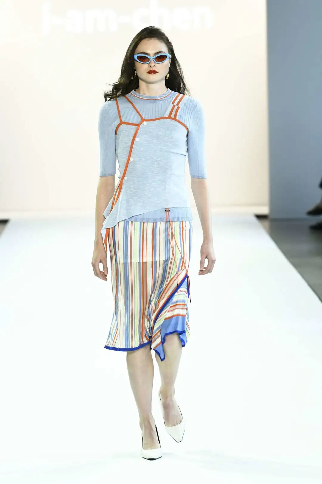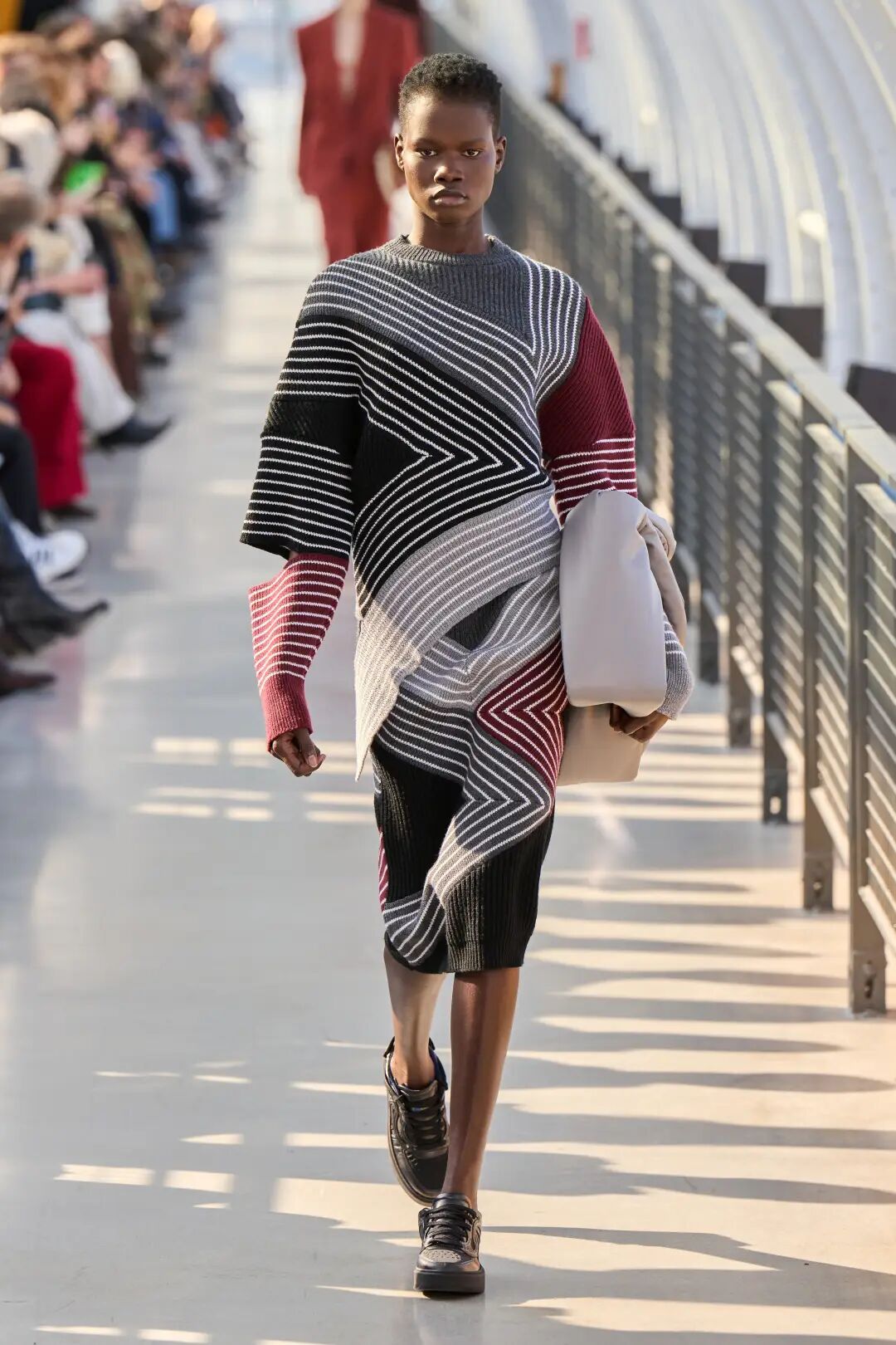 不对称剪裁设计通过利落剪裁产生的直观不对称性,融入层叠效果、线迹勾勒等简洁明了的设计,通过单侧开衩及斜向剪裁等细节体现,运用于裙摆、领口及毛衫单侧部位,结合挺阔质地牛仔或皮革材质,强调硬朗率性装扮,打破常规的设计思路,带来不一样的视觉体验。
