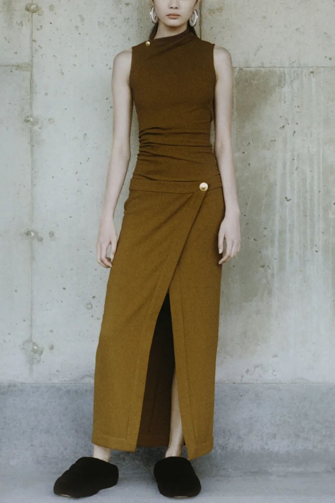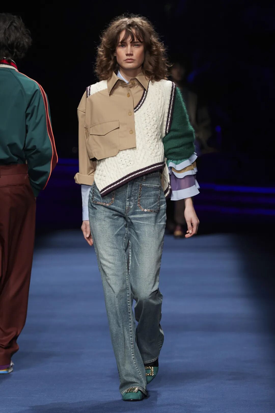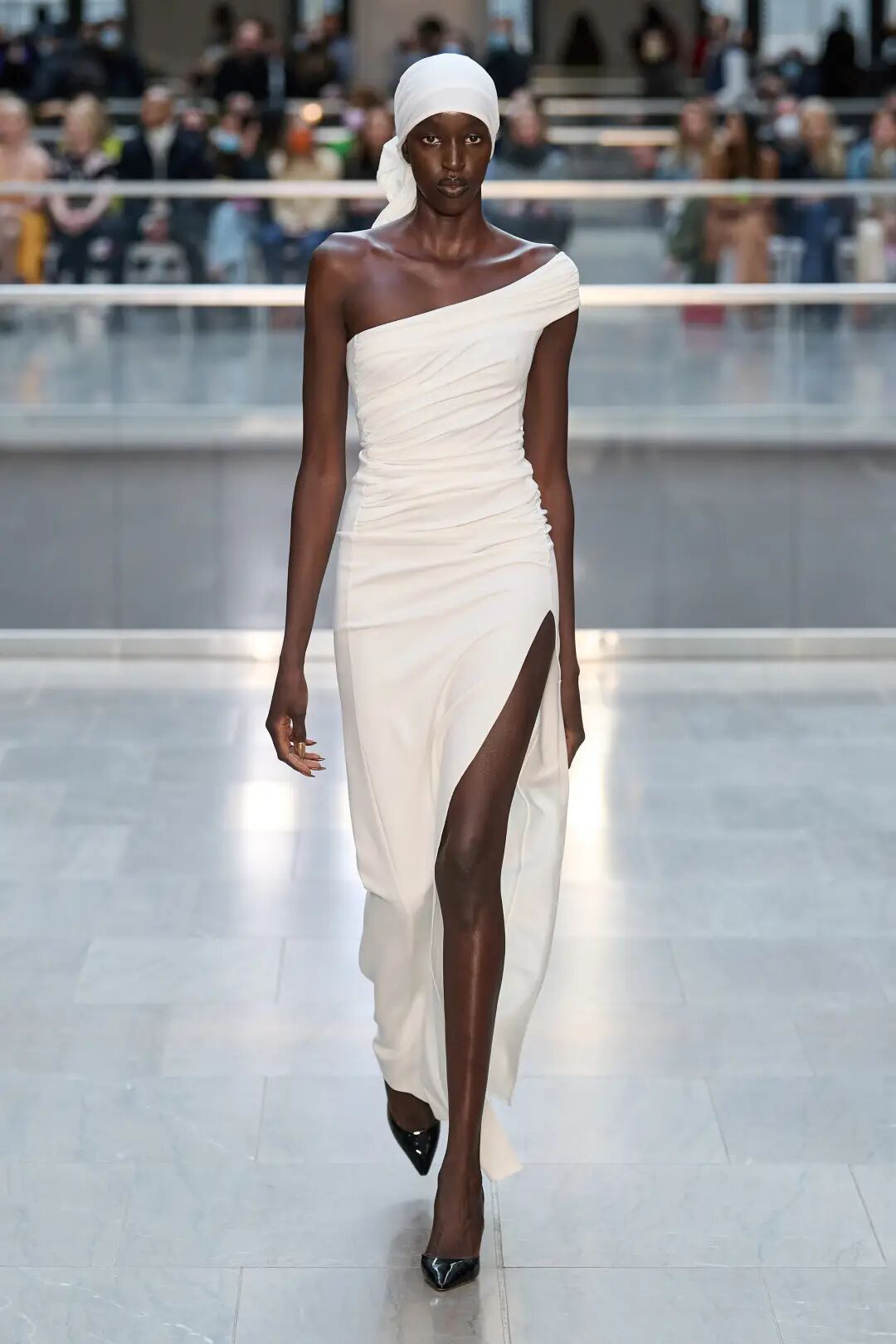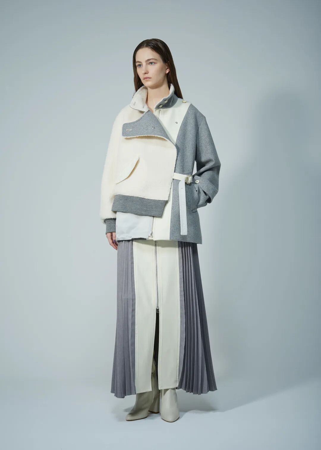 不对称剪裁设计通过利落剪裁产生的直观不对称性,融入层叠效果、线迹勾勒等简洁明了的设计,通过单侧开衩及斜向剪裁等细节体现,运用于裙摆、领口及毛衫单侧部位,结合挺阔质地牛仔或皮革材质,强调硬朗率性装扮,打破常规的设计思路,带来不一样的视觉体验。