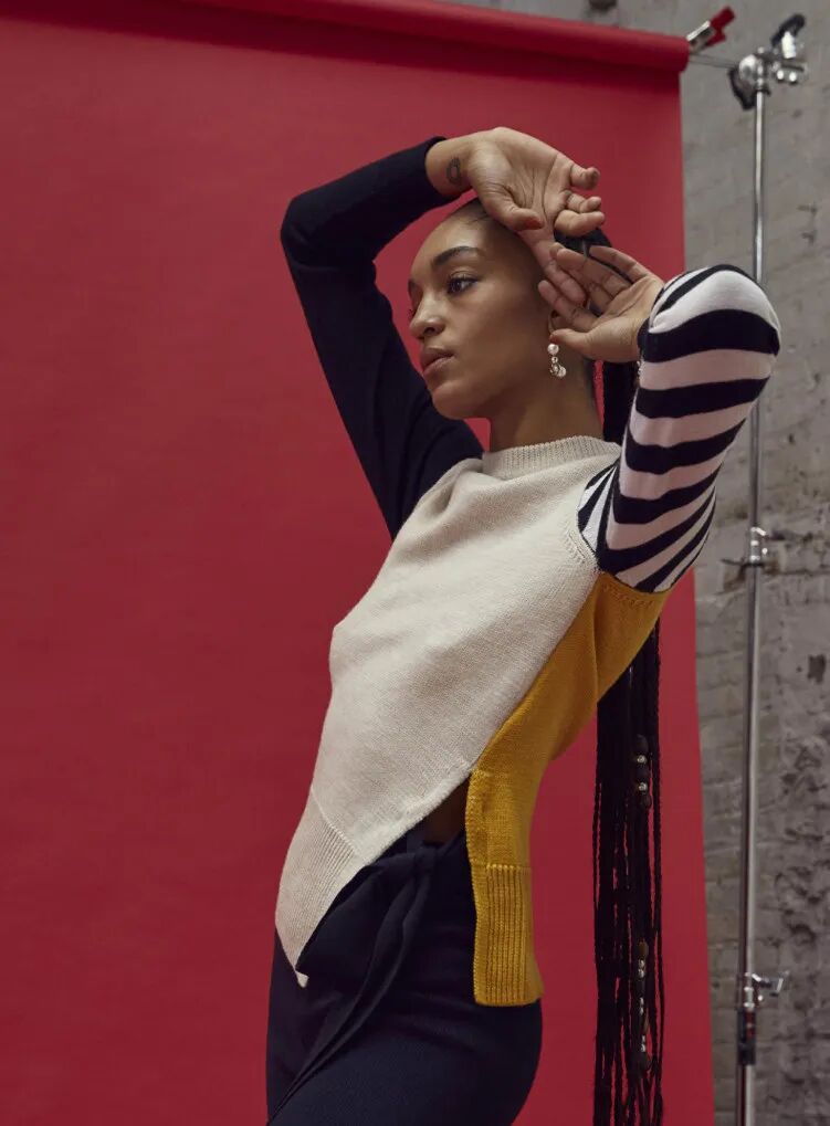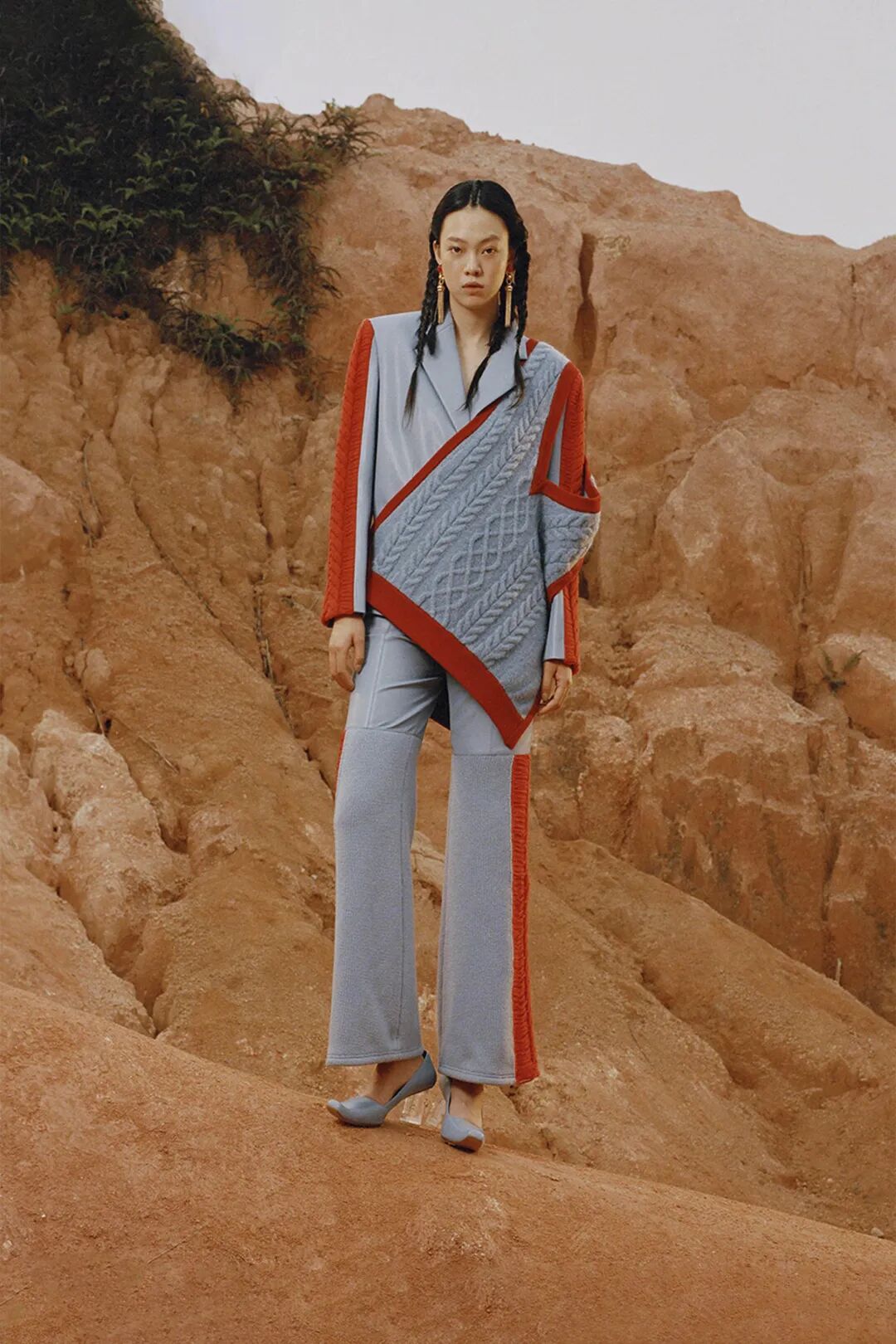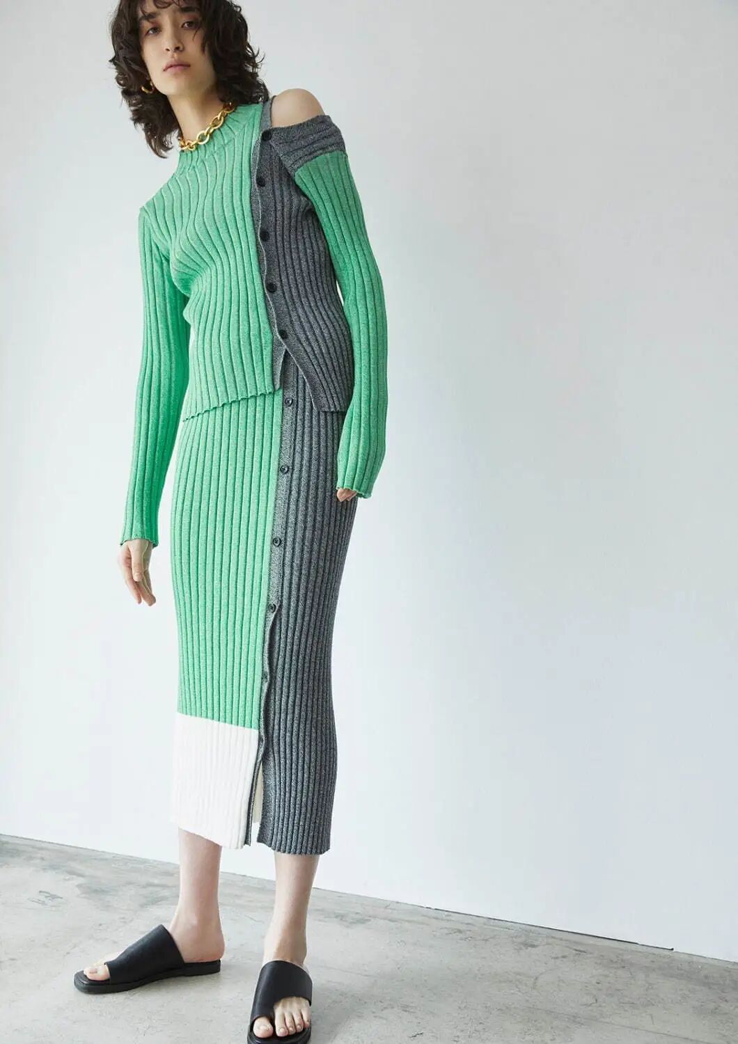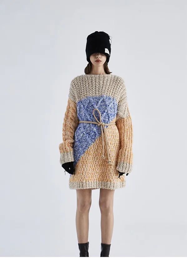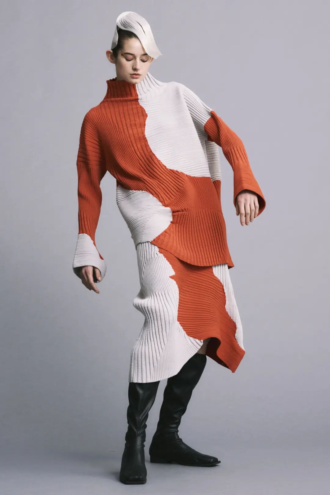 通过色块拼接和不同材质碰撞出有趣的混搭外观,并利用多种纹理的针织零料打造创意拼缝,在极简风格的基础上大胆混入对比色及不同风格的纱线外观。迎合全新的生活风尚理念,选用的醒目色彩和撞色的个性针织可以为疫情生活增加些许喜悦感并振奋情绪。