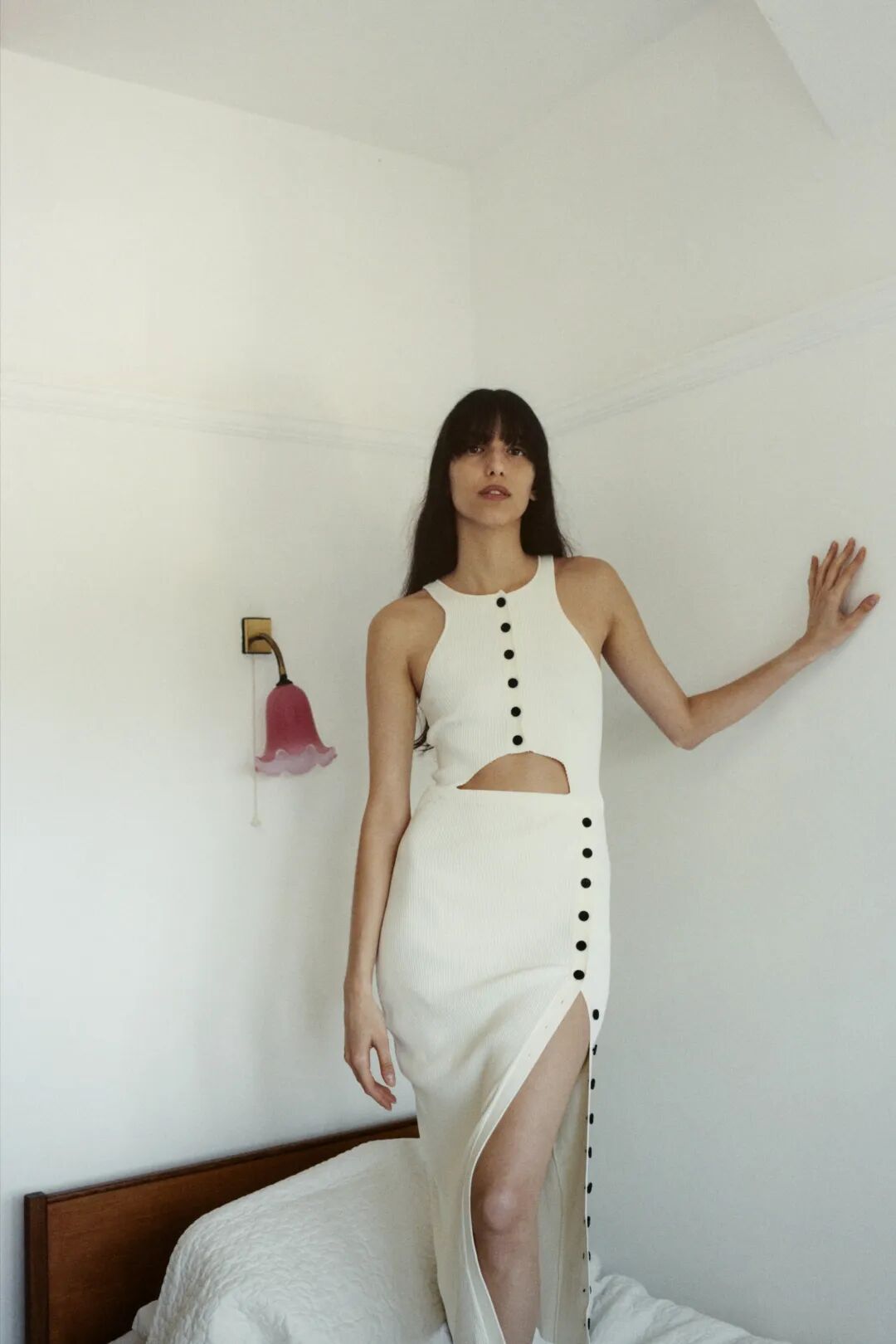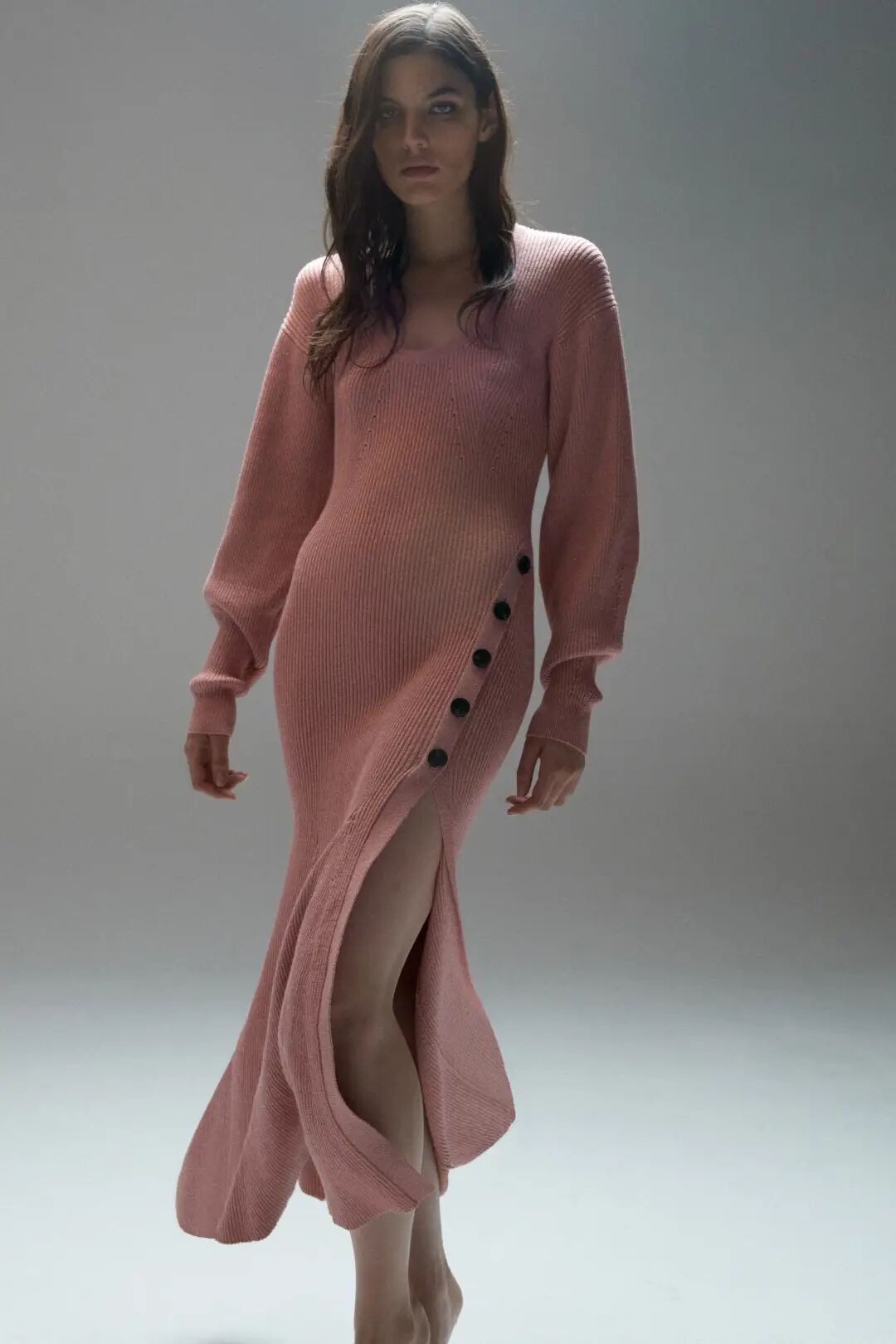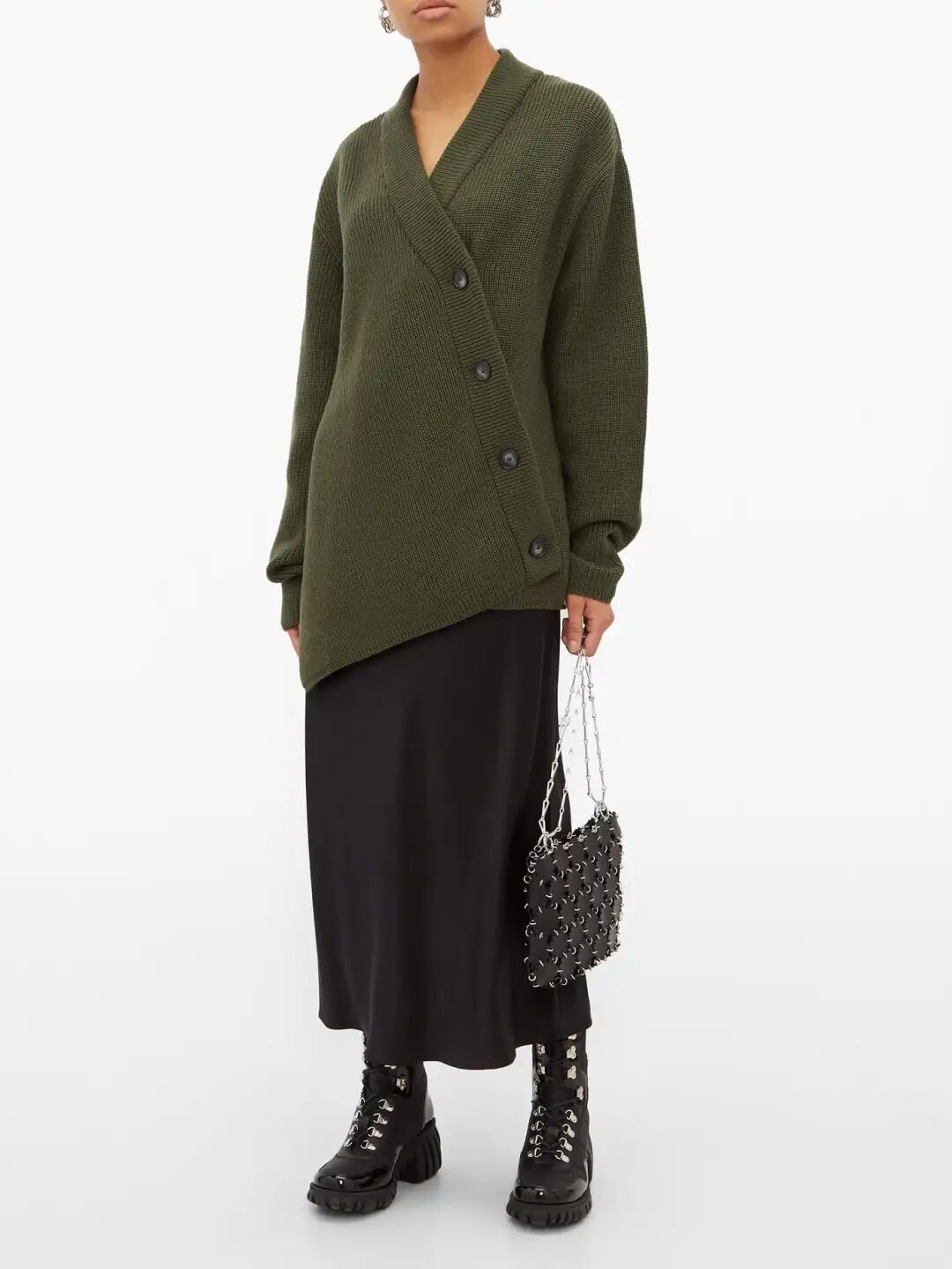 斜门襟在新季女装毛衫中的应用也逐步增多,成为简欧中淑风格中的一大风向标。利落的斜裁在素雅色彩与柔软羊绒的衬托下大方得体,简约率性,同时纽扣的点缀可进一步凸显其率真属性。