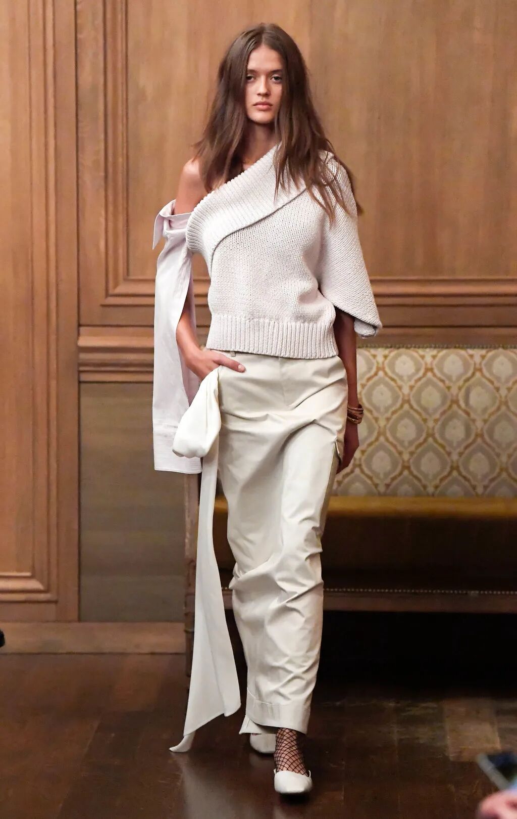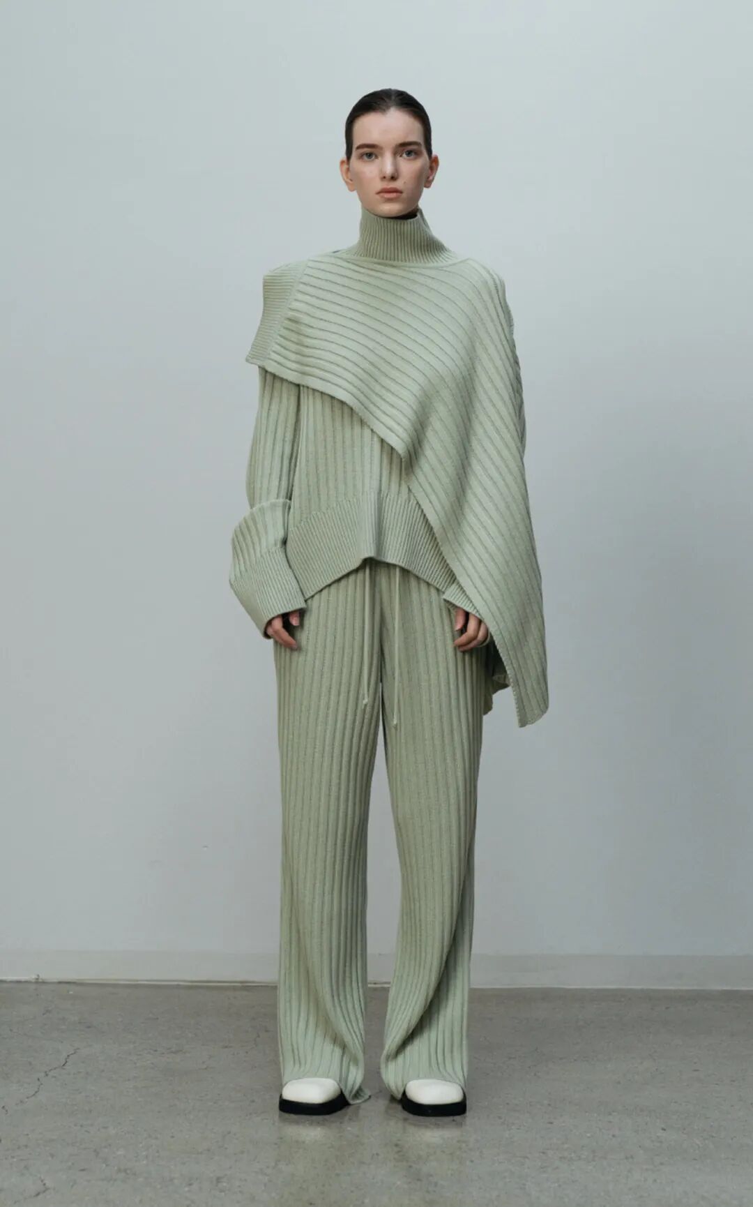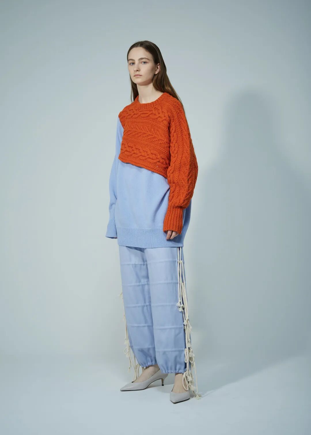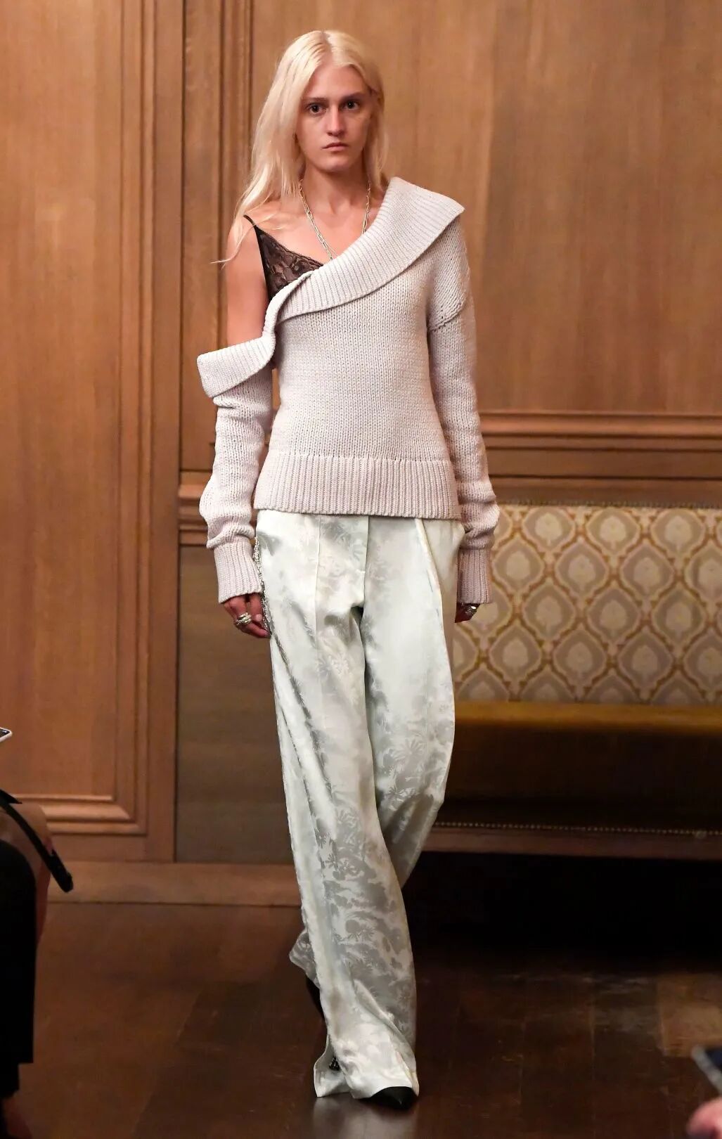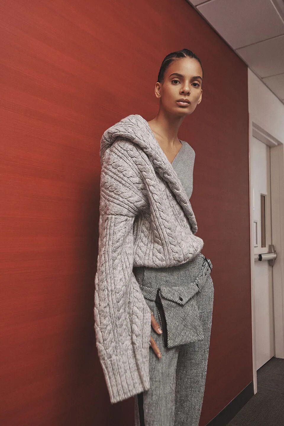 斜领设计的特点在于不对称感和失衡感,在女装毛衫应用中结合异类材质与不同方向排布的绞花肌理,打破常规套衫的沉闷,通过对比色系的碰撞与边缘轮廓的体现,层次分明、低调内敛,透出一股个性率真的气息。