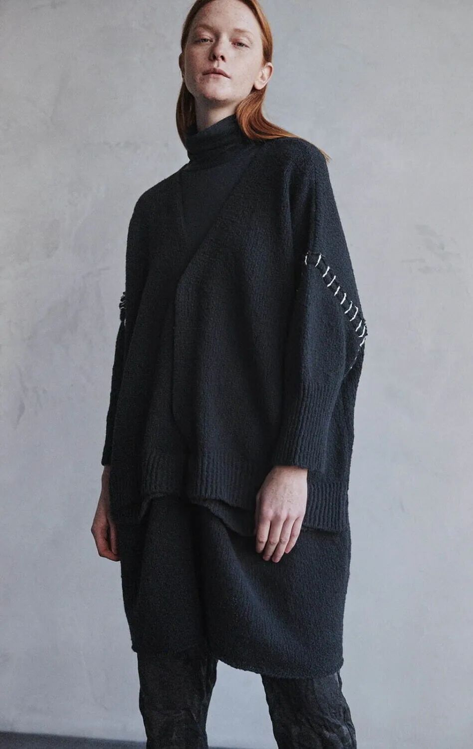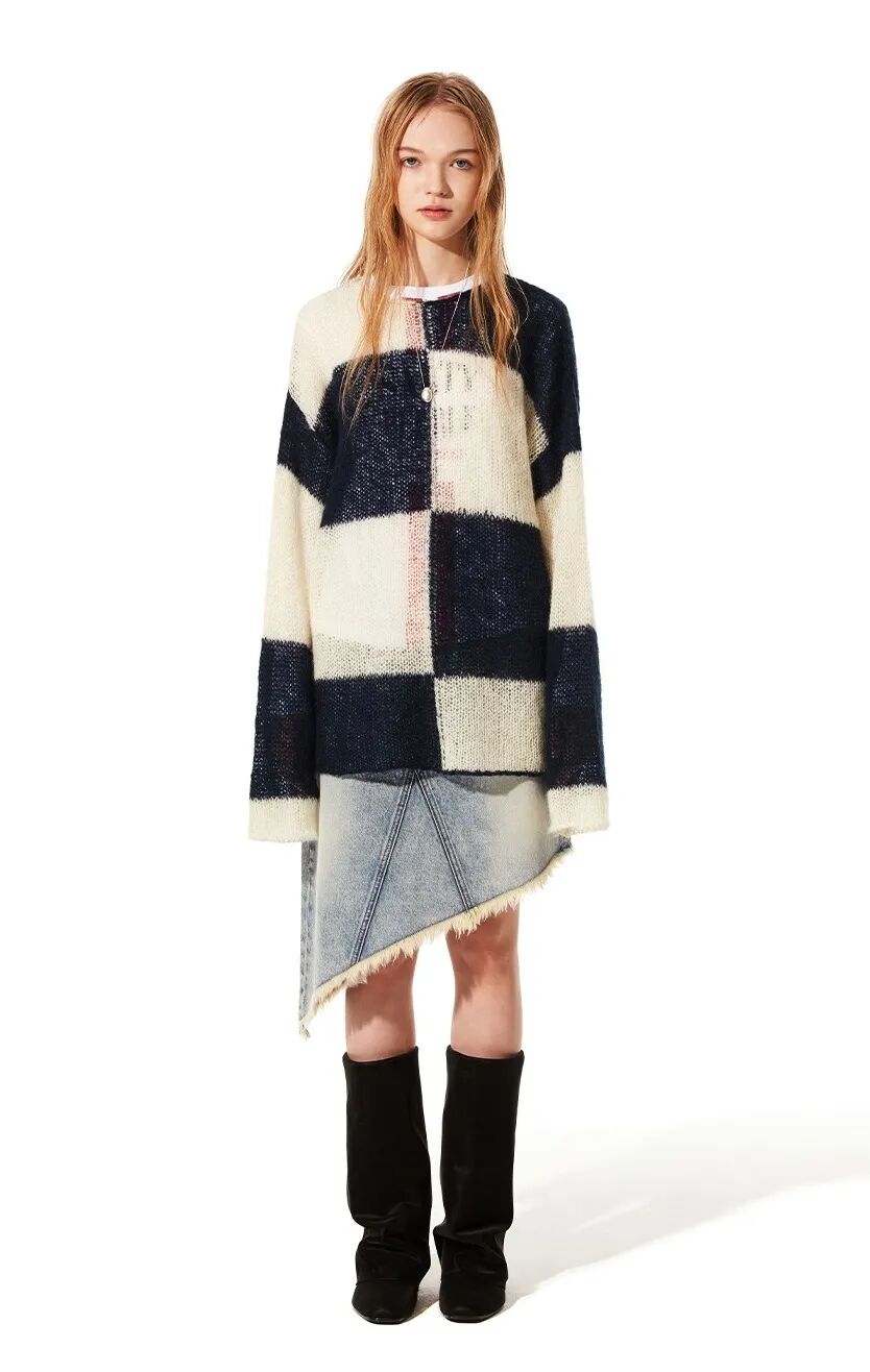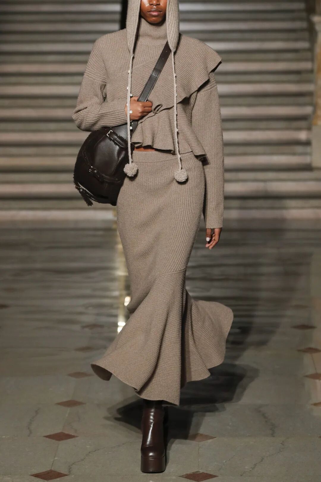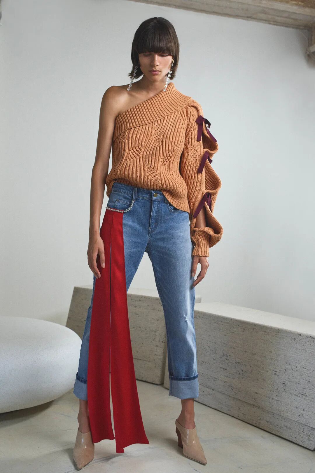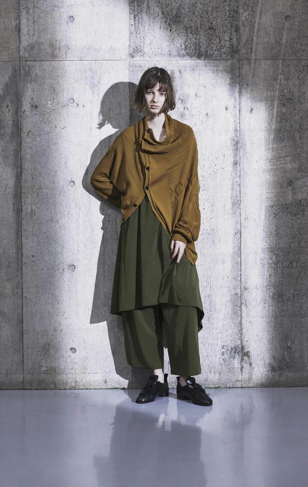 斜领设计的特点在于不对称感和失衡感,在女装毛衫应用中结合异类材质与不同方向排布的绞花肌理,打破常规套衫的沉闷,通过对比色系的碰撞与边缘轮廓的体现,层次分明、低调内敛,透出一股个性率真的气息。