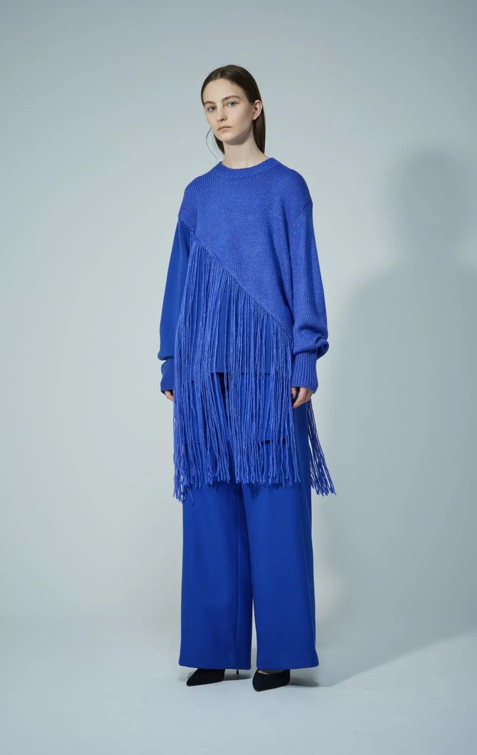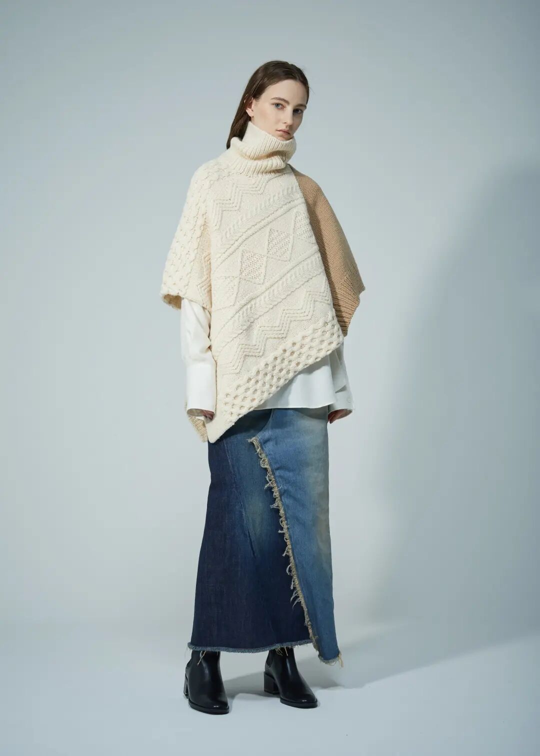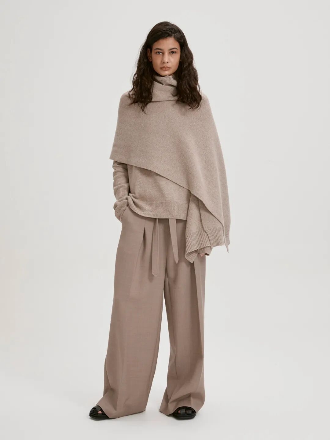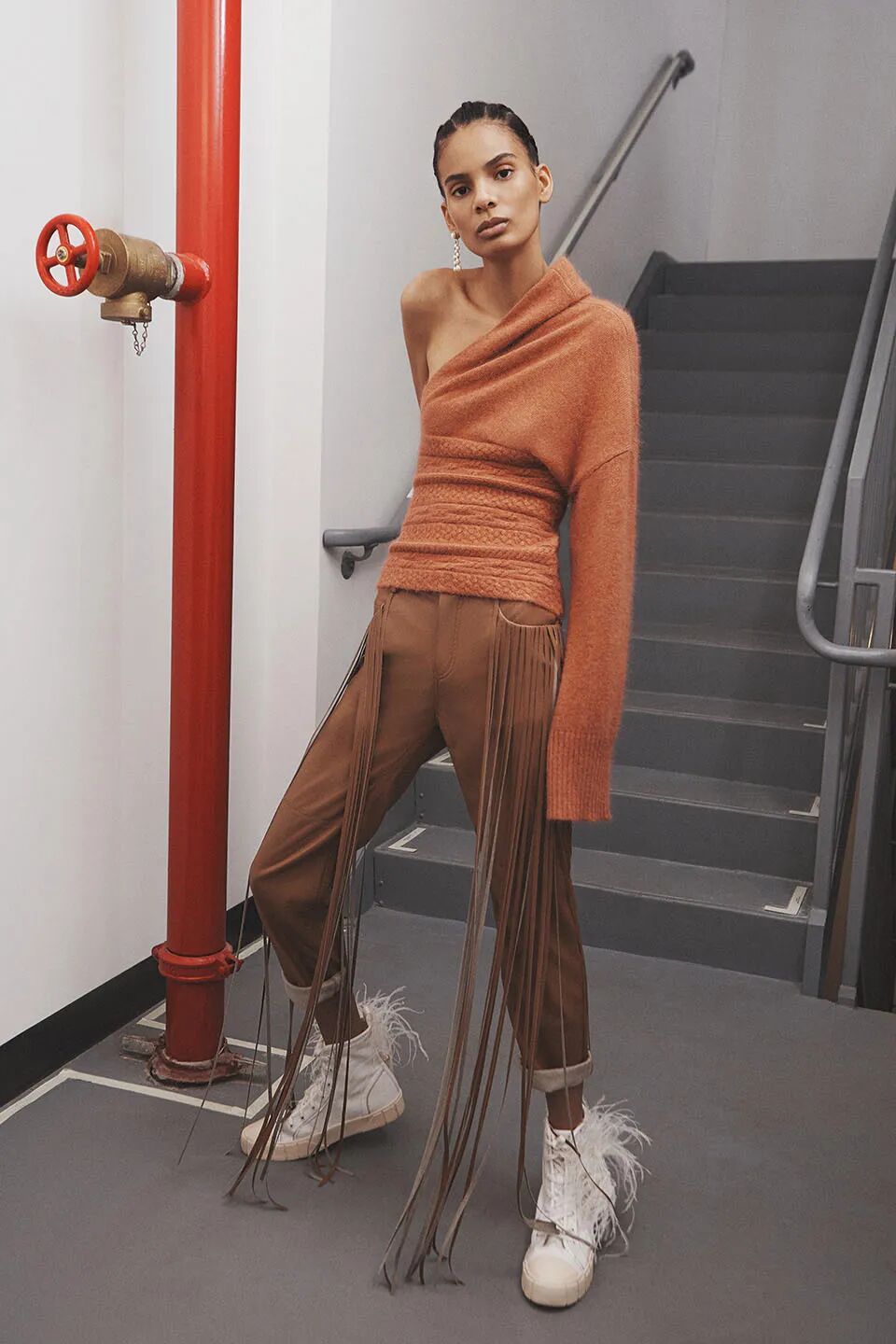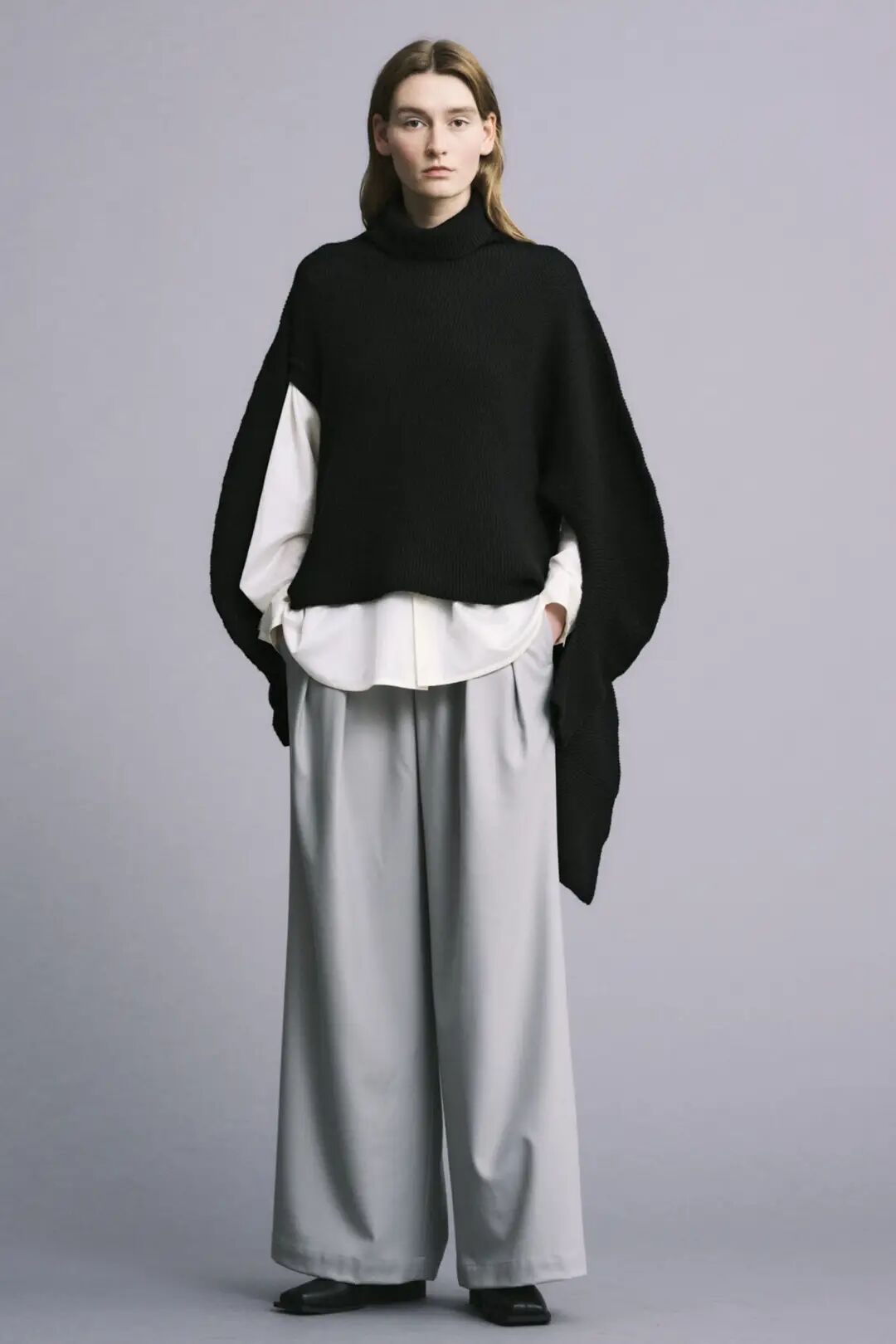 斜领设计的特点在于不对称感和失衡感,在女装毛衫应用中结合异类材质与不同方向排布的绞花肌理,打破常规套衫的沉闷,通过对比色系的碰撞与边缘轮廓的体现,层次分明、低调内敛,透出一股个性率真的气息。