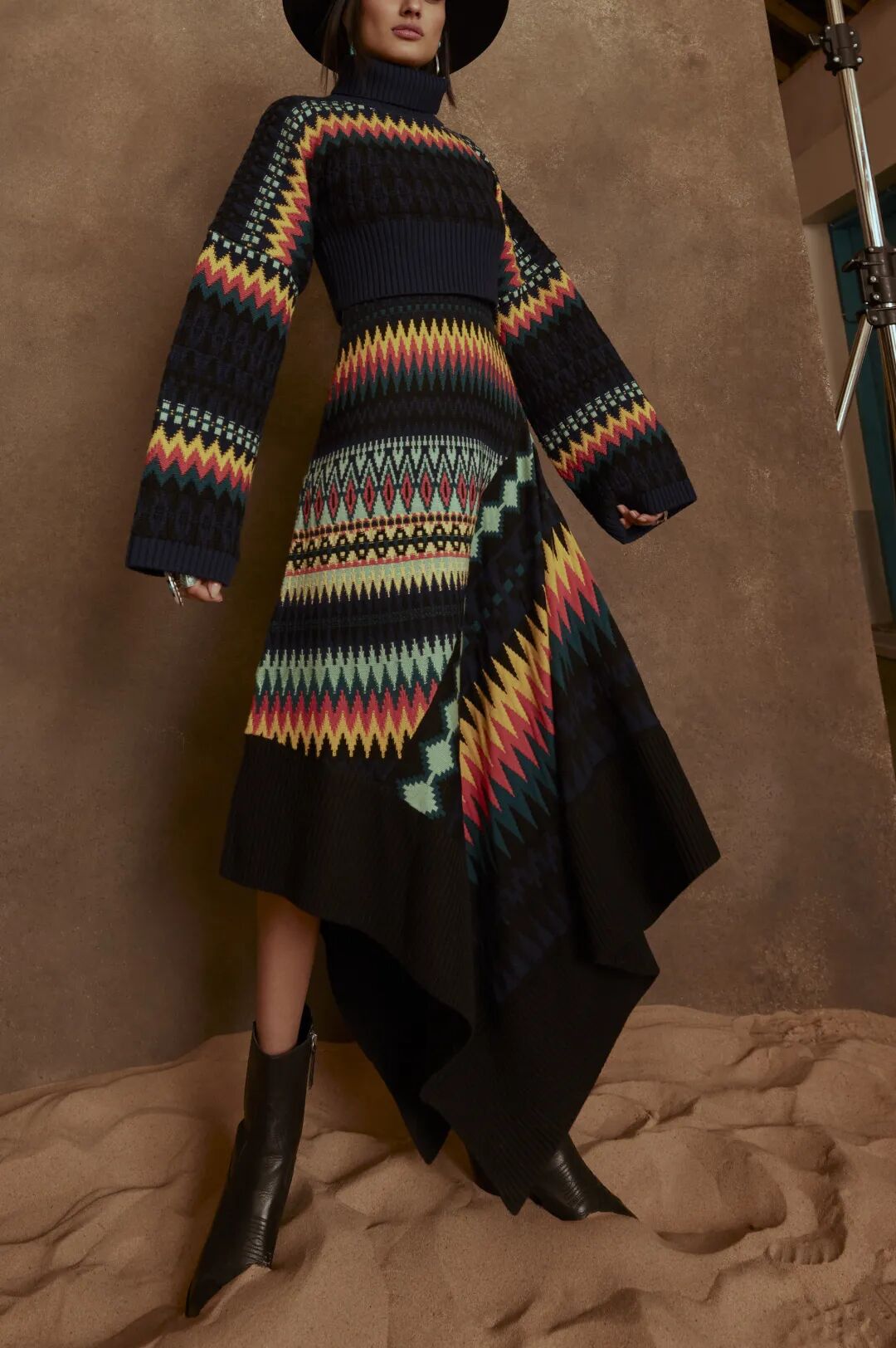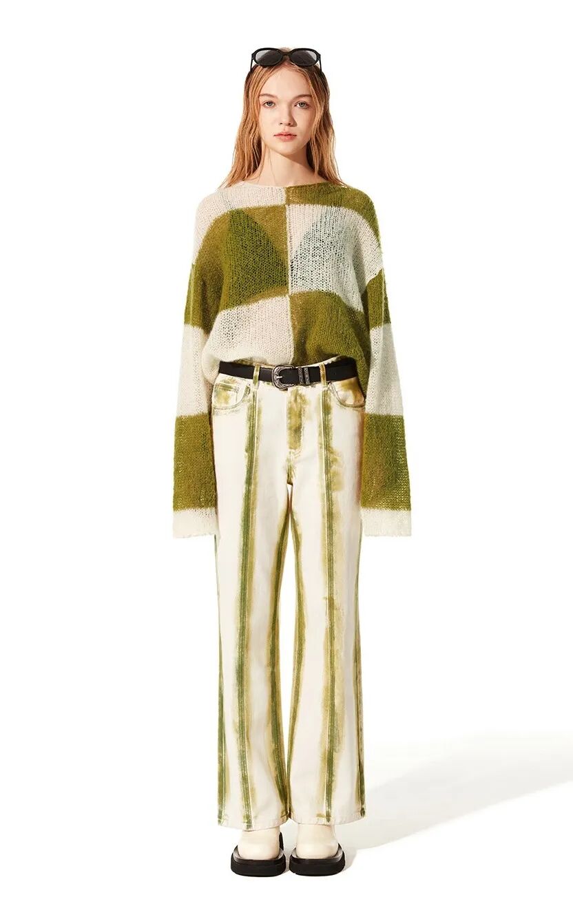 随着针织产业的发展和毛衫个性化消费的推进,运用色彩、结构、线条等元素呈现视觉分割的整体效果越来越多。毛衫设计通过长短不一、左右不对称、不同材质拼接等差异性设计塑造毛衫单品,并在领口、肩部、袖口等细节部位进行设计,实现美观与实用并重。