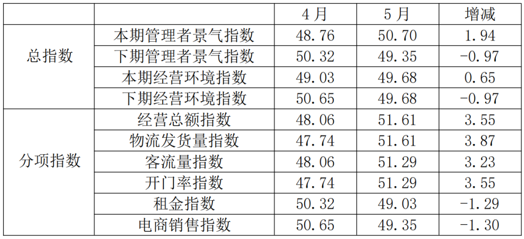 从管理者景气指数来看,总指数中,5月管理者景气指数为50.70,比4月的48.76上升1.94个百分点;经营环境指数为49.68,比4月的49.03上升0.65个百分点。分项指数中,经营总额指数为51.61,比4月的48.06上升3.55个百分点;物流发货量指数为51.61,比4月的47.74上升3.87个百分点;客流量指数为51.29,比4月的48.06上升3.23个百分点;开门率指数为51.29,比4月的47.74上升3.55个百分点;租金指数为49.03,比4月的50.32下降1.29个百分点;电商销售指数为49.35,比4月的50.65下降1.30个百分点。
