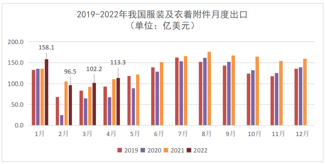 4月当月,服装出口113.3亿美元,同比增长2.4%,比2019年同期增长21.6%。4月增速较上月回落8.5个百分点,为20个月以来最低。