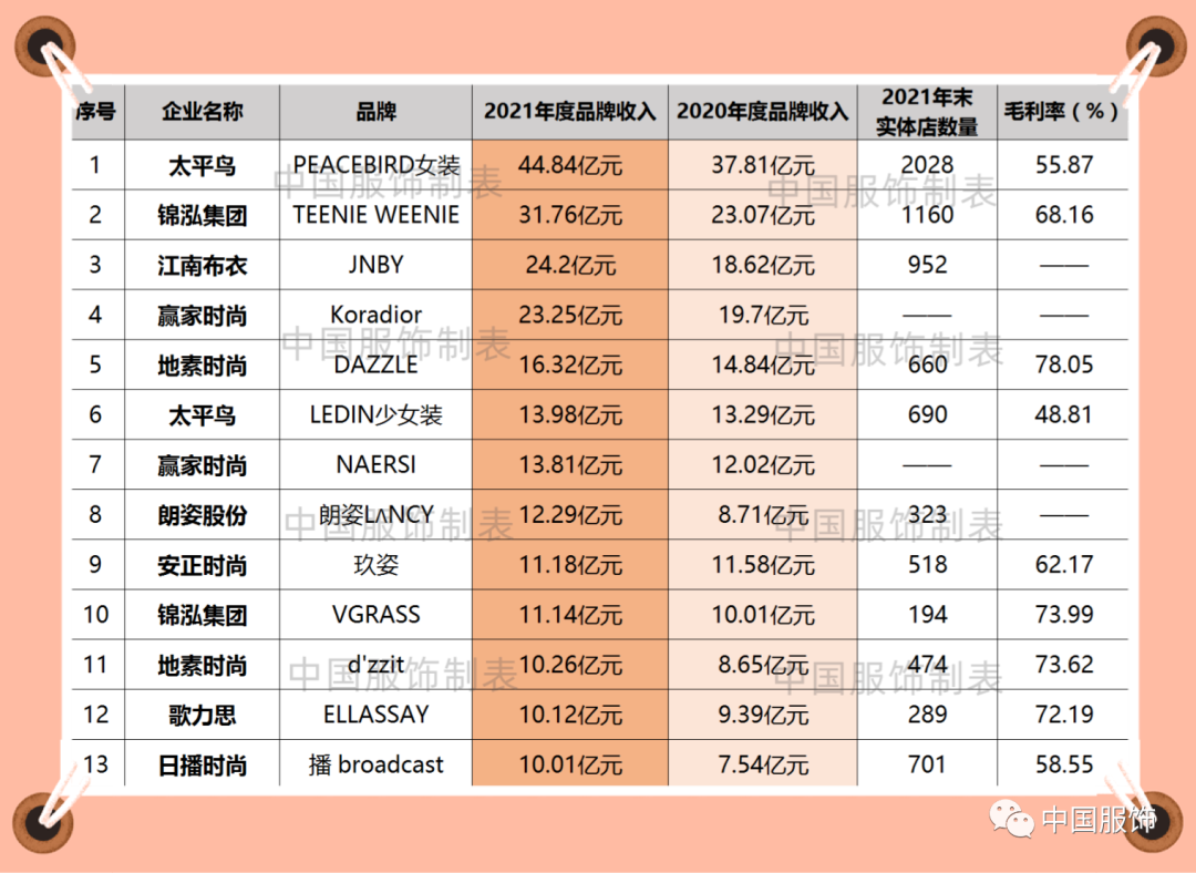 中国服装协会会刊《中国服饰》杂志日前梳理了2021年度沪深和港股女装上市公司财报,从企业披露的旗下各品牌年收入情况来看,2021年度收入超10亿元的女装品牌共有13个,分别是PEACEBIRD女装、TEENIE WEENIE、JNBY、Koradior、DAZZLE、LEDIN少女装、NAERSI、朗姿LɅNCY、玖姿、VGRASS、d'zzit、ELLASSAY和播 broadcast。其中,品牌年收入超40亿元的有1个,为太平鸟旗下PEACEBIRD女装以44.84亿元收入居首;品牌年收入超30亿元的有1个,为锦泓集团旗下TEENIE WEENIE以31.76亿元收入紧随其后;品牌年收入超20亿元的有2个,分别是江南布衣旗下JNBY以24.2亿元收入位列第三、赢家时尚旗下Koradior以23.25亿元收入排名第四;DAZZLE、LEDIN少女装、NAERSI、朗姿LɅNCY、玖姿、VGRASS、d'zzit、ELLASSAY和播 broadcast9个品牌收入超10亿元。从这些品牌来看,太平鸟、锦泓集团、赢家时尚、地素时尚均拥有2个年收入超10亿元的女装品牌。再对比2020年度这些品牌收入来看,除玖姿2021年收入略低于2020年外,其余12个品牌2021年收入均超过2020年,其中PEACEBIRD女装年收入从37.81亿元跨越至44.84亿元,涨幅18.6%;TEENIE WEENIE年收入由23.07亿元升至31.76亿元,涨幅37.67%;JNBY和Koradior年收入分别由18.62亿元、19.7亿元涨至24.2亿元、23.25亿元,涨幅分别为29.97%、18%,朗姿LɅNCY、d'zzit、ELLASSAY和播 broadcast也均在2021年跻身10亿元品牌收入阵营。进入今年三四月以来,由于多地疫情反复影响零售市场销售,令服装企业销售出现明显波动。不过在市场分析看来,这些头部女装企业依然优势明显,随着疫情缓解及多地封控逐步放开,预计6月服装零售端有望出现改善。精彩推荐: