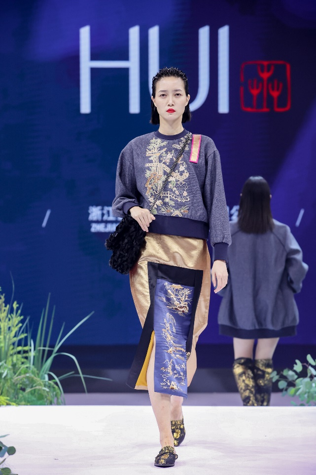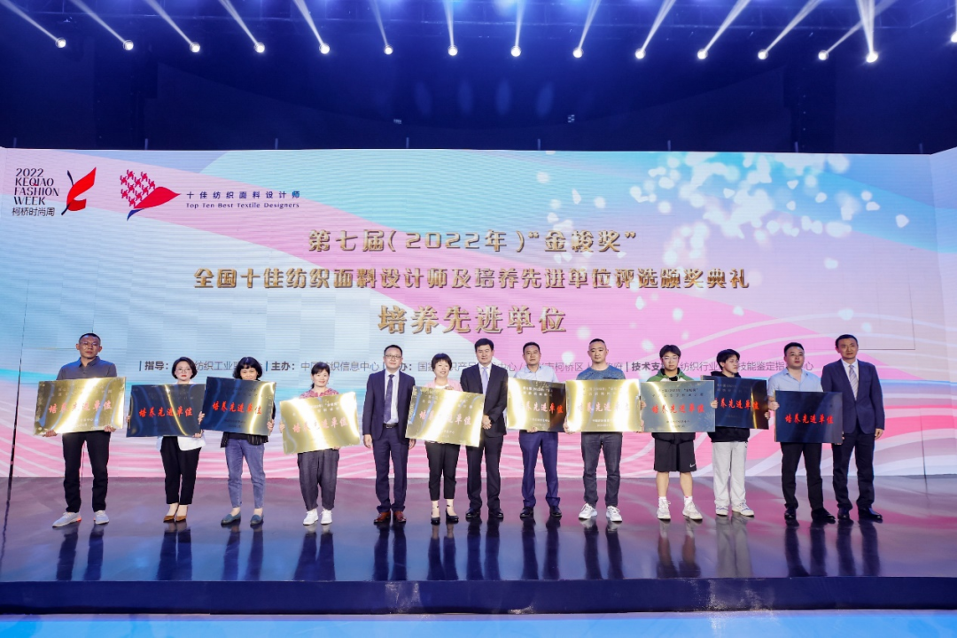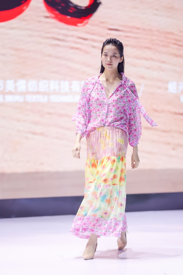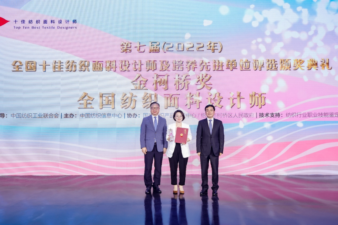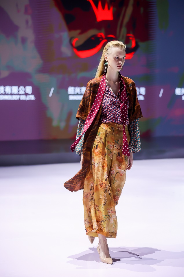 “活力之绿、自然之绿、生机之绿”。孙瑞哲在致辞中生动地诠释了柯桥“‘布’一样的绿”。他指出,坚实的产业基础、完备的产业体系、良好的政策环境赋予了柯桥纺织强大的韧性与活力。柯桥以“绿色高端,世界领先”为方向,走出了一条经济价值、社会价值、生态价值高度统一的产城融合之路,是新时期区域稳步推进共同富裕的标杆与旗帜。他还表示,希望柯桥以时尚周为契机,进一步推动产业链集成创新,以责任驱动发展,以创新赋能时尚,为经济发展、社会稳定、人民幸福做出更大贡献。第七届“金梭奖”颁奖典礼上颁发了全国纺织面料设计“金柯桥”奖、全国十佳纺织面料设计师、全国优秀纺织面料设计师、全国纺织面料设计师培养先进单位等大奖。本届评选吸引了来自98家企业的105位面料设计师参与,涌现出了一批在时尚创意、科技创新、绿色理念等方面具备综合实力的纺织面料设计师优秀人才。“金梭奖”评选自2010年举办,每两年一届,至今已为行业挖掘和培养了大批优秀纺织面料设计师。继2020年之后,“金梭奖”评选再度携手柯桥设立了全国纺织面料设计“金柯桥”奖1名,该奖项从“全国十佳纺织面料设计师”中产生,由全国前十强中综合得分第一名的设计师获得,每两年仅产生一位。本届“金柯桥”奖的获得者也是有史以来的第二位,为此格外引人关注。孙瑞哲、施惠芳在颁奖典礼上为“金柯桥”奖获得者山东如意科技集团有限公司技术开发部长、高级设计师张伟红颁发了荣誉证书。作为本届时尚周首场大秀,“中国纺织时尚趋势发布秀”汇聚了中国、法国、意大利的知名设计师和8家柯桥优秀面料企业,以服装设计创意和面料设计创意交汇的三大主题演绎了前瞻、前沿的设计理念和流行趋势风向。发布秀以既有传统风骨又不失现代风范的中西合璧艺术,诠释了柯桥时尚、中国流行、国际趋势融合的新定义,同时也彰显了柯桥纺织行业的时尚引领价值与社会责任担当。在充满浪漫情调的“以色彩缤纷和轻盈的方式奔赴夏季”发布秀中,法国Mathilde de Turckheim品牌创始人、国际知名品牌设计师Mathilide de Turckheim联袂浙江大树纺织科技有限公司、绍兴市美儒纺织科技有限公司、绍兴罗得纺织品有限公司三家企业共同带来了一股清新的夏日风。三家面料企业提供的醋酸、天丝、天然桑蚕丝、提花香芸纱等面料,质地透气轻盈,图案灵动饱满。设计师结合中国传统元素的各式图案以及企业上乘的面料,用清新的色调、简约的剪裁和拼接效果,呈现出季节交替的美妙心情以及与自然亲切相拥的美好生活。