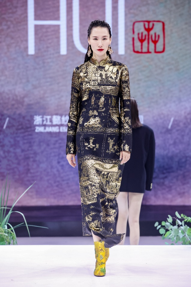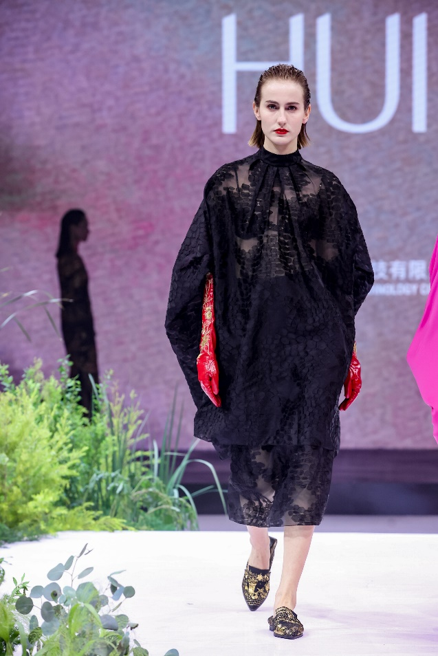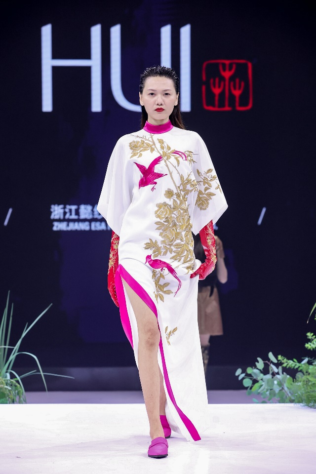 璀璨的中华文明是我国的文化瑰宝,同时也是纺织服装创意设计的灵感源泉与美学指引,这一点在“屏风之外”主题秀演中体现得淋漓尽致。金顶奖设计师、艺之卉时尚集团董事长兼首席设计师赵卉洲联合浙江懿纱纺织科技有限公司,以经典传承结合现代设计的手法赋予深刻的思想内涵,传达对女性自我意识觉醒的赞赏,致敬隐在屏风后的中国女性。赵卉洲采用懿纱纺织的高级套装刺绣面料,以宁静和谐的屏风意象,折射女性心理诉求,含蓄地表达中国女性骨子里那一份独有的精致、优雅与从容,以女性角度传承天人合一的中国美学,呈现大国设计品牌的包容与气度。