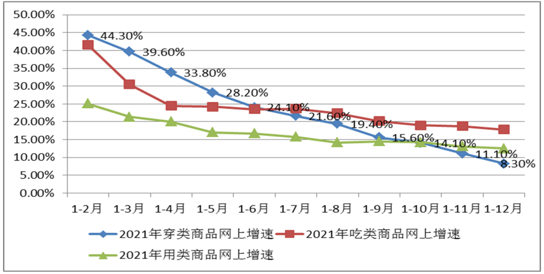 一是网络零售额增速持续收窄。2021年,全国实物商品网上零售额108042亿元,同比增长12.0%,占社会消费品零售总额比重为24.5%,占比较年初(1-2月)提高3.8个百分点。网络零售穿类商品最先复苏,随后增速持续收窄,全年穿类商品网上零售额增长速度为8.3%,低于全国实物商品零售额3.7个百分点。受新冠疫情持续影响,2021年中国服装市场B2C交易额较上年有较大幅度提升,预计增长10%至2.15万亿元左右,两年平均增长约8%,网购渗透率达到45%左右。