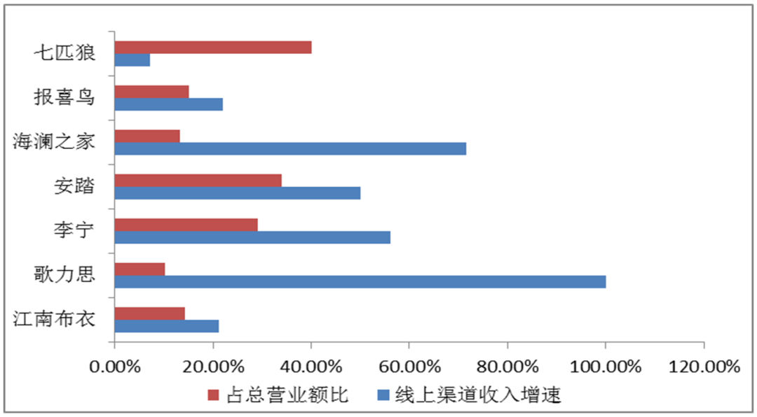 二是品牌服装线上贡献继续提升。安踏、李宁等传统运动品牌上半年线上渠道收入分别达到35.95亿元和29.67亿元,市场增速均超过50%,占总营业额比重分别提升至34%和29.1%,其中安踏运动多项业绩指标已超过阿迪达斯,前7个月在天猫平台销售额位居体育用品第一位。快时尚品牌全渠道销售格局相对稳定,前三季度太平鸟线上收入21.28亿元,同比增长27.53%,占总营业收入比重约30%,森马服饰线上收入占总营业收入比重约40%。传统男装品牌继续加强线上渠道建设,上半年海南之家线上收入增速达到71.55%,逐步扭转市场下滑颓势,占总营业收入比重提升至13.2%;报喜鸟线上收入同比增长22.0%,占总营收入比重为15.0%;七匹狼线上渠道收入增速较为平缓,占总营业额比重稳定在40%左右。传统女装品牌线上渠道全面发力,强化线上线下融合,上半年歌力思实现线上收入1.1亿元,江南布衣线上收入占总营业收入比重达40%。家居服品牌鸿兴股份自2011年建设电商渠道以来渠道体系更加成熟便捷,线上渠道(含天猫、唯品会、抖音等)收入总营业收入比重达到70%左右,前三季度实现营业收入8.15亿元,同比增长17.2%。