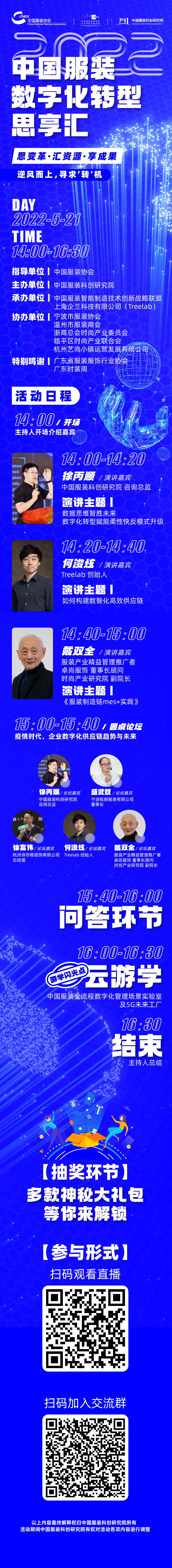 思变革、汇资源、享成果!中国服装数字化转型思享汇于5月21日线上开播,特邀中国服装科创研究院咨询总监徐丙顺、宁波铭朗服饰有限公司董事长盛武斌、Treelab创始人何浚炫、杭州诗亦格服饰有限公司总经理徐富伟、卓尚服饰董事长顾问戴双全等多位行业专家做客直播间,共同探讨服装行业数字化转型之变,通过数字赋能,推进和完善服装企业数字化建设路径。