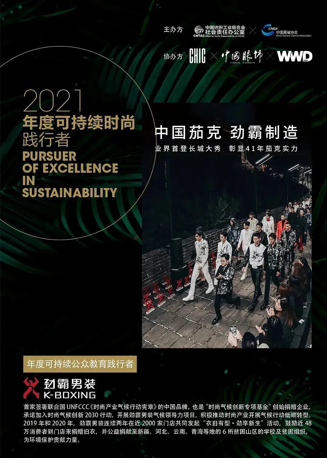 劲霸男装始终倡导和追求价值型的可持续时尚,通过设计、生产、零售、消费多维推动服装产业可持续发展,与上下游360°利益相关方共建对生态友好的可持续时尚未来。同时将可持续时尚生活方式传达给消费者,让践行可持续环保成为一种身份和品位的象征,一种价值型的消费理念,一种负责任的消费态度和主张,以此满足当下及未来“物有所值”到“物超所值”的演变。