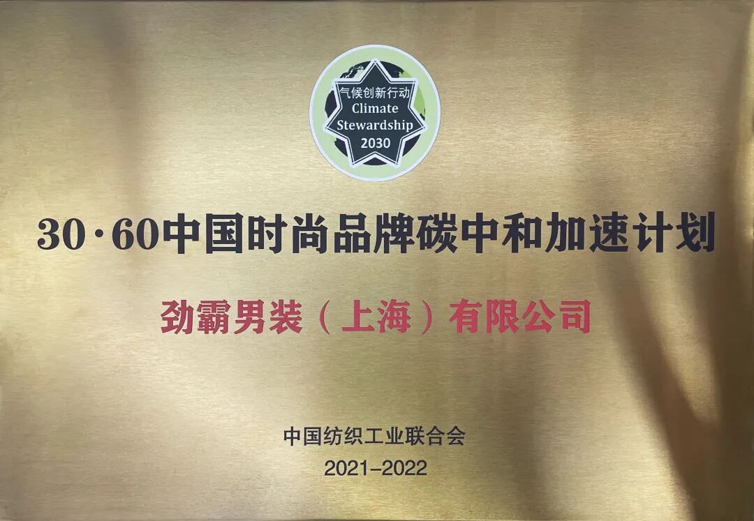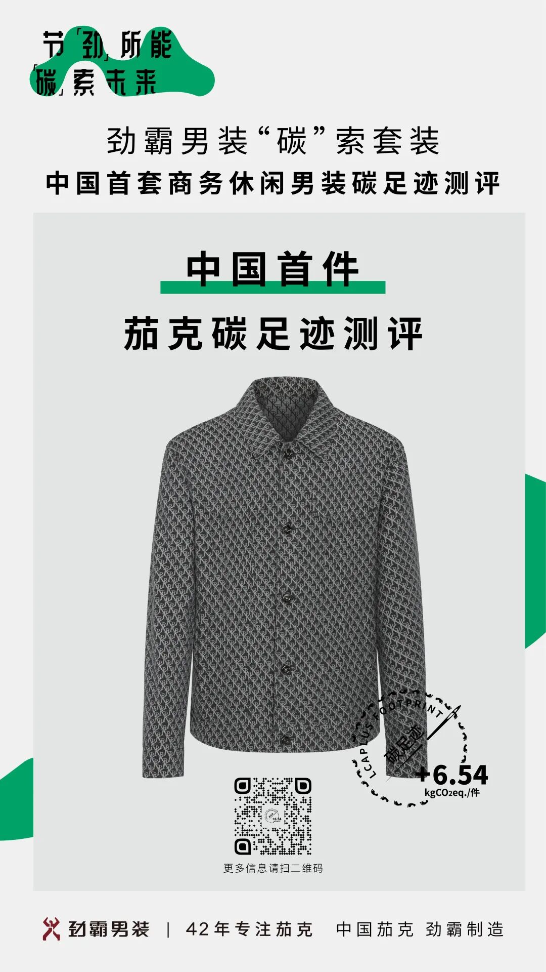 2021年12月,劲霸男装发布了中国首套商务休闲男装碳足迹测评——劲霸男装“碳”索套装及劲霸男装产品碳标签。消费者通过扫描服装吊牌上带有二维码的碳标签,即可追踪并实时查阅该产品的碳足迹,从原料的开采、加工到产品的制造生命周期碳足迹一目了然,引领消费者开启全新可持续时尚生活方式。劲霸男装同时发布了“碳排放基线”(温室气体排放数据),且劲霸男装是在中国较完整地计算了范围一、二、三碳排放量的消费品企业。