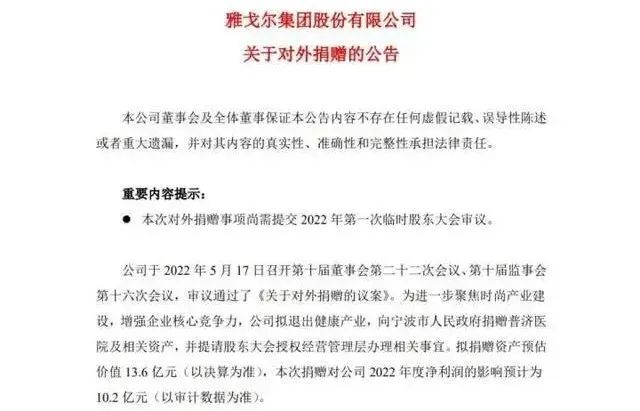 5月17日晚,中国服装协会副会长单位——雅戈尔集团股份有限公司发布关于对外捐赠的公告,公司于5月17日召开第十届董事会第二十二次会议、第十届监事会第十六次会议,审议通过了《关于对外捐赠的议案》。公告表示,为进一步聚焦时尚产业建设,增强企业核心竞争力,公司拟退出健康产业,向宁波市人民政府捐赠普济医院及相关资产,并提请股东大会授权经营管理层办理相关事宜,拟捐赠资产预估价值13.6亿元。