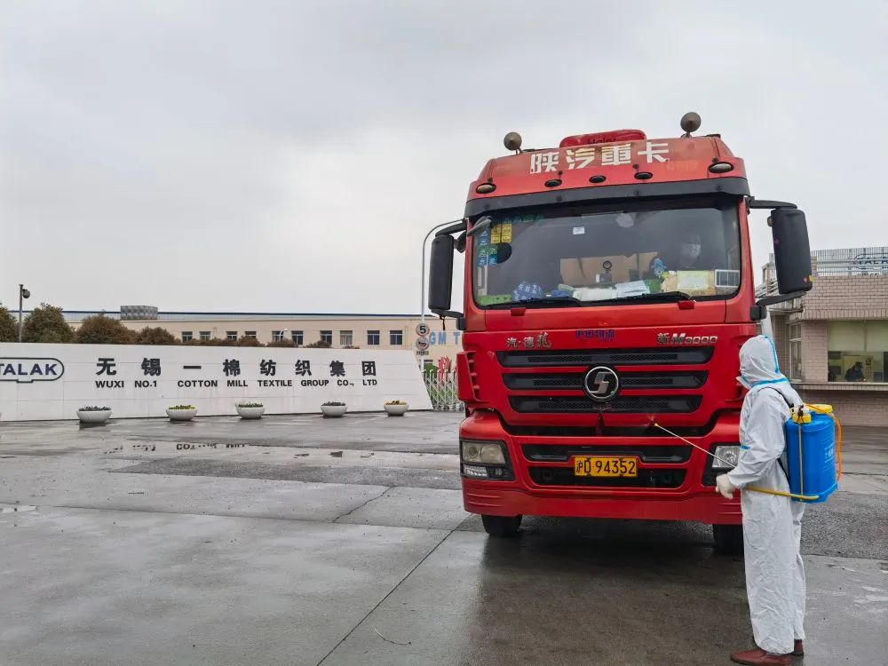 无锡一棉纺织集团工作人员在对货运车辆进行消杀。(受访者供图)
