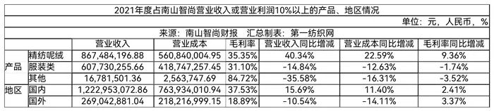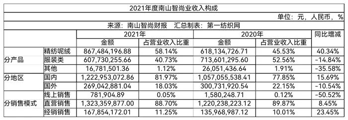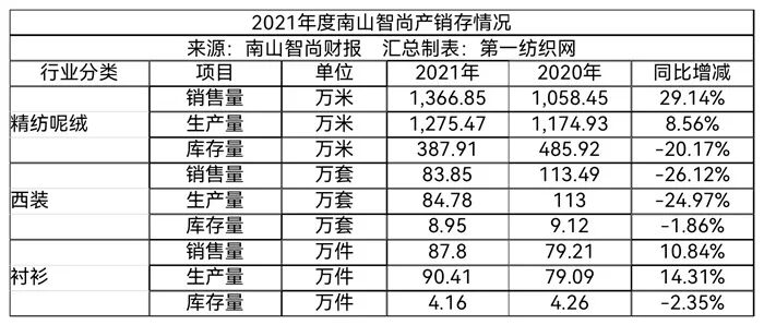 等境内外多家服装品牌商建立了战略合作关系;在职业装客户上,公司为国内金融、通信、电力等企业及军需总后、公检法司、工商税务等部门定点合作单位,此外,公司还拥有定制体验店以及覆盖全国的营销团队,营销渠道强大、获客能力强。财报显示,2021年度,南山智尚实现营业收入14.91亿元,较上年同期增长9.88%,其中,精纺呢绒收入8.67亿元,占比58.14%,服装类收入6.07亿元,占比40.73%;实现归属于上市公司股东净利润1.52亿元,较上年同期增长74.17%。对于业绩变动的原因,南山智尚解释称,一是2021年疫情好转,纺织行业积极复苏,公司精纺呢绒收入和销量不断攀升,精纺呢绒营业收入较上年同比增长40.34%,销售量较上年同比增长29.14%,二是公司在疫情后核心竞争力的突出表现,使得精纺呢绒毛利率大幅增长,精纺呢绒毛利率较上年同期增长9.36%。企业在注重面料新功能研发的同时,也注重通过工艺的改进,扩大产品在服用性能方面的优势,提高高附加值产品占比,不断提高综合毛利率。2022年,南山智尚计划在做强、做精男正装品种的同时,丰富企业产品结构,加大开发女装面料市场。借助目前日益繁盛的高端女装市场对高品质羊毛产品激增的市场需求,公司依托纱染、匹染的技术优势,通过提供色彩丰富、品质高端、交期快速的特色产品及服务,提升市场竞争力,打造高端时尚女装。最新财报显示,2022年一季度,南山智尚实现营业收入3.22亿元,实现归属于上市公司股东的净利润2826.95万元,分别同比增长8.03%和17.71%。