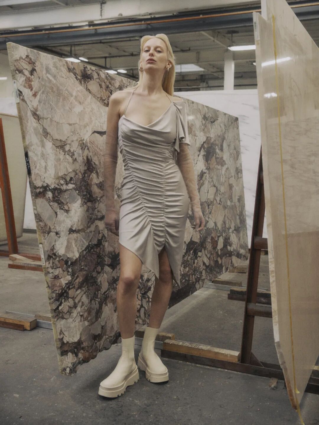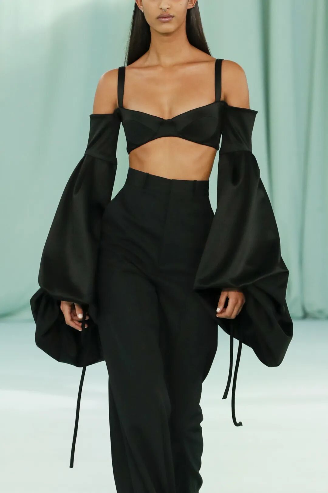 使用可调节细节,飘逸宽衣袖适合打造立体版型;具有#SoftVolume柔和量感的面料适合打造吸睛晚礼服,请参考Del Core的设计。