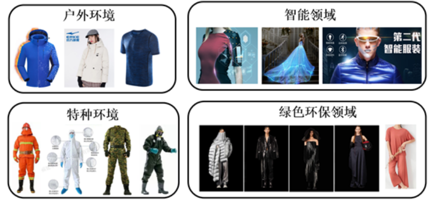 在进行创新的过程中,需要重点关注其造型特征、外观特征和服用性等基本特征。基于使用人群和适用环境,对服装材料提出了新的需求,具体表现在户外环境的应用、特殊环境中的应用、智能领域的应用、绿色环保领域的应用等方面。