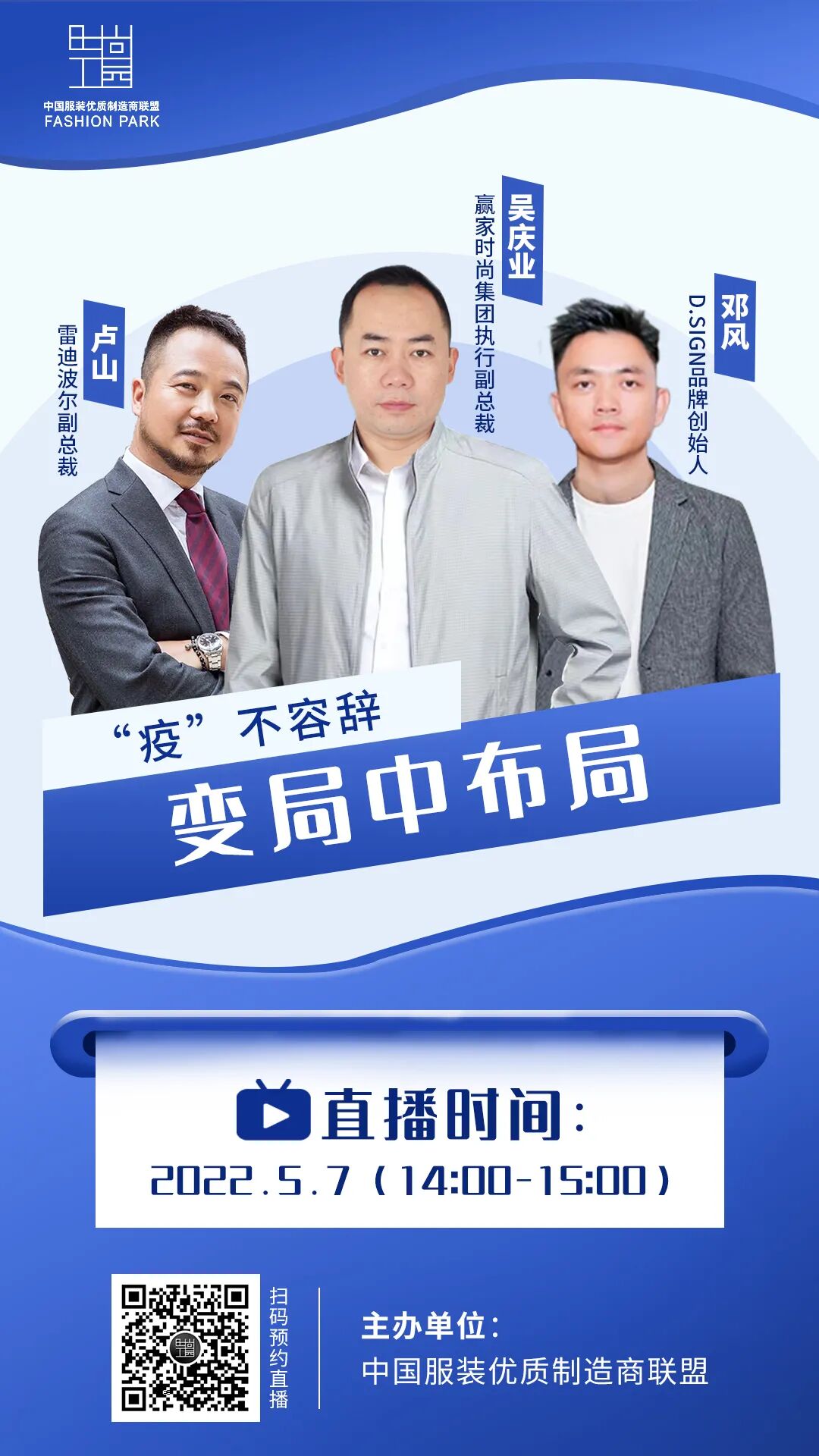当下,中国服装行业正面临综合成本上升,全球疫情蔓延,以及国际贸易争端频发等复杂多变的生存环境。面对新形势,有人选择“躺平”,也有人化“危”为“机”,在变局中布新局。为更好的认清当前新形势,推动中国服装产业新变革,重塑品牌竞争新优势,中国服装优质制造商联盟特邀请国内优秀品牌企业家共同以“变局中布局”为主题,通过线上直播的形式展开分享与讨论,以期让更多行业人士在混沌中看清前路,在激荡中寻找机会,在变局中谋新局!