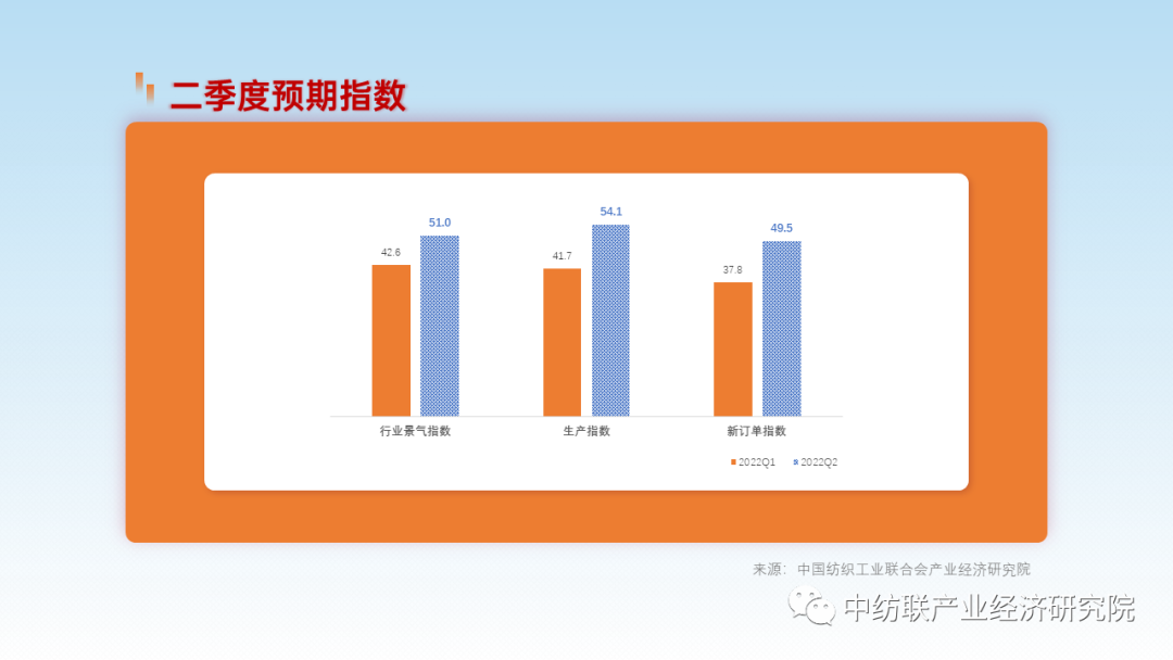 截至4月15日参与一季度纺织景气问卷调查的企业中,70%的企业选择二季度行业运行“乐观”或“一般”。据测算,二季度纺织行业预期景气指数为51.0,景气指数或将重回发展区间。
