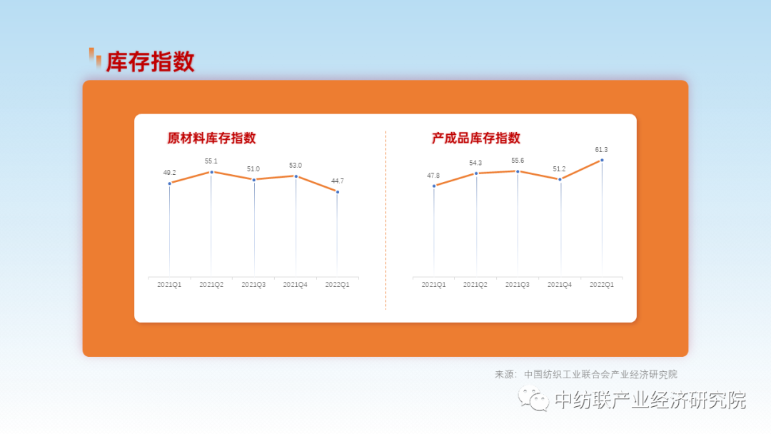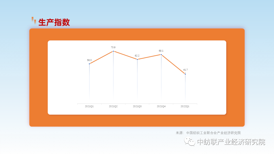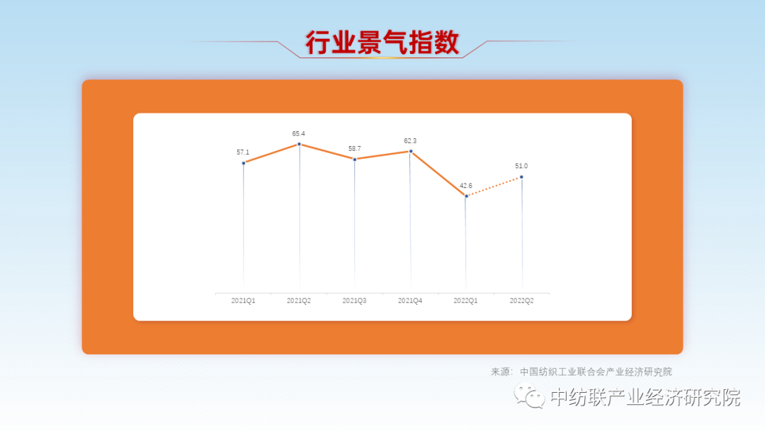 2022年以来,地缘政治危机减缓全球经济复苏进程,国内疫情多点散发、物流运输受限、原料价格上涨等因素增加行业运行发展压力。近期,中国纺联组织了纺织企业景气调查工作。据测算,2022年一季度我国纺织行业综合景气指数落到趋冷区间,仅为42.6,较上年四季度回落19.7个点。尽管目前来看一季度纺织企业运行承压较大,但在国内疫情精准防控措施持续推进、稳增长经济政策有效落实等因素的共同作用下,企业对二季度行业运行仍较有信心,行业景气指数或重回发展区间。2022年以来,国内疫情多地散点爆发,各地实施防控措施,货物流通受阻,原料难进入生产环节,成品难抵达消费终端,从而影响部分企业的正常生产经营。据调查,81.1%的企业表示因物流受阻而发/到货时间有所延迟;甚至有3.2%的企业表示因物流受阻而导致订单取消。尤其是东部地区企业因物流受阻导致发/到货延迟的比重高达83.0%。受上述因素影响,2022年一季度,我国纺织行业生产指数为41.7,较上年四季度指数深度下降27.3个点,落入荣枯线以下。一方面,国内各地为遏制疫情蔓延扩散积极采取相关措施,浙江、山东、辽宁、广东等多地纺织服装专业市场暂时休市,市场销售明显减少;另一方面,疫情多点爆发也严重抑制了国内居民对纺织服装产品的消费意愿。据国家统计局数据,2022年一季度,我国居民消费支出中衣着类支出仅占7.1%,是近年来同期的最低水平。另据调查,有36.7%的企业认为“国内订单不足”是影响企业经营的第一问题。受需求不足影响,一季度行业新订单指数回落较快。据测算,2022年一季度,我国纺织行业新订单指数为37.8,较上年四季度指数下降29.0个点,回落非常明显。近期,物流受阻叠加原料价格上涨等因素,纺织企业采购原料谨慎,主要以消耗库存原料为主。据测算,2022年一季度,纺织行业原材料库存指数为44.7,较上年四季度指数下降8.3个点。同时,受市场需求不足、物流受阻、部分市场关闭等因素影响,企业产品销售不畅,产成品库存有所上升。据测算,一季度纺织行业产成品库存指数达61.3,较上年四季度增加10.1个点。