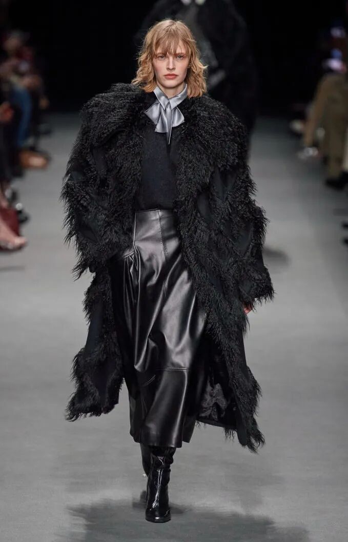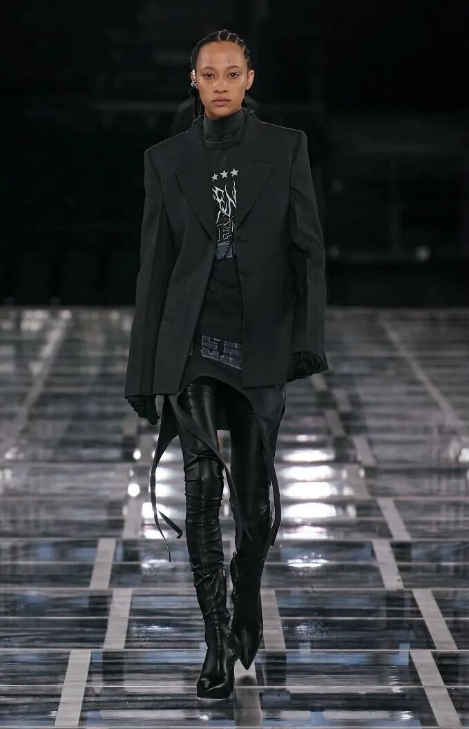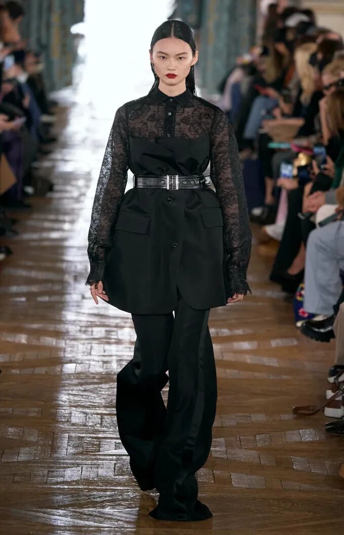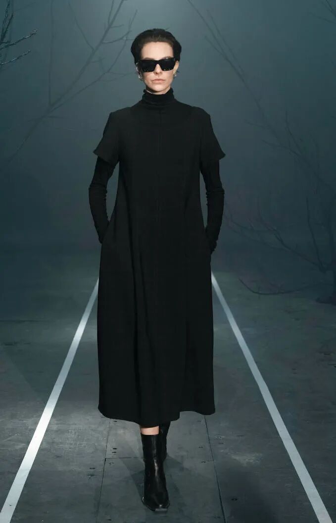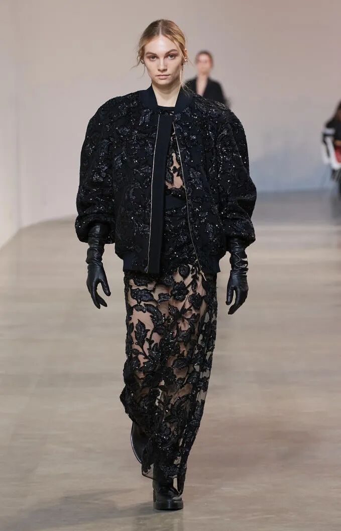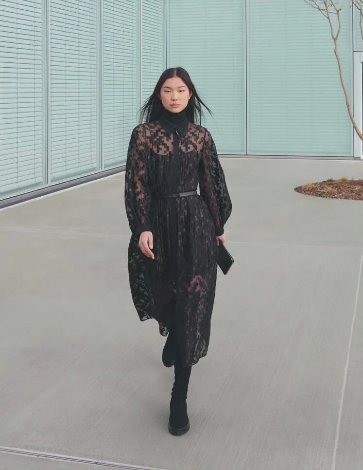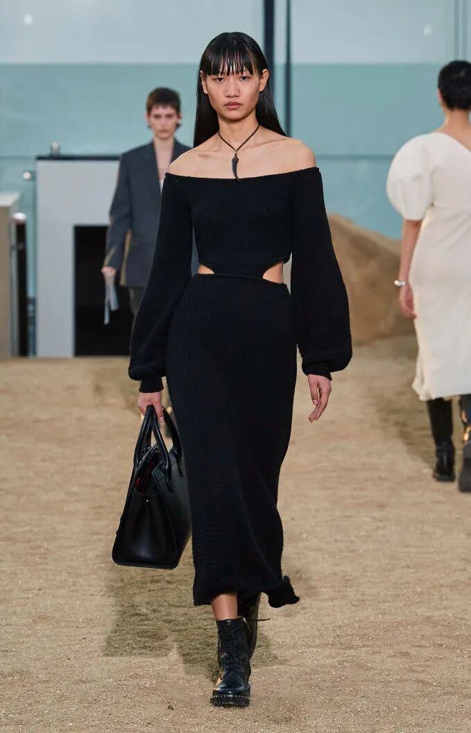 简单的黑色调可以搭配薄纱、蕾丝和高光泽面料,黑配黑的层搭设计则有助于塑造立体感外观。鞋品方面,黑色调适用于实用靴款。