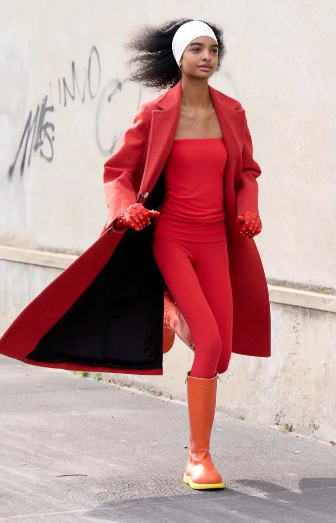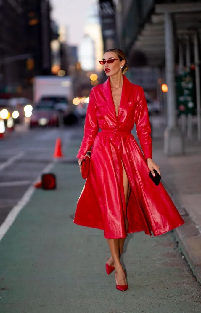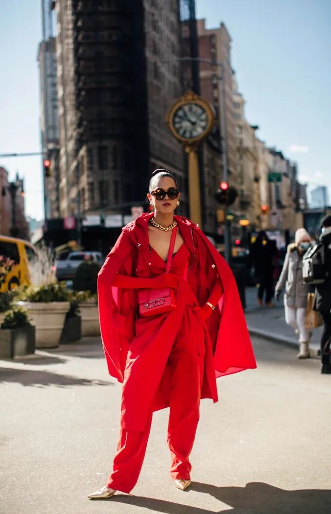一身红极为抢眼,可以尝试这种氛围感穿搭,适当露肤会减少红色的压迫感。红色可以搭配卡其、驼色、牛仔蓝等。