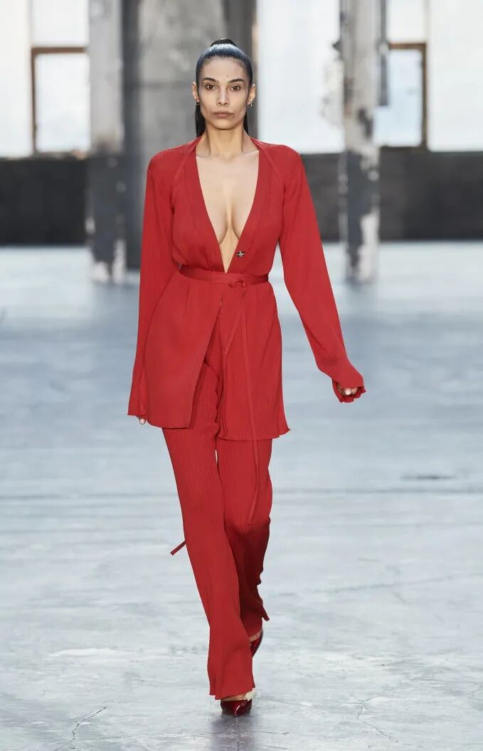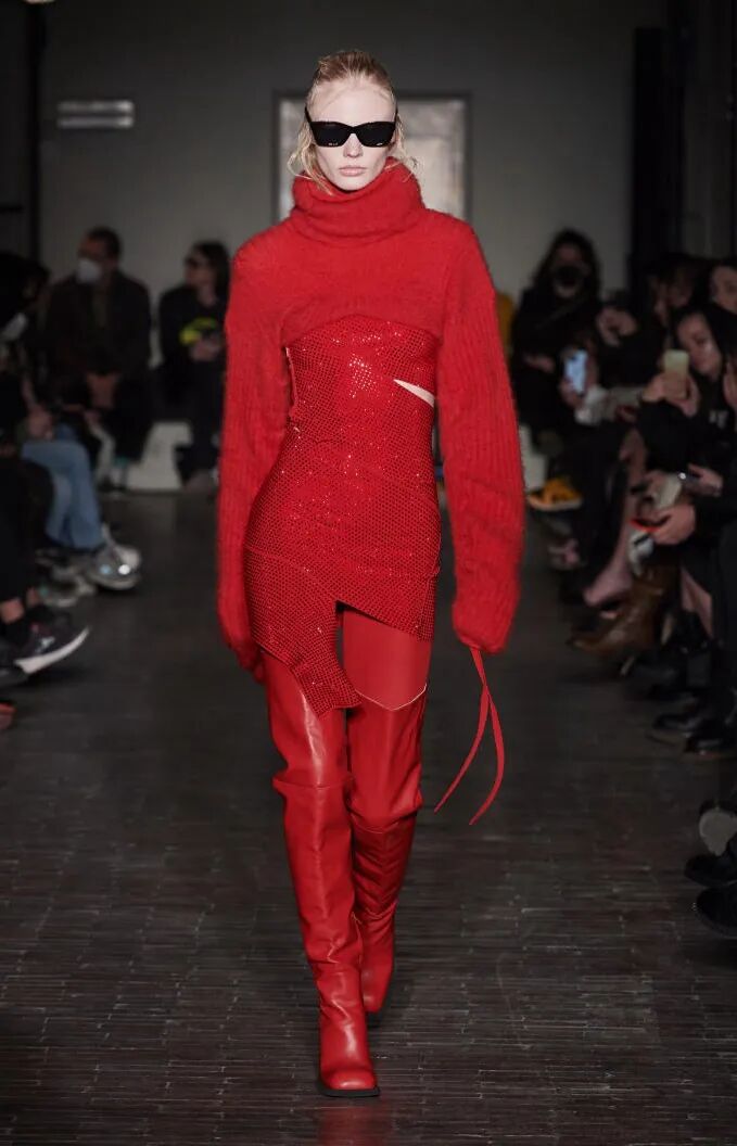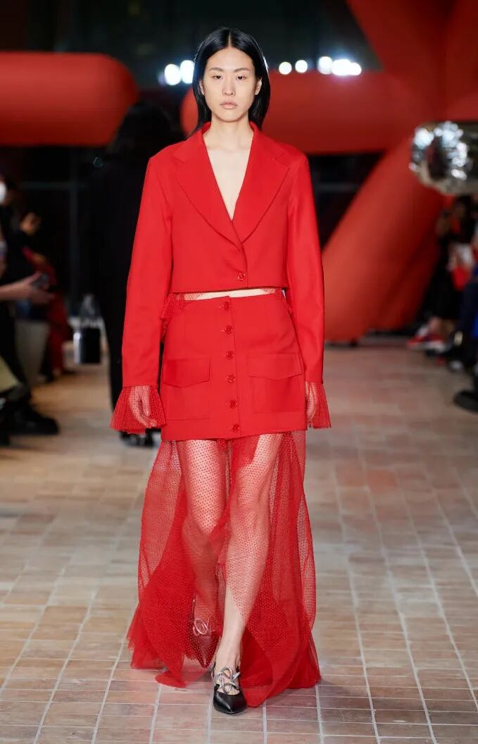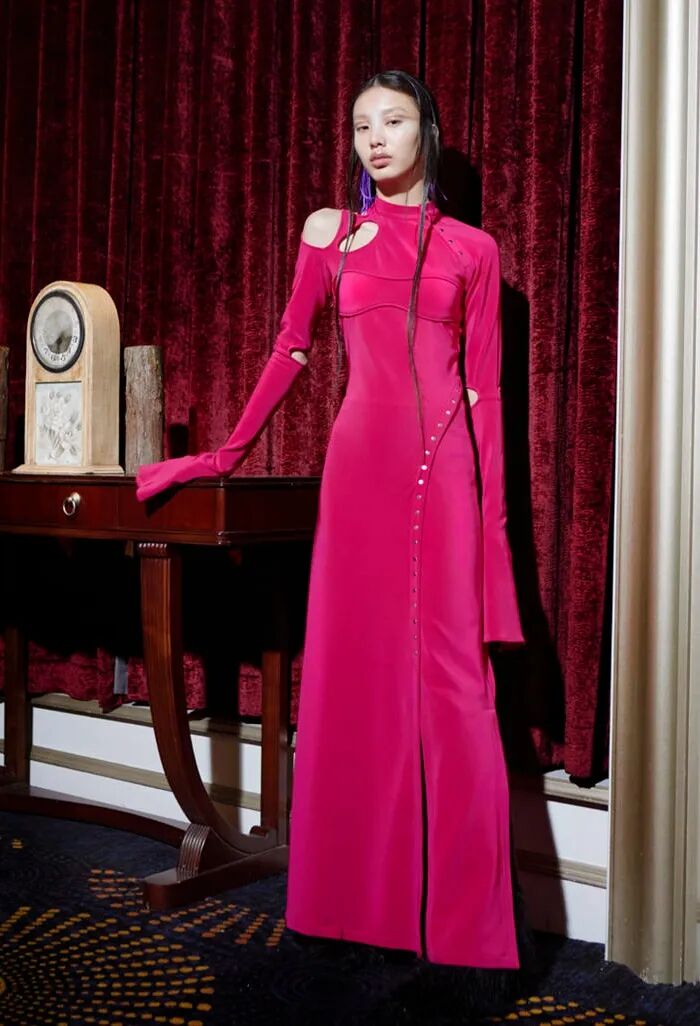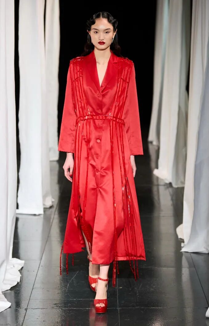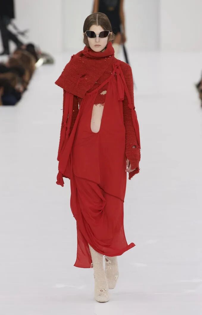 打造从头到脚的全身造型,尽显视觉冲击力。使用魅惑红代替黑色,并搭配紧身廓形、层次感薄纱和露肤挖空设计,以此呼应颠覆性感趋势。