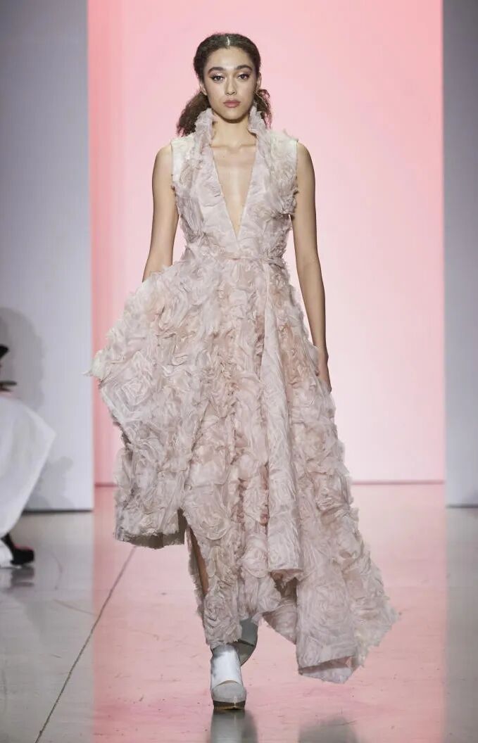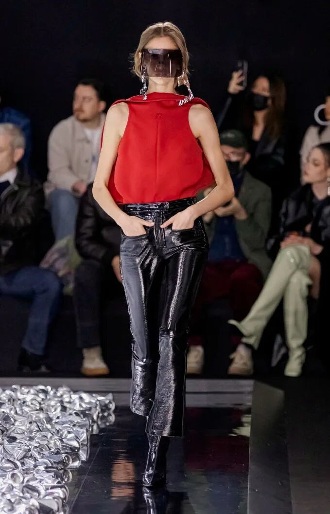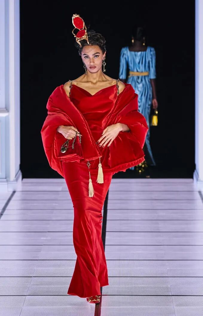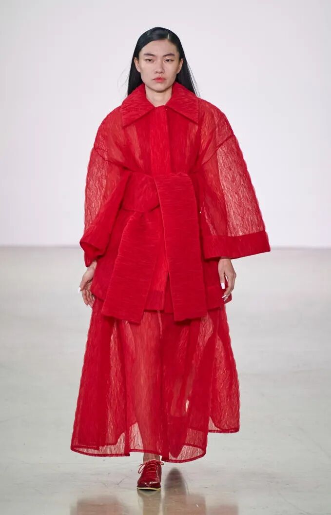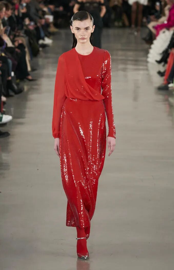 打造从头到脚的全身造型,尽显视觉冲击力。使用魅惑红代替黑色,并搭配紧身廓形、层次感薄纱和露肤挖空设计,以此呼应颠覆性感趋势。